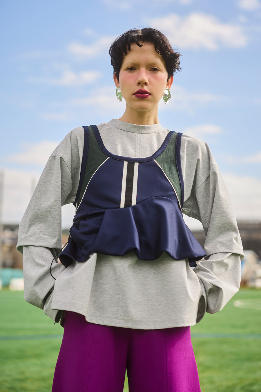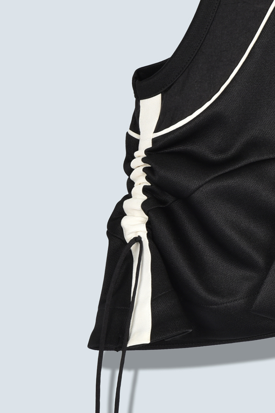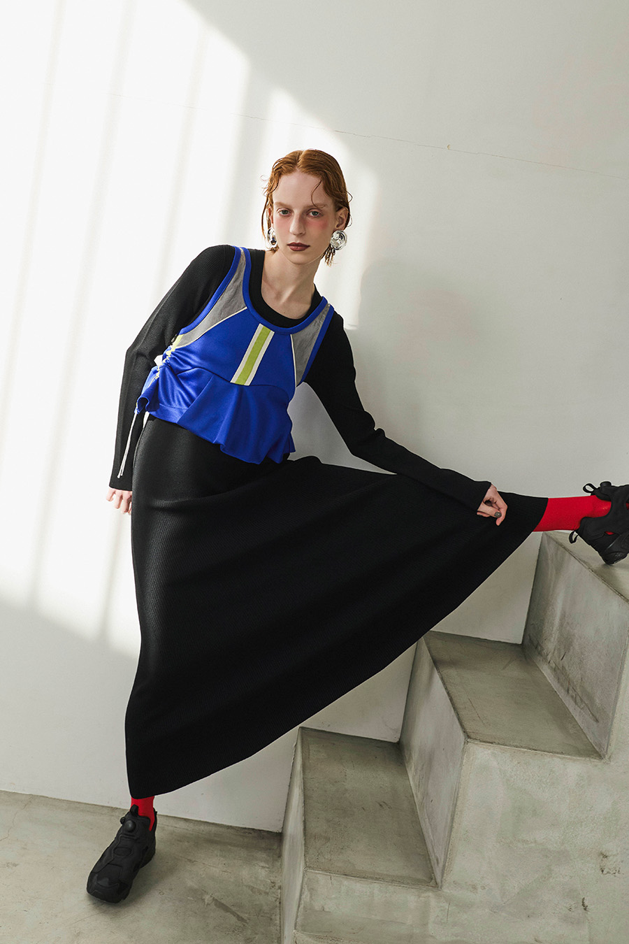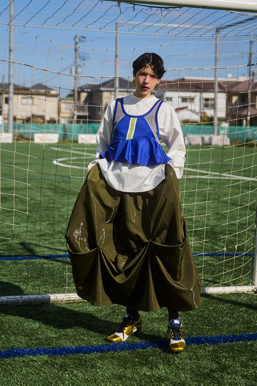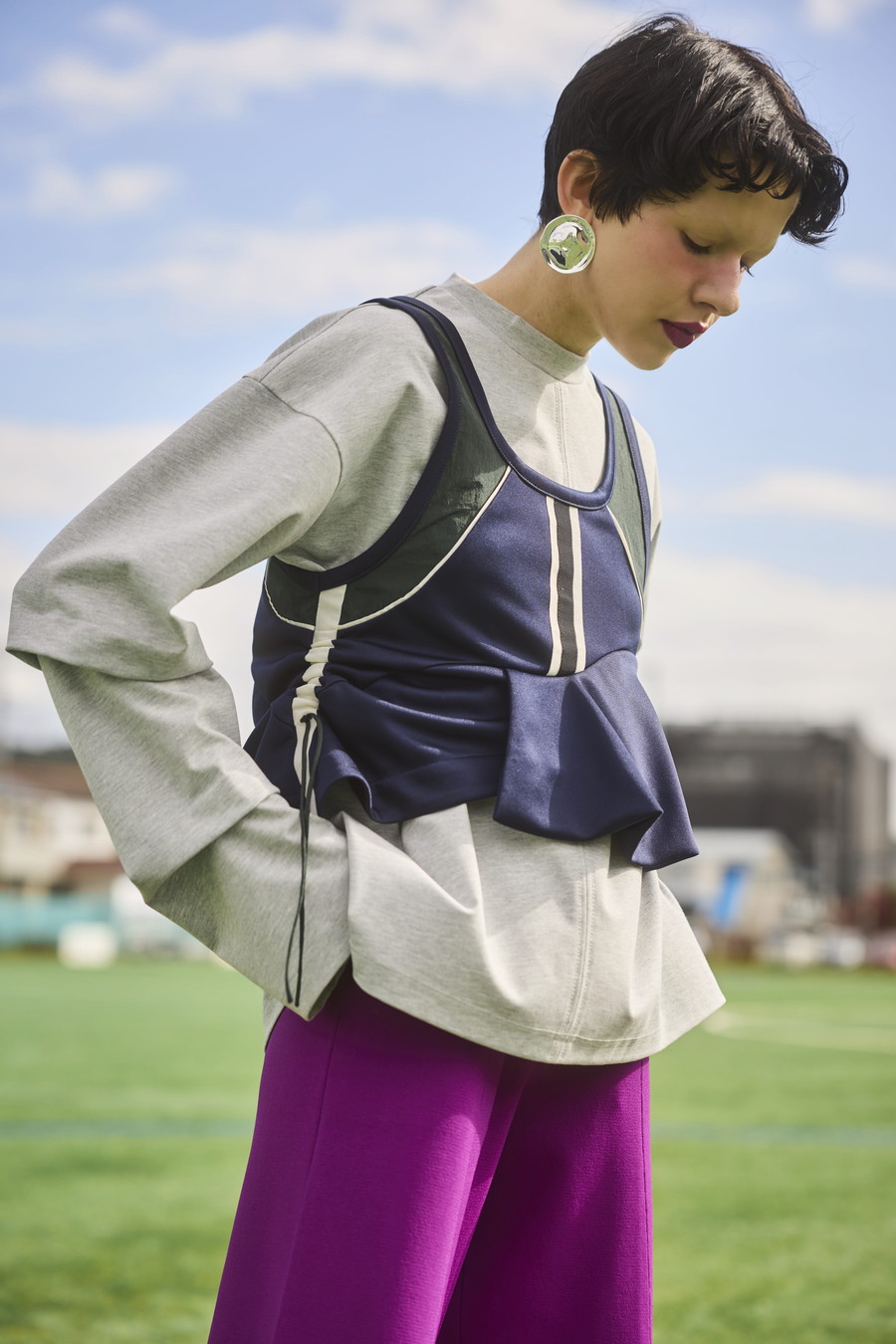 スポーティなトラックデザインを女性らしいギャザーフレアーデザインに落とし込んだタンク型ビスチェトップス。程良い伸縮性を兼ね備えたスポーツジャージ素材を使用しています。背中とアームホールを大きめに開けている為、オーバーサイズシャツやカットソー、ワンピースなど幅広いアイテムとのレイヤードを楽しんでいただける今シーズンイチオシのシリーズです。