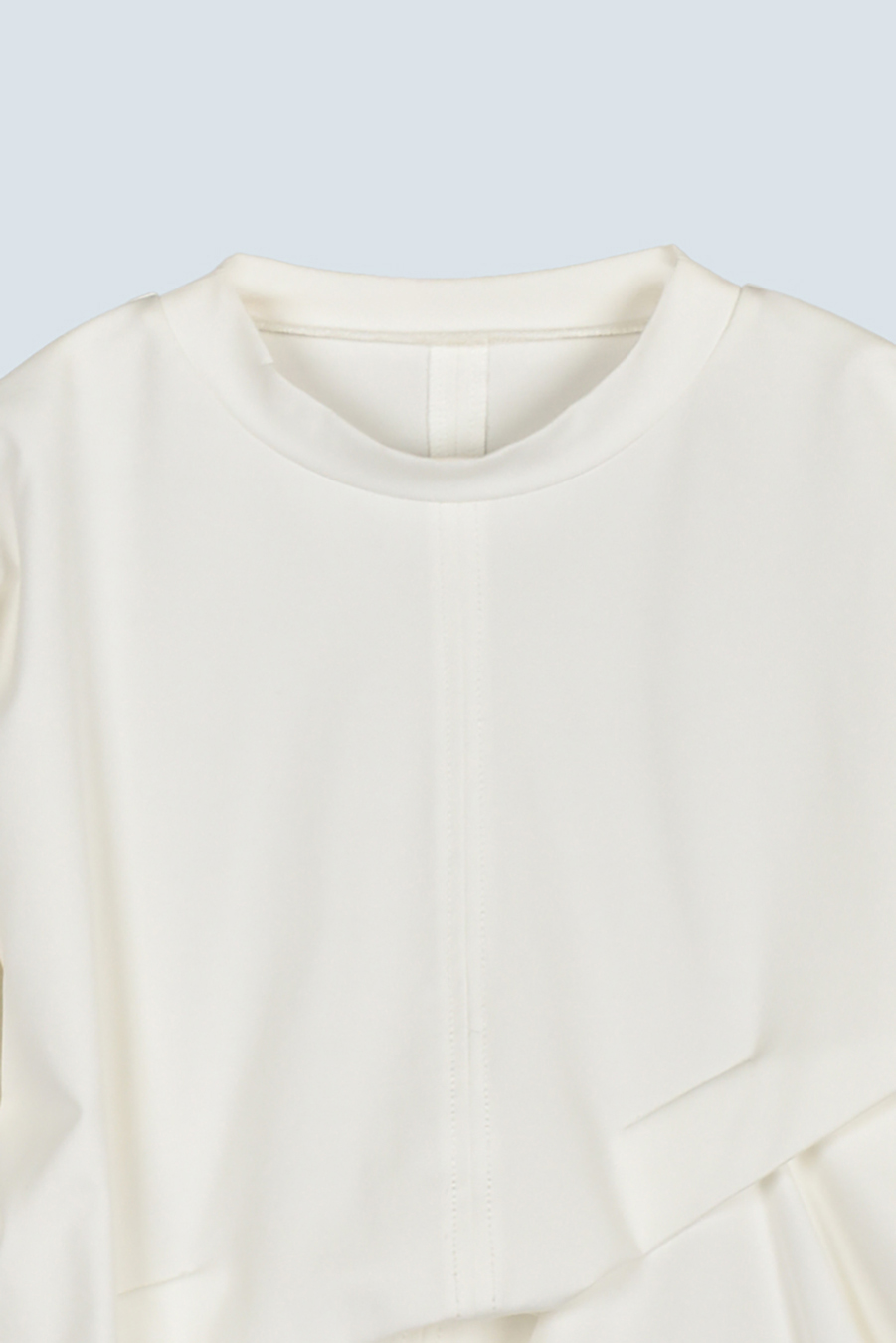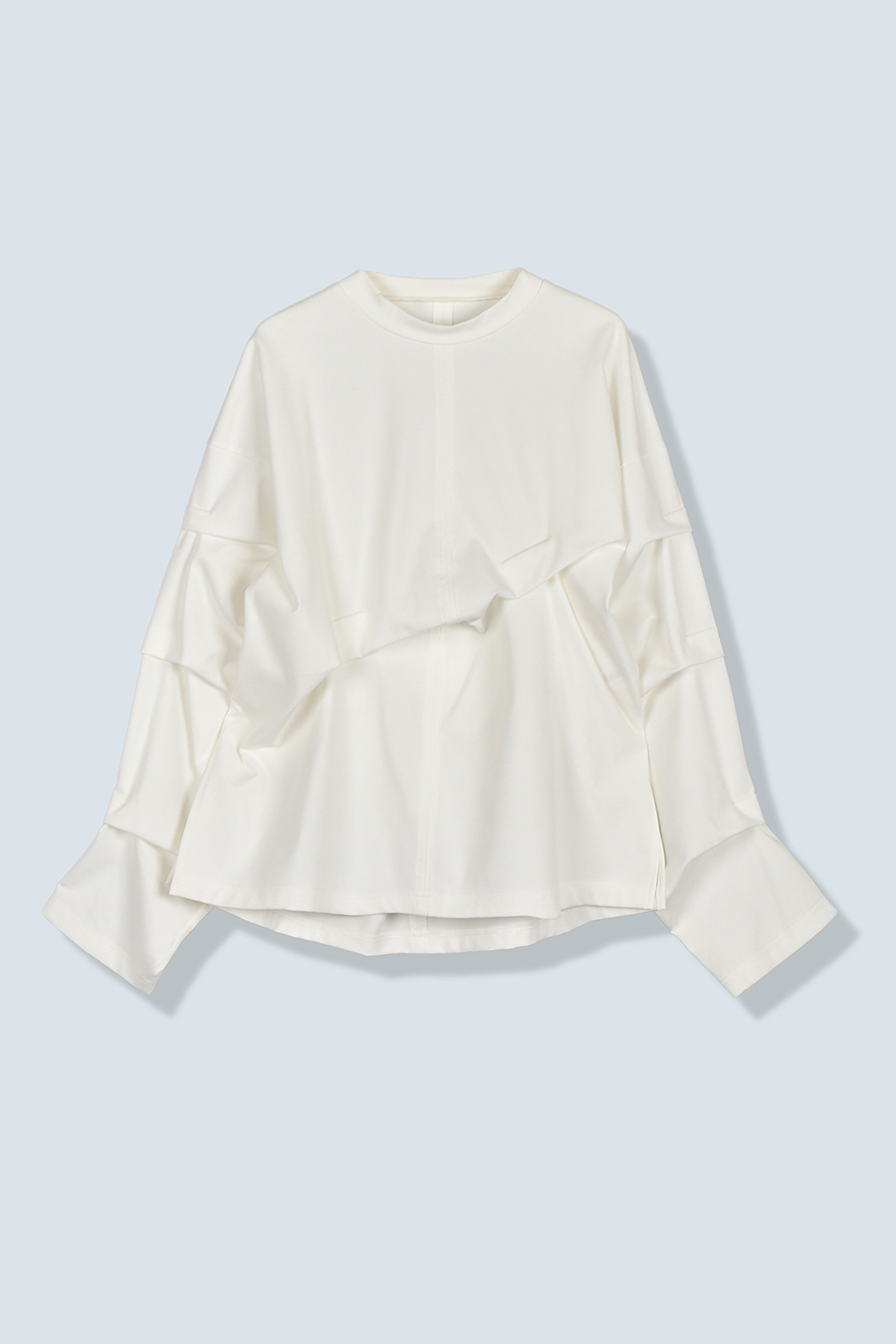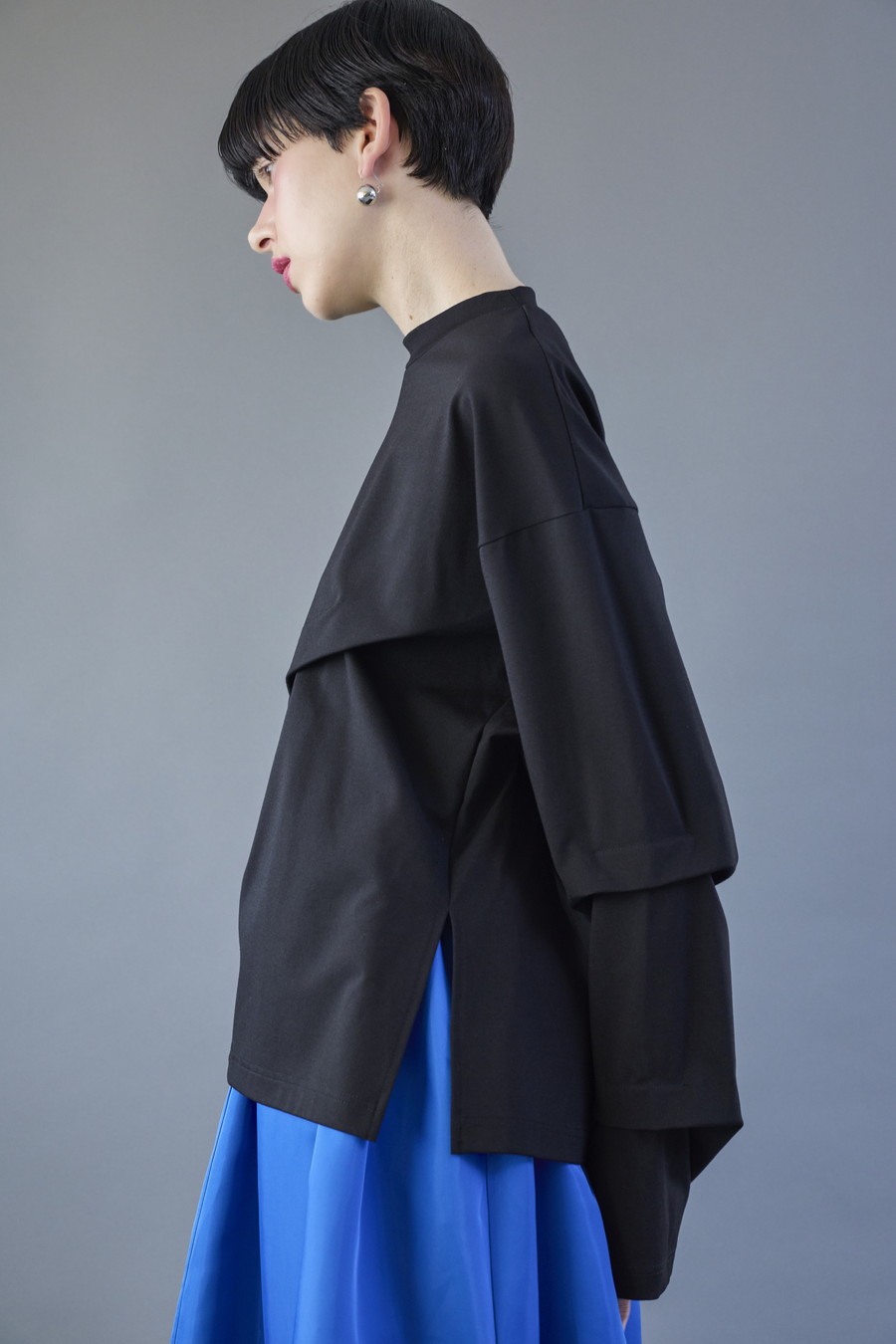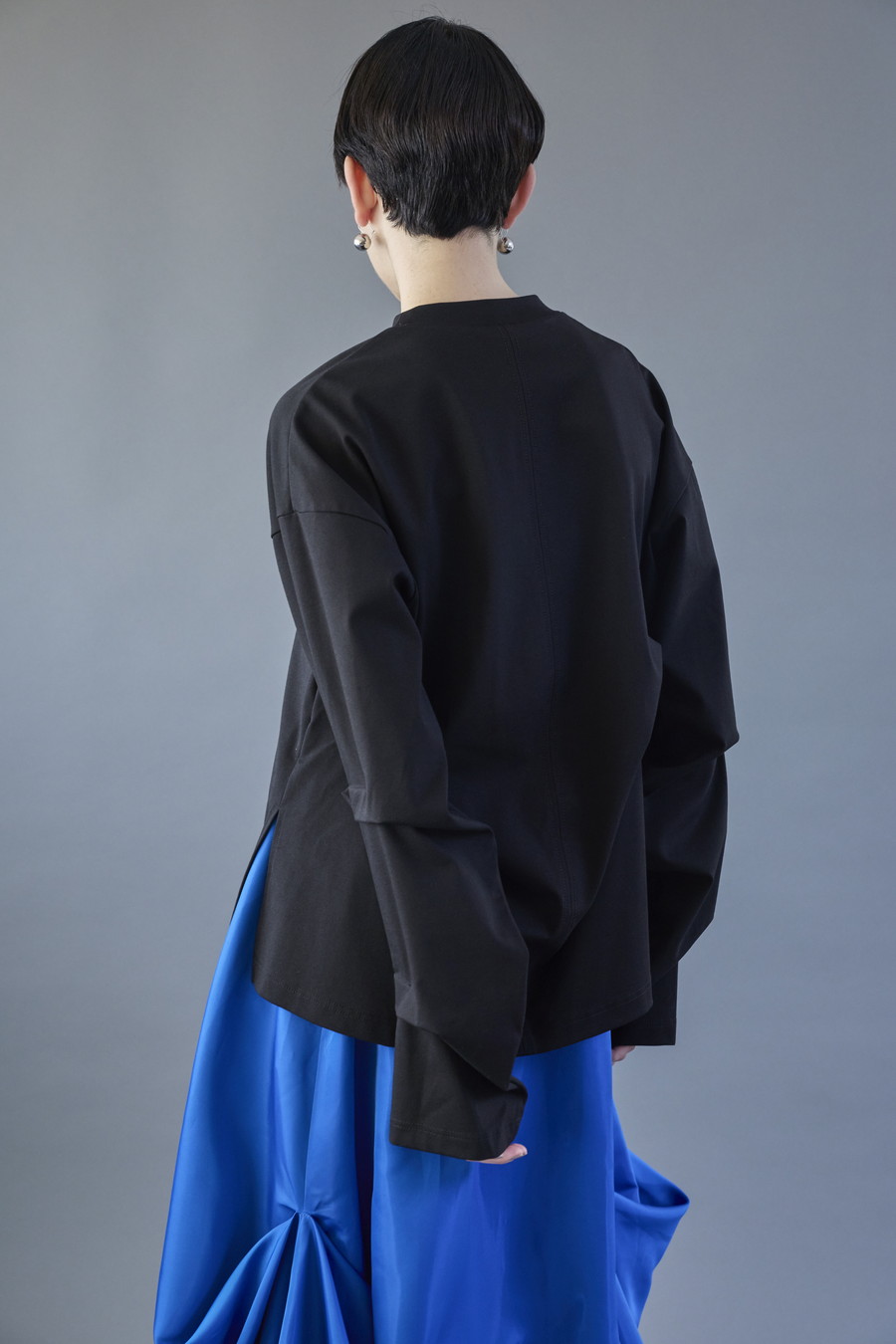 大胆なタックディテールで構築的なフォルムに仕上げたロングTシャツ。張りのある厚地のカットソーを使用しており、着やすさと合わせやすさを兼ね備えたデザイン。