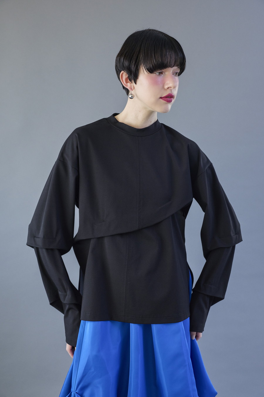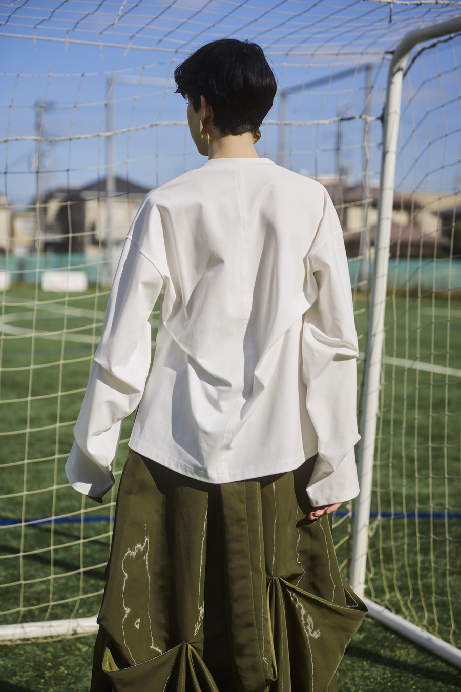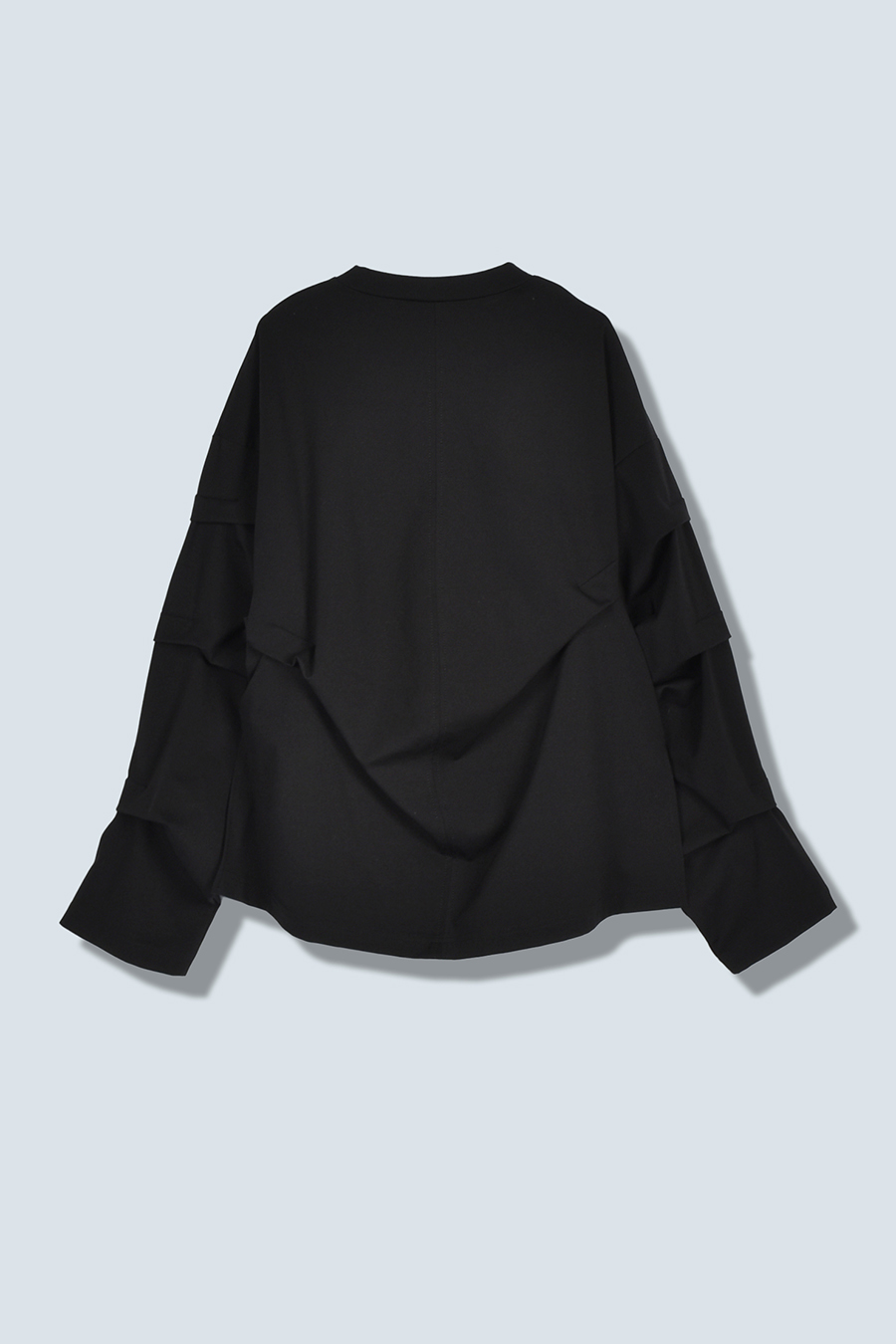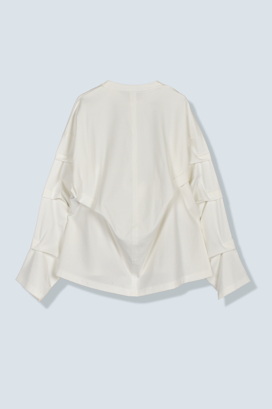 大胆なタックディテールで構築的なフォルムに仕上げたロングTシャツ。張りのある厚地のカットソーを使用しており、着やすさと合わせやすさを兼ね備えたデザイン。