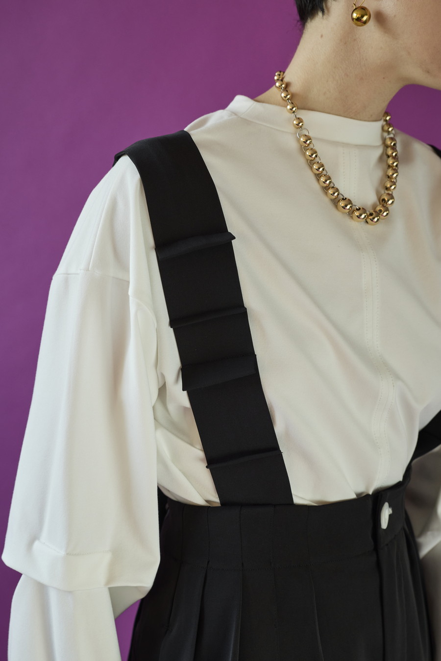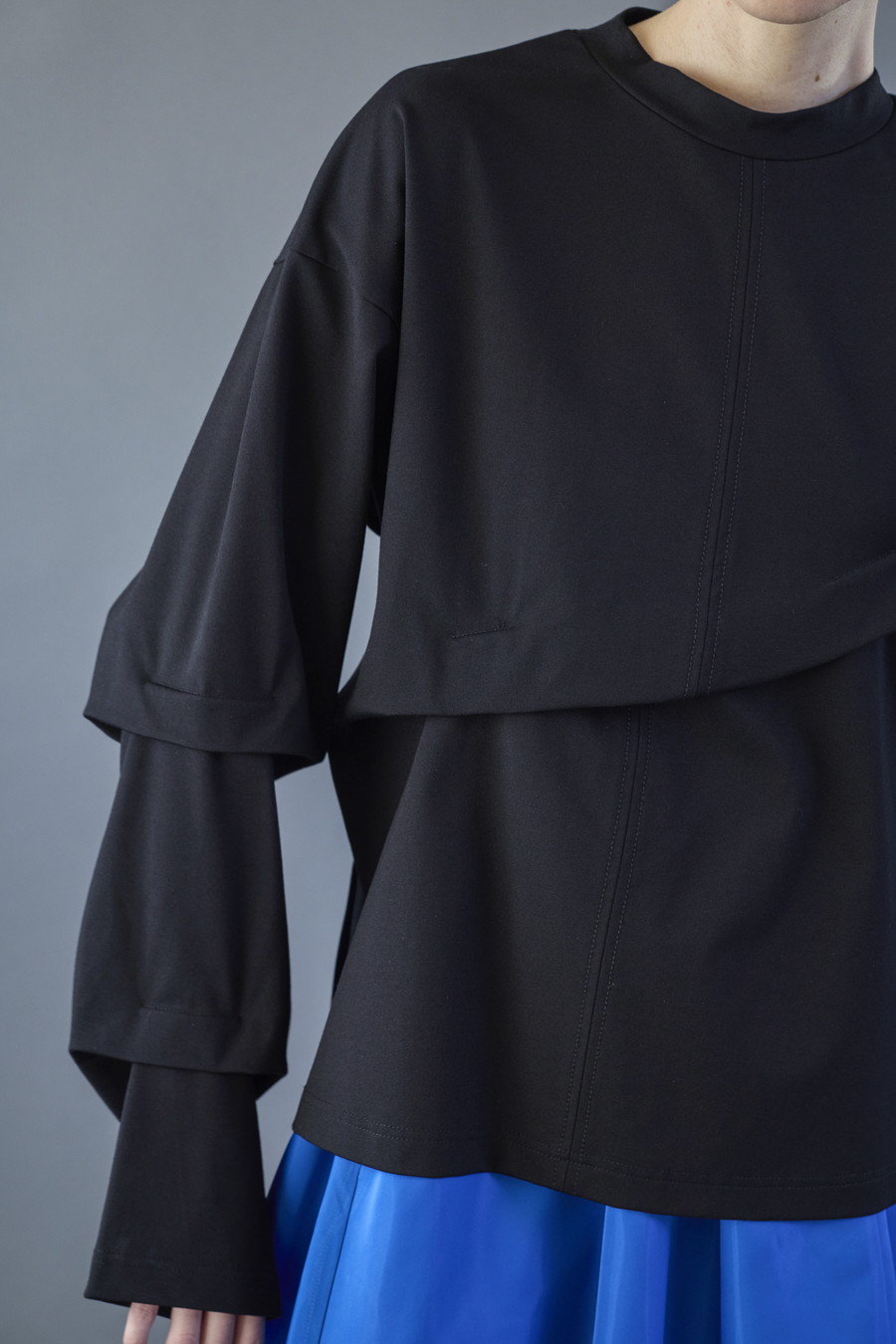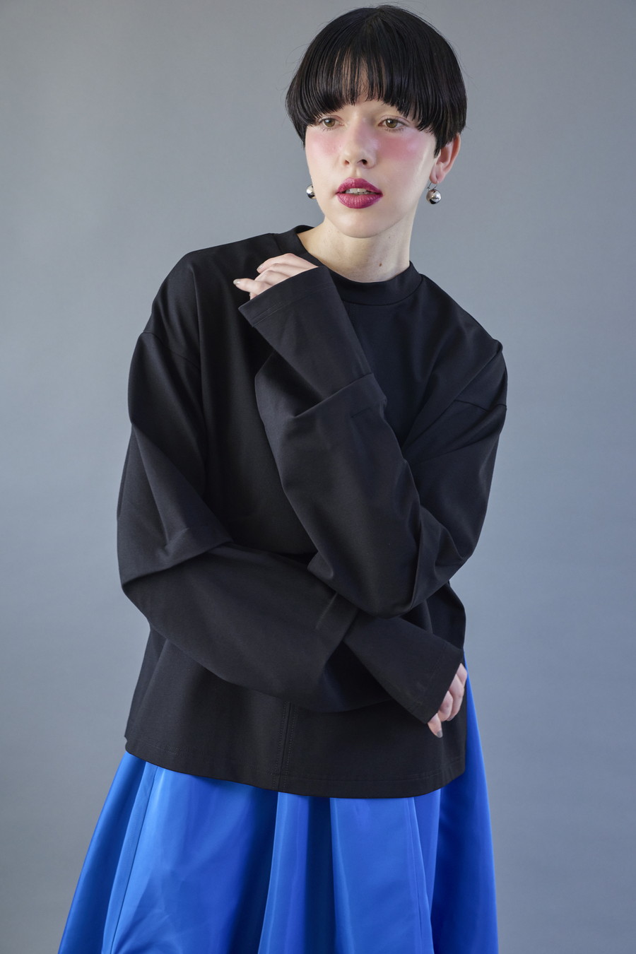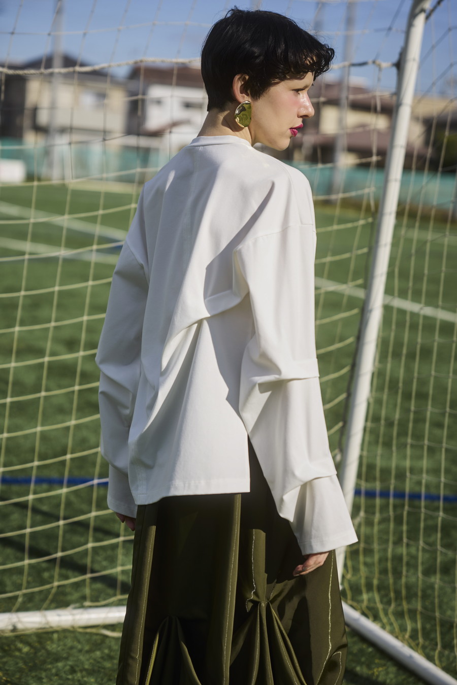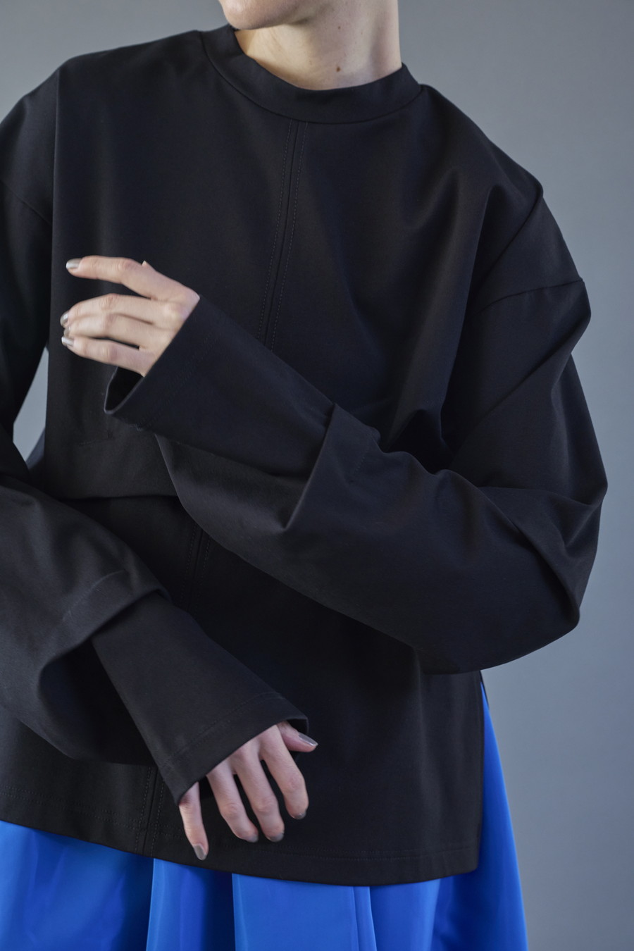 大胆なタックディテールで構築的なフォルムに仕上げたロングTシャツ。張りのある厚地のカットソーを使用しており、着やすさと合わせやすさを兼ね備えたデザイン。