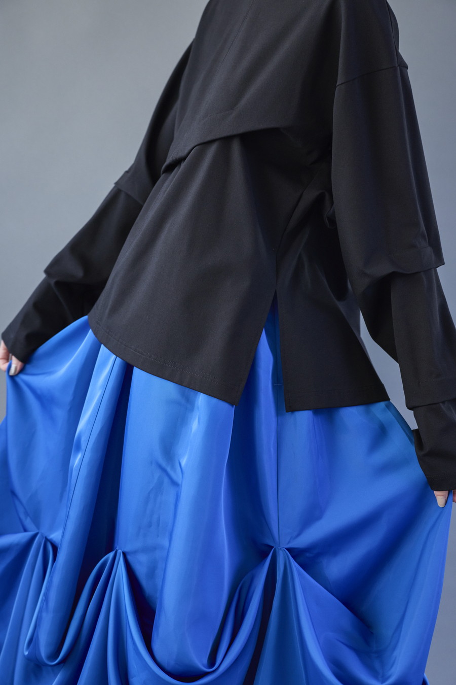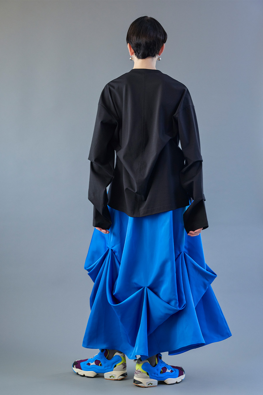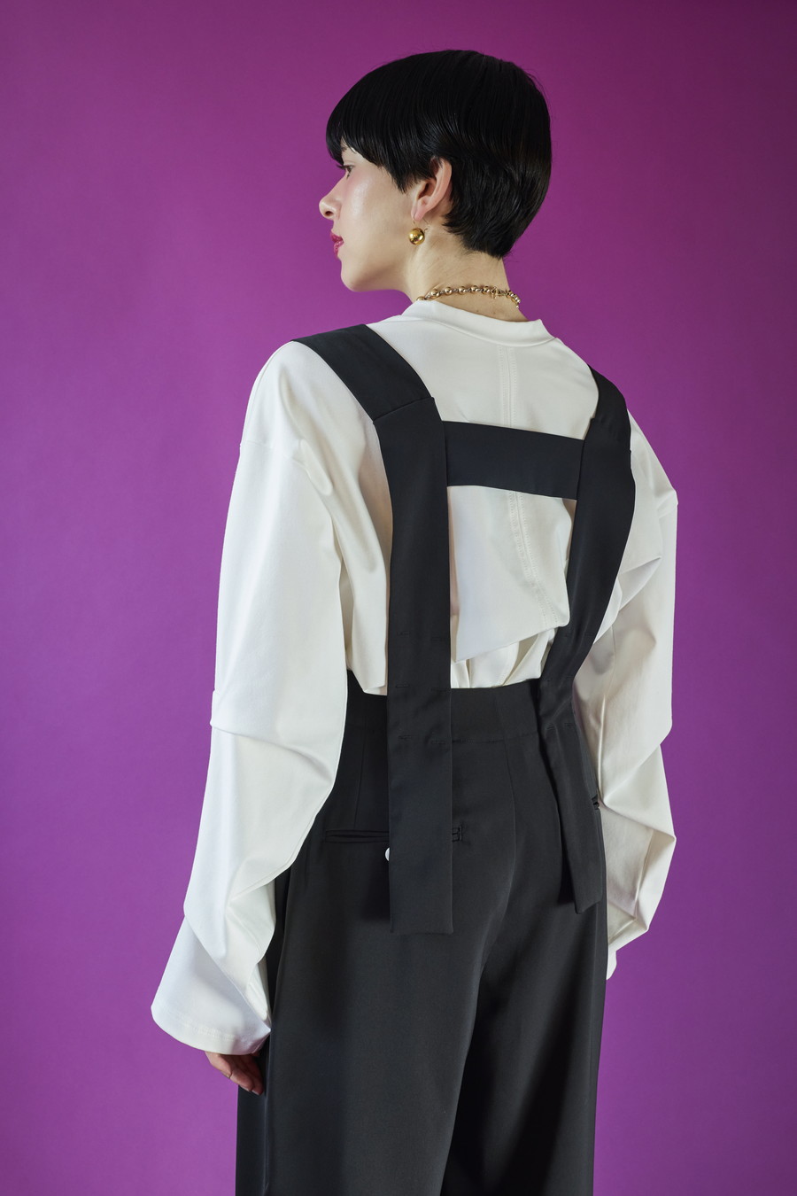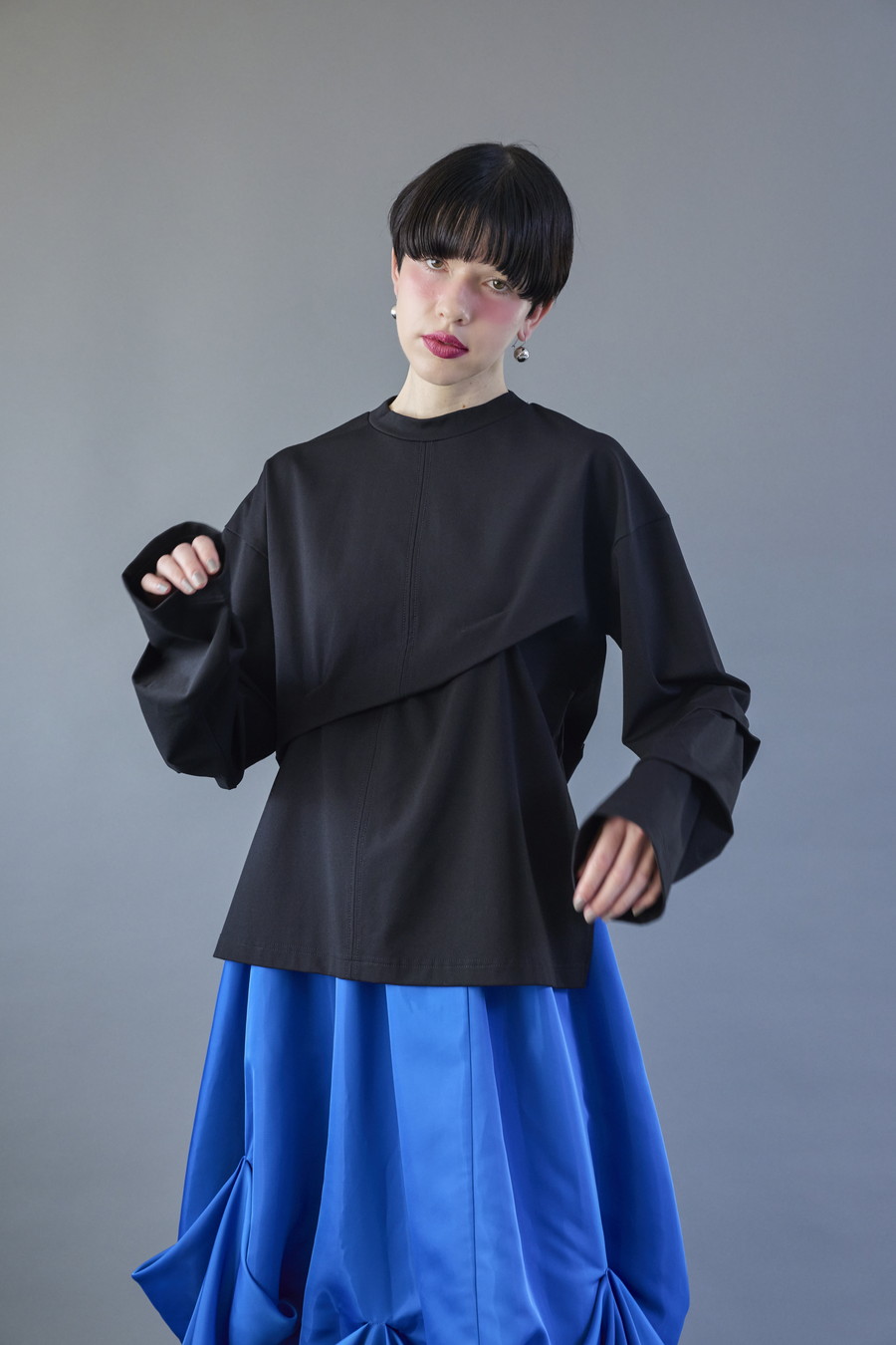 大胆なタックディテールで構築的なフォルムに仕上げたロングTシャツ。張りのある厚地のカットソーを使用しており、着やすさと合わせやすさを兼ね備えたデザイン。