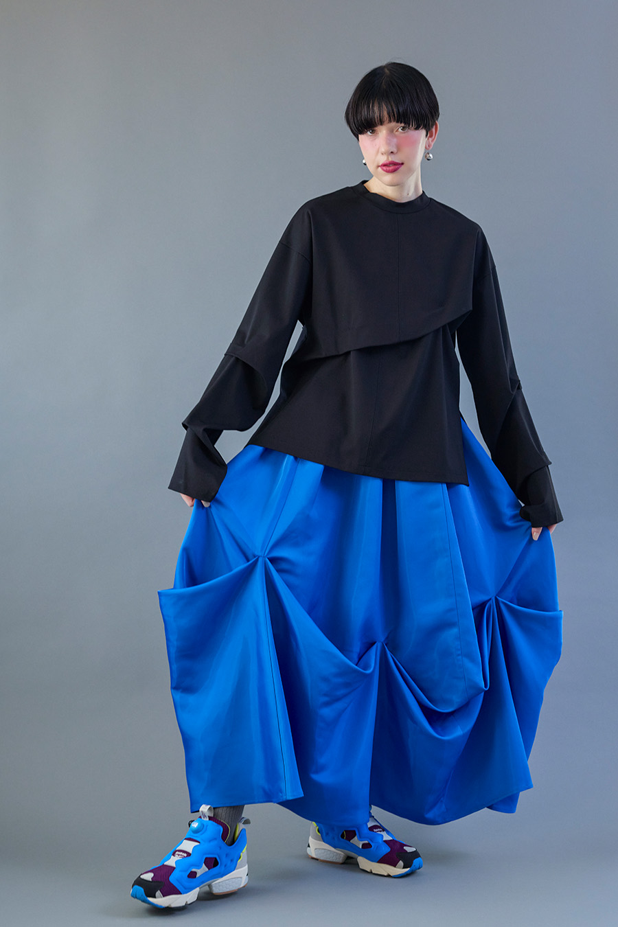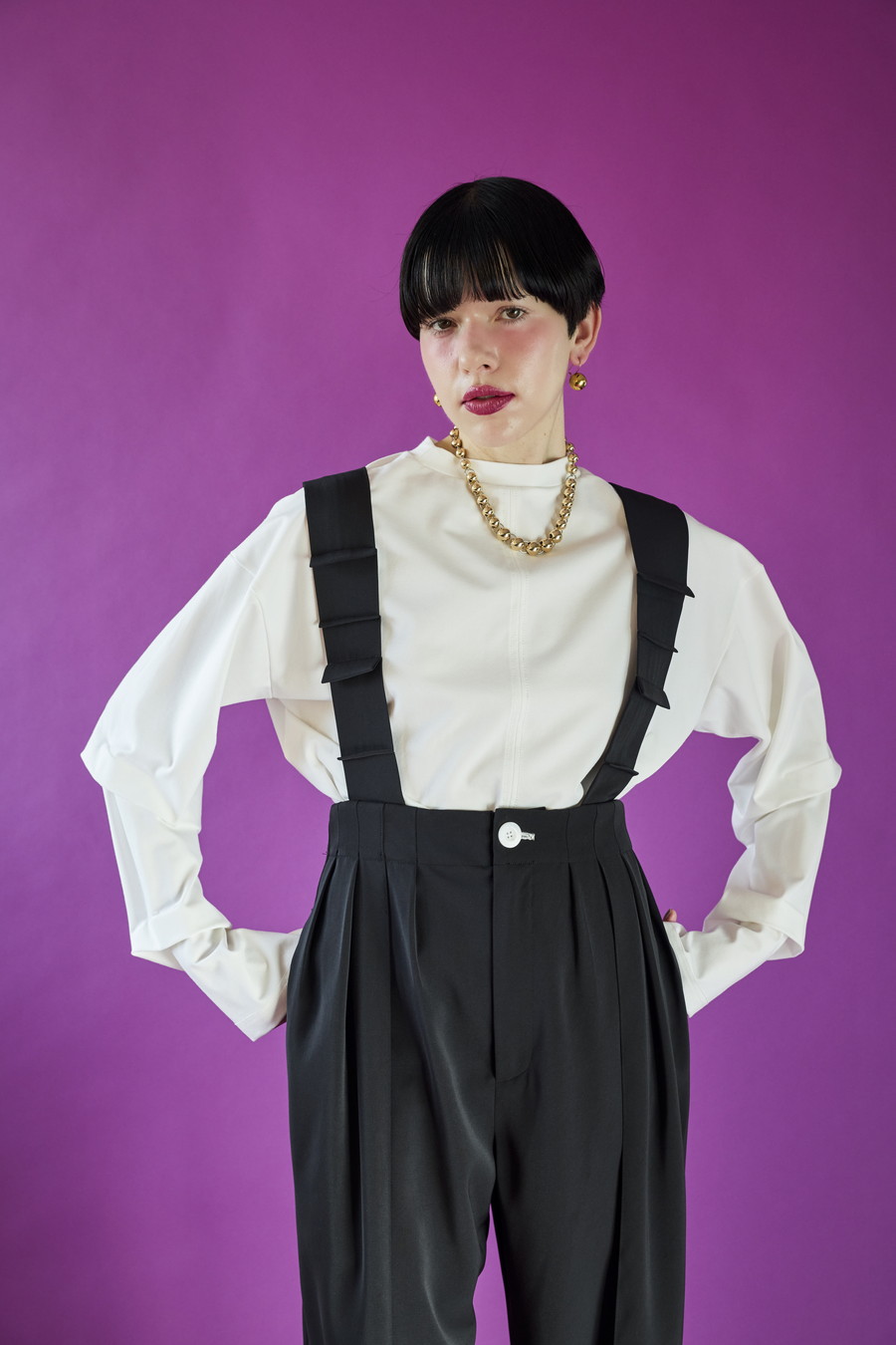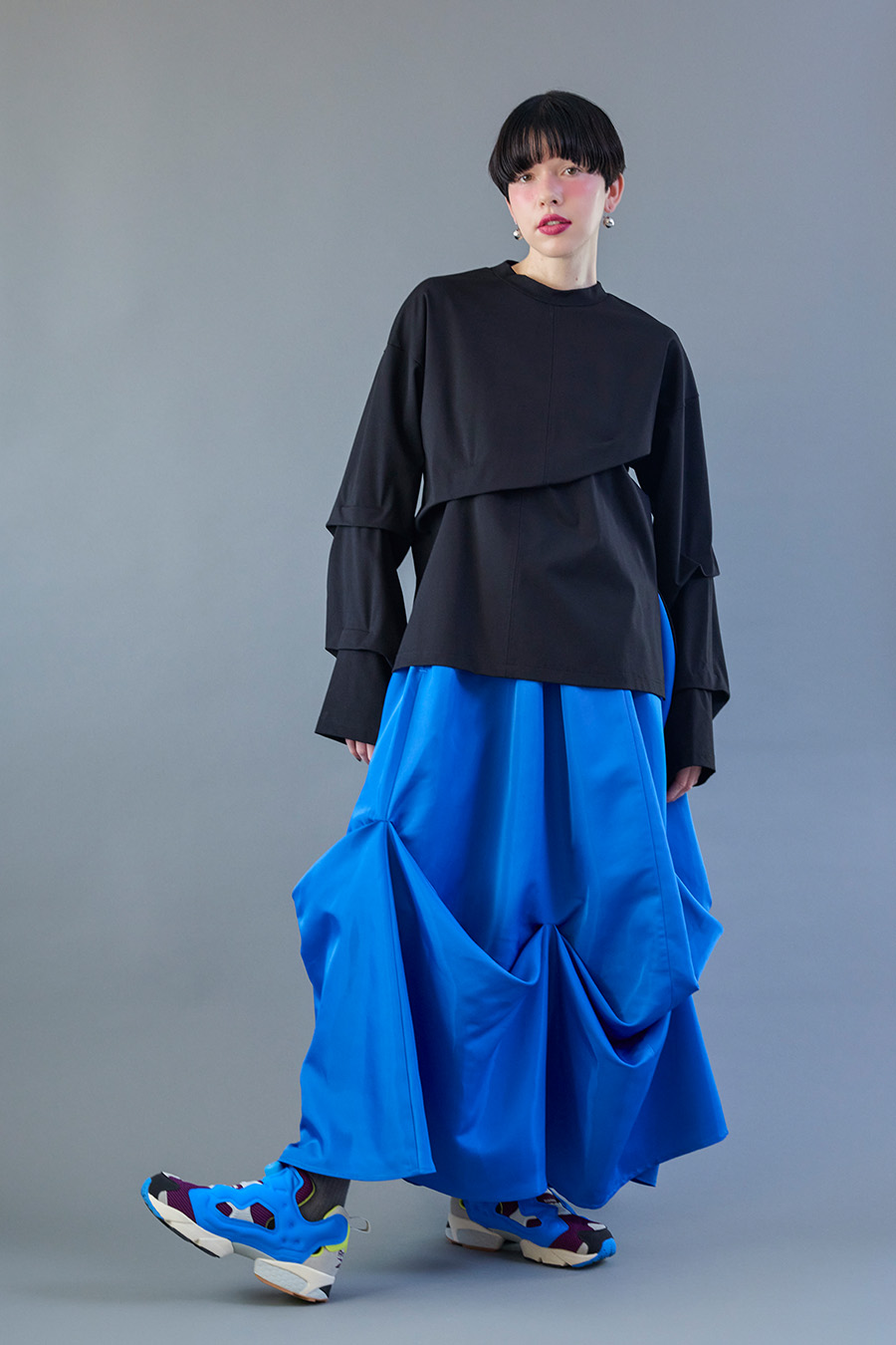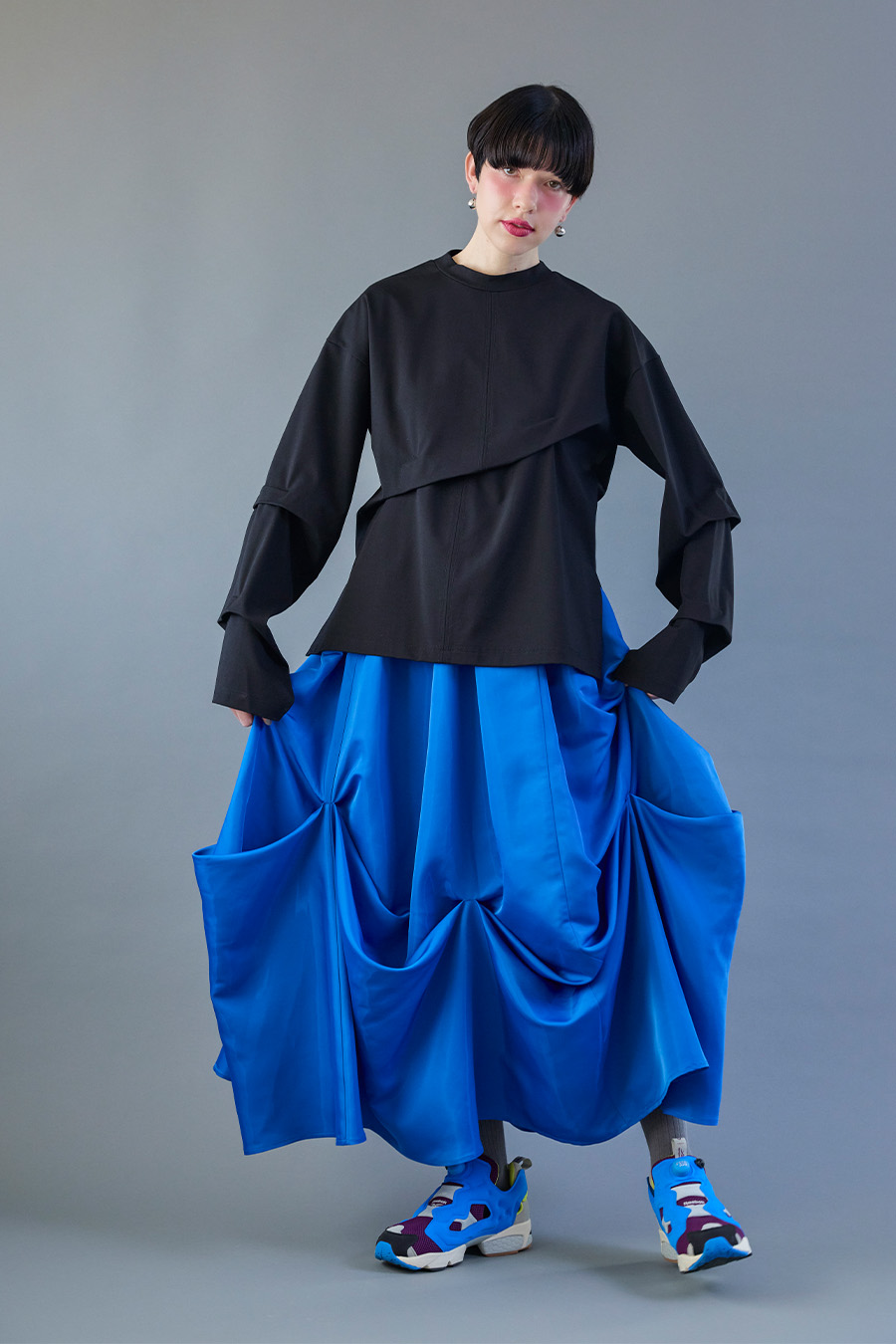 大胆なタックディテールで構築的なフォルムに仕上げたロングTシャツ。張りのある厚地のカットソーを使用しており、着やすさと合わせやすさを兼ね備えたデザイン。