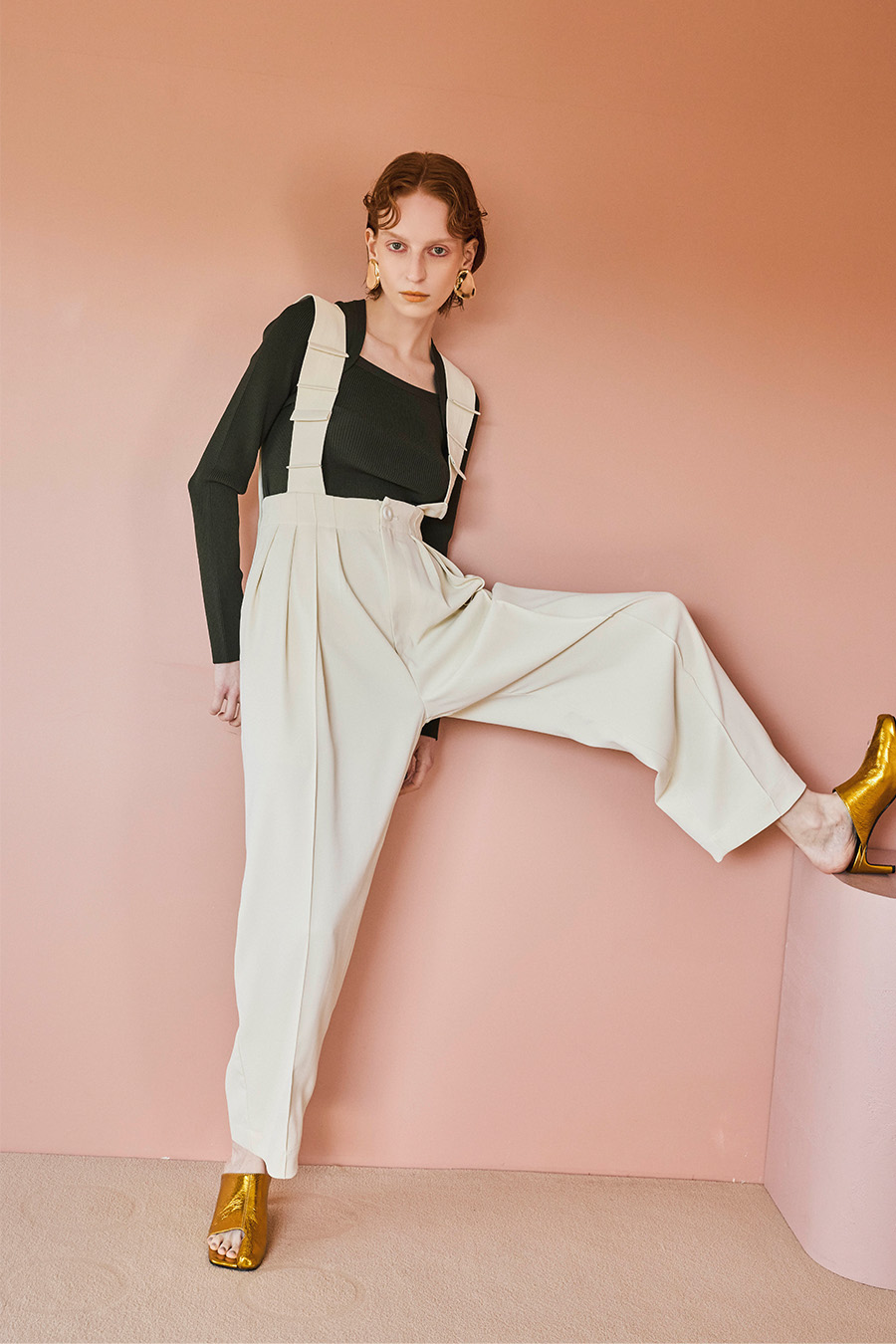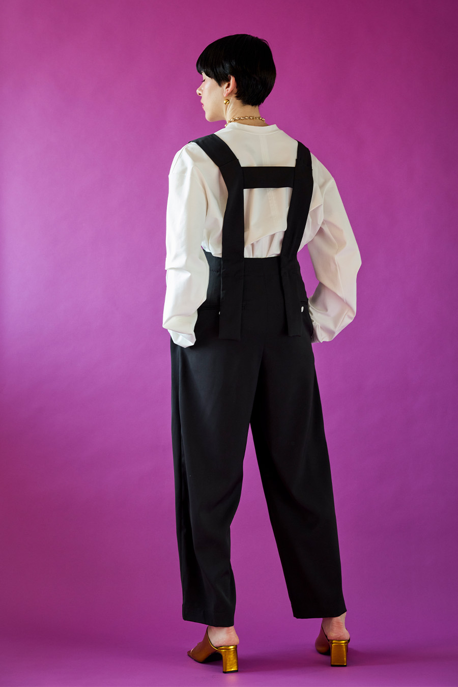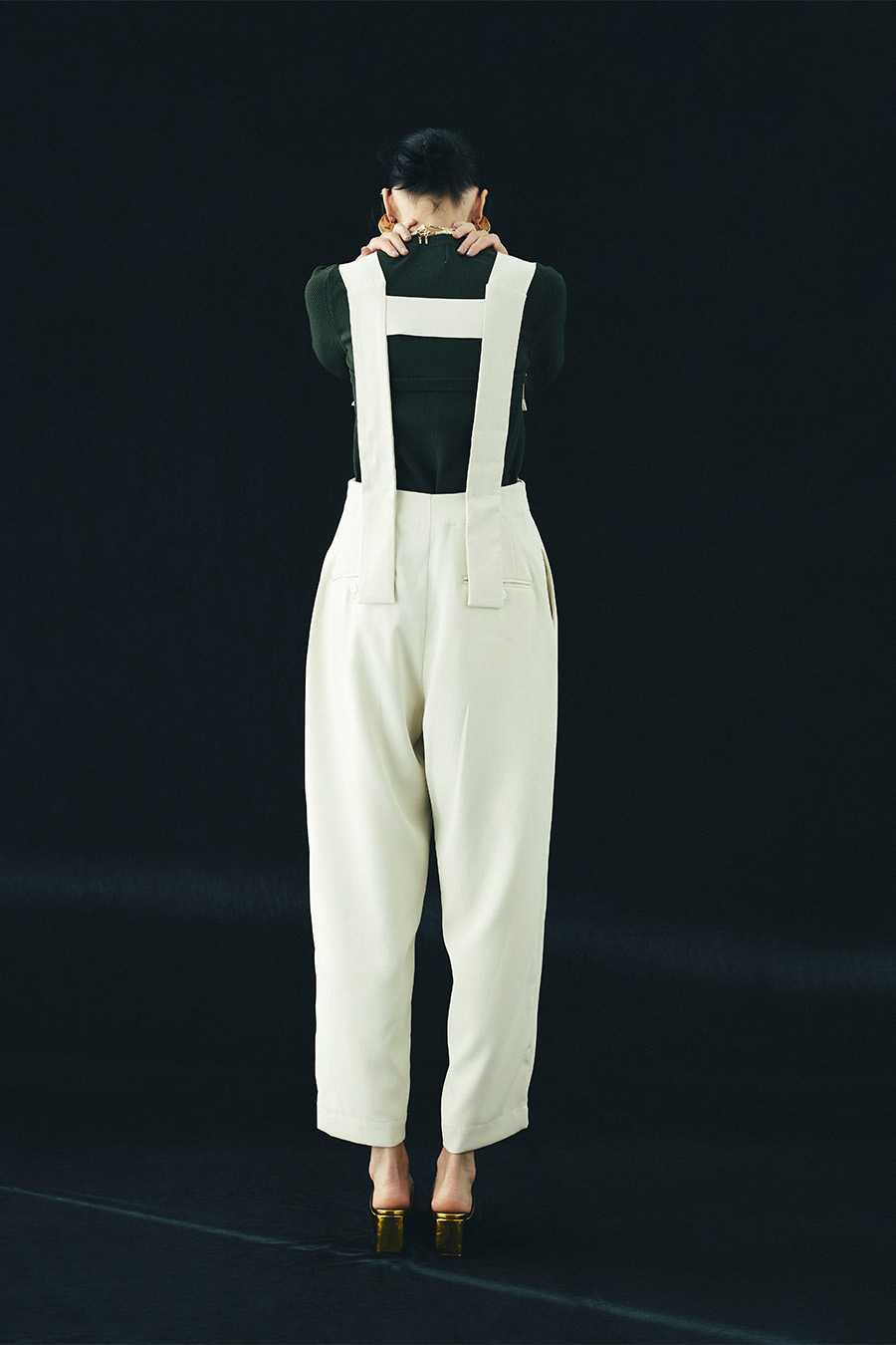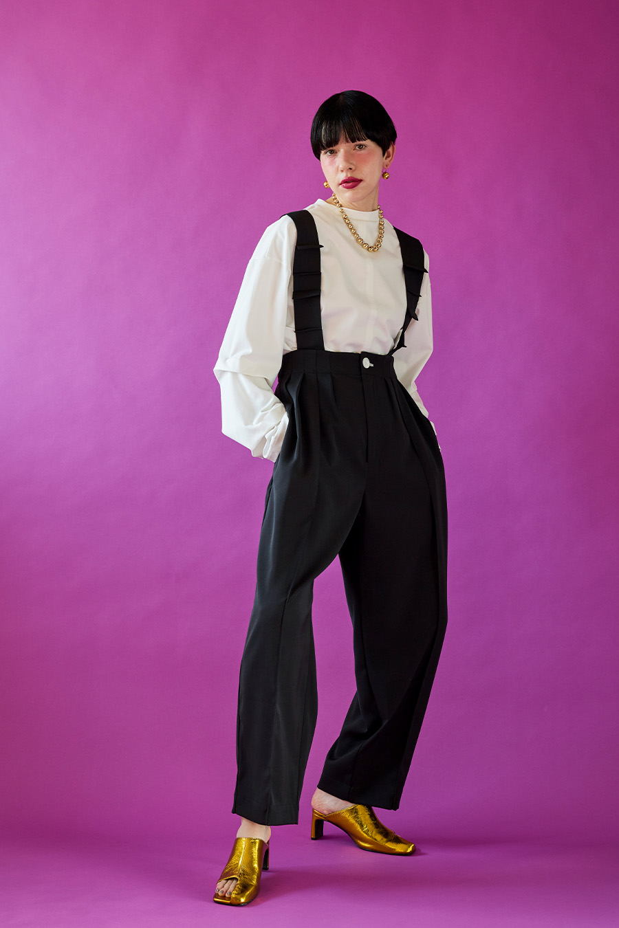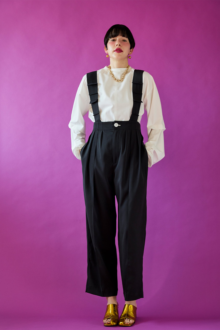 立体的なタックショルダーベルトがアクセントになったサスペンダーパンツ。落ち感のある素材を使用しており、ボリュームがありながらも脚をすっきりと魅せてくれる美脚シルエット。