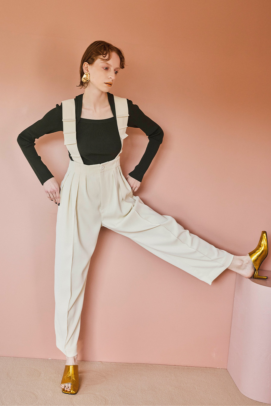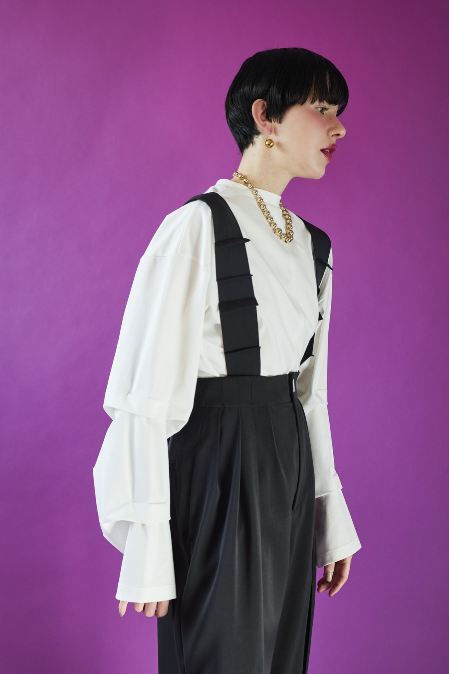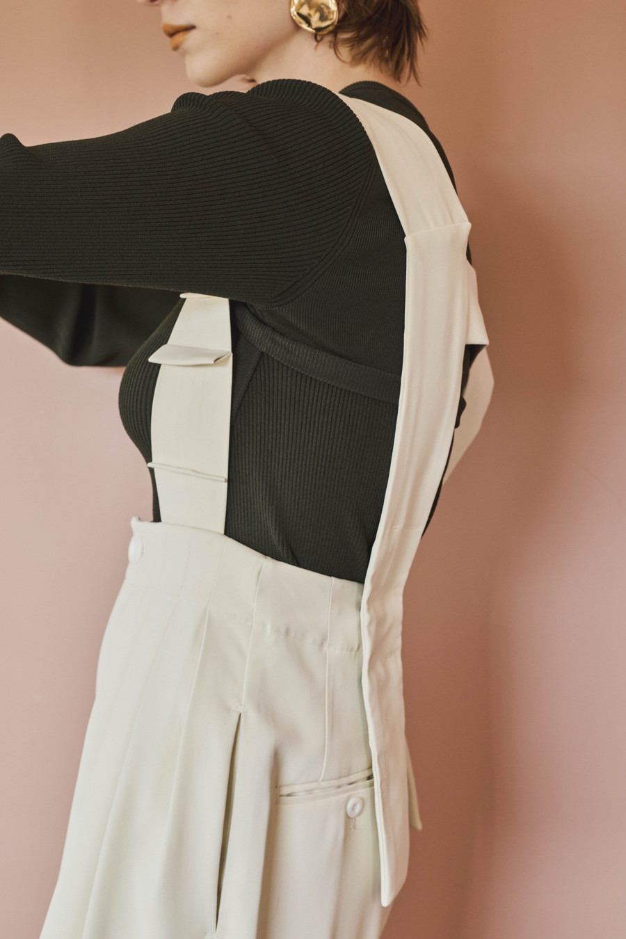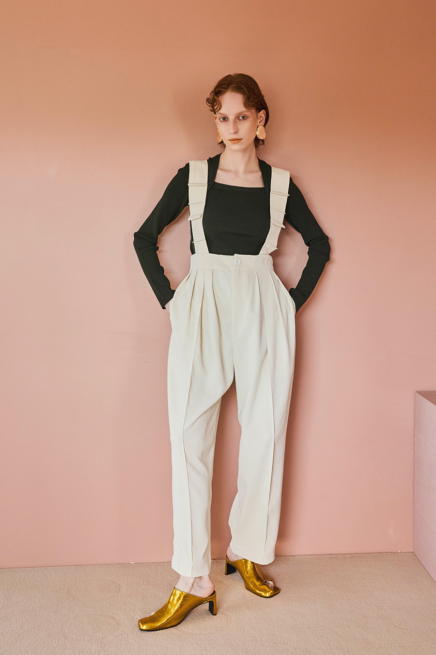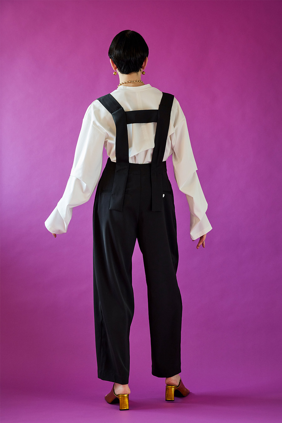 立体的なタックショルダーベルトがアクセントになったサスペンダーパンツ。落ち感のある素材を使用しており、ボリュームがありながらも脚をすっきりと魅せてくれる美脚シルエット。