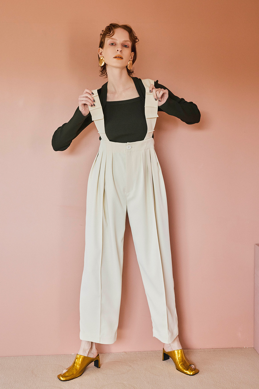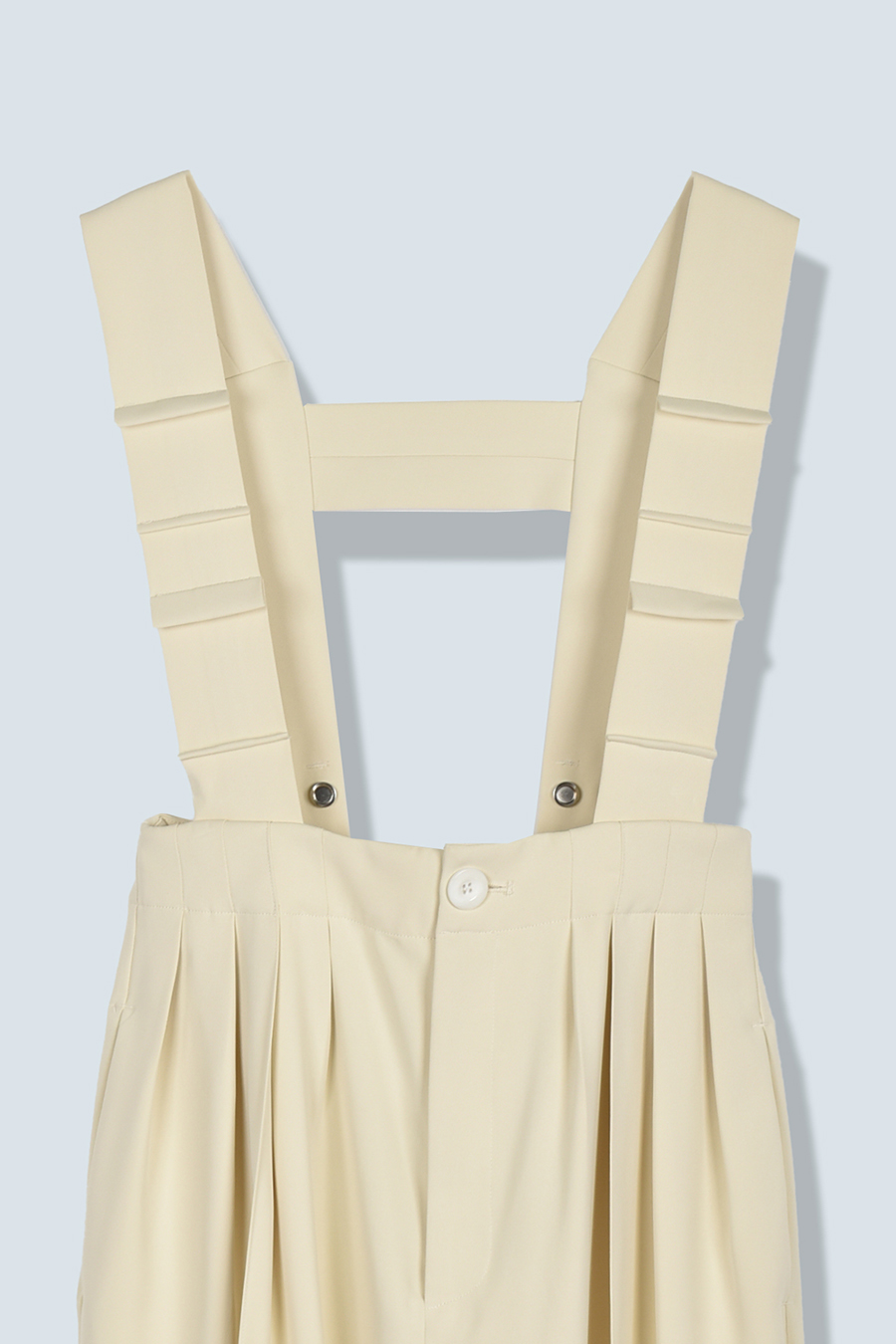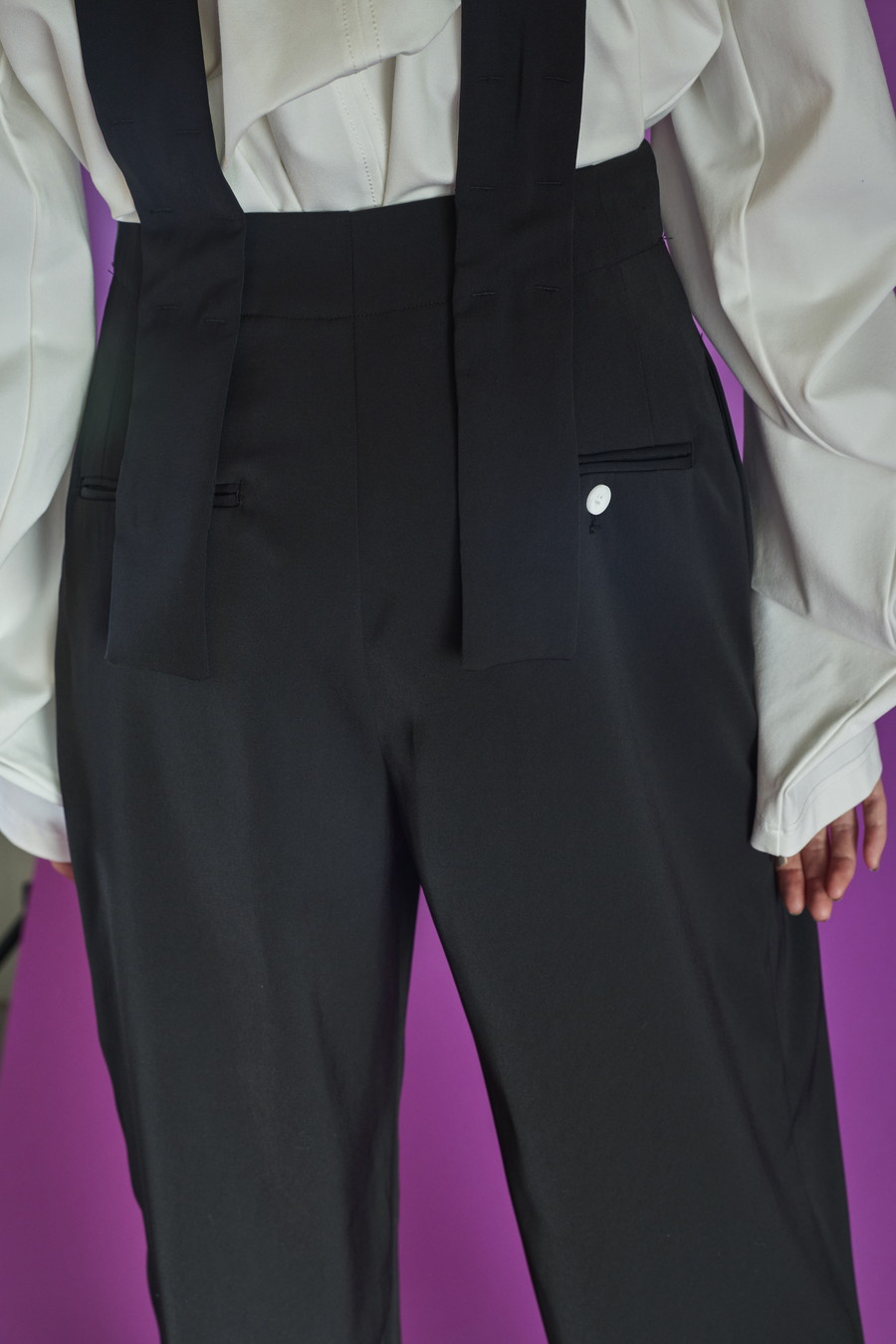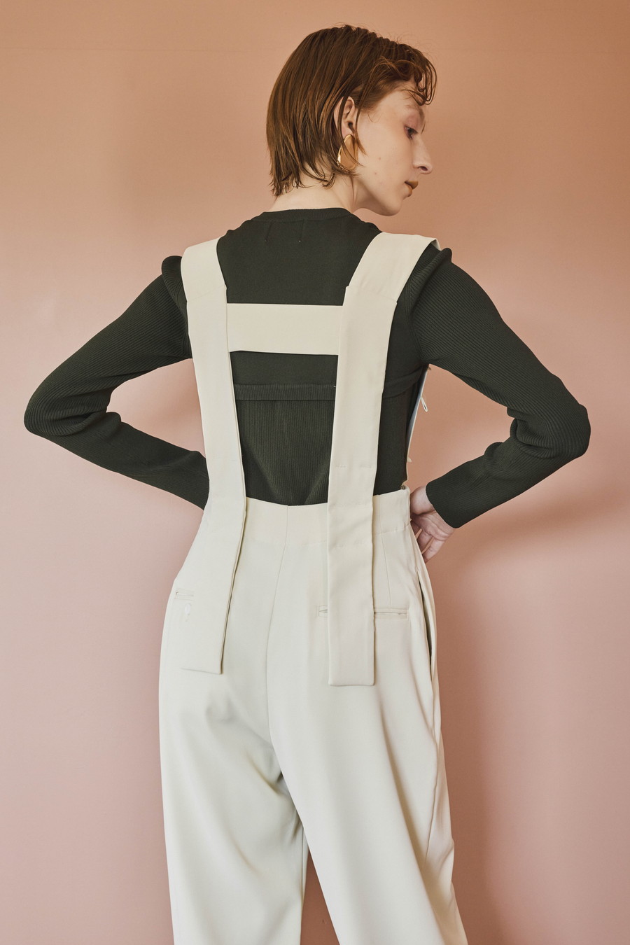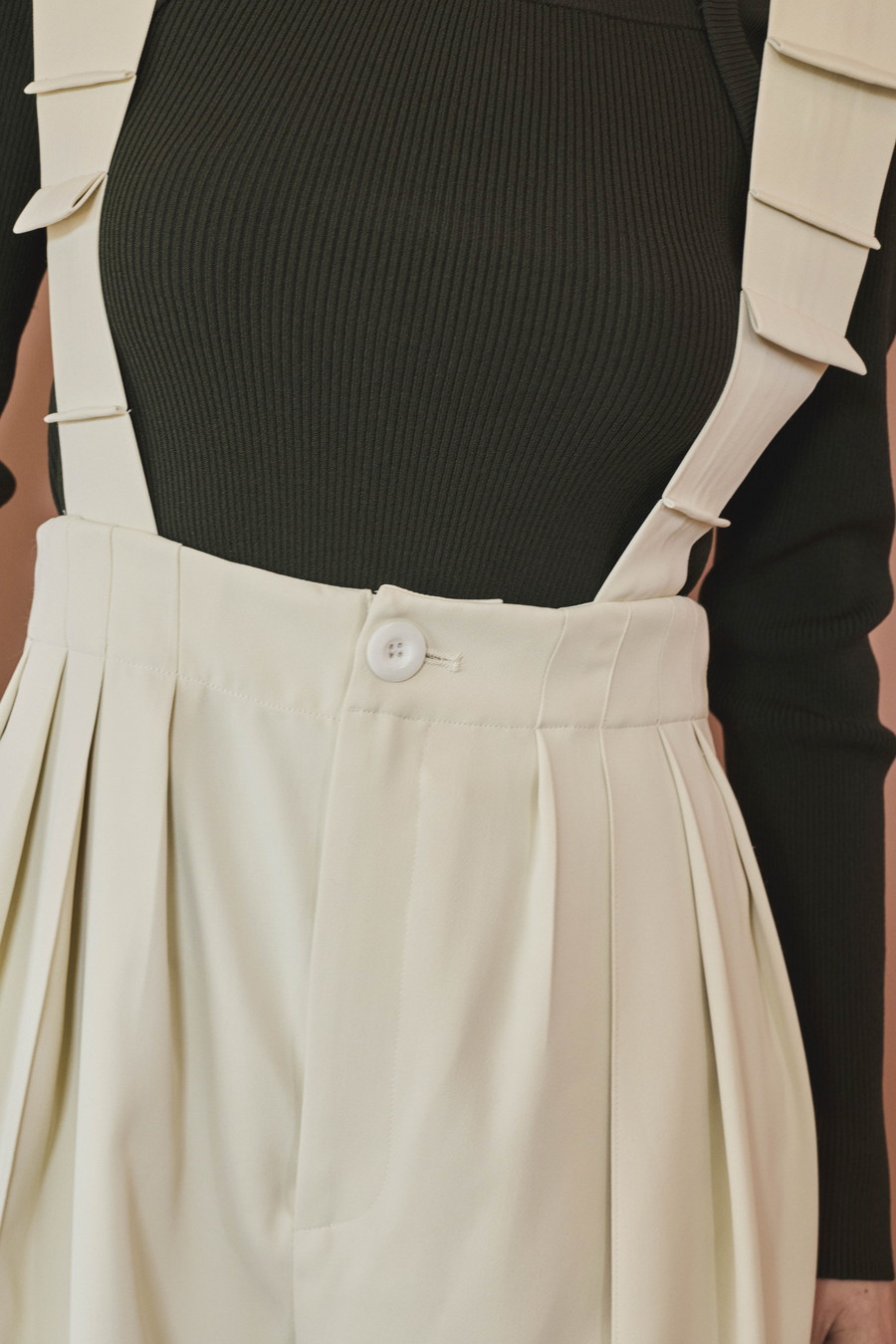 立体的なタックショルダーベルトがアクセントになったサスペンダーパンツ。落ち感のある素材を使用しており、ボリュームがありながらも脚をすっきりと魅せてくれる美脚シルエット。
