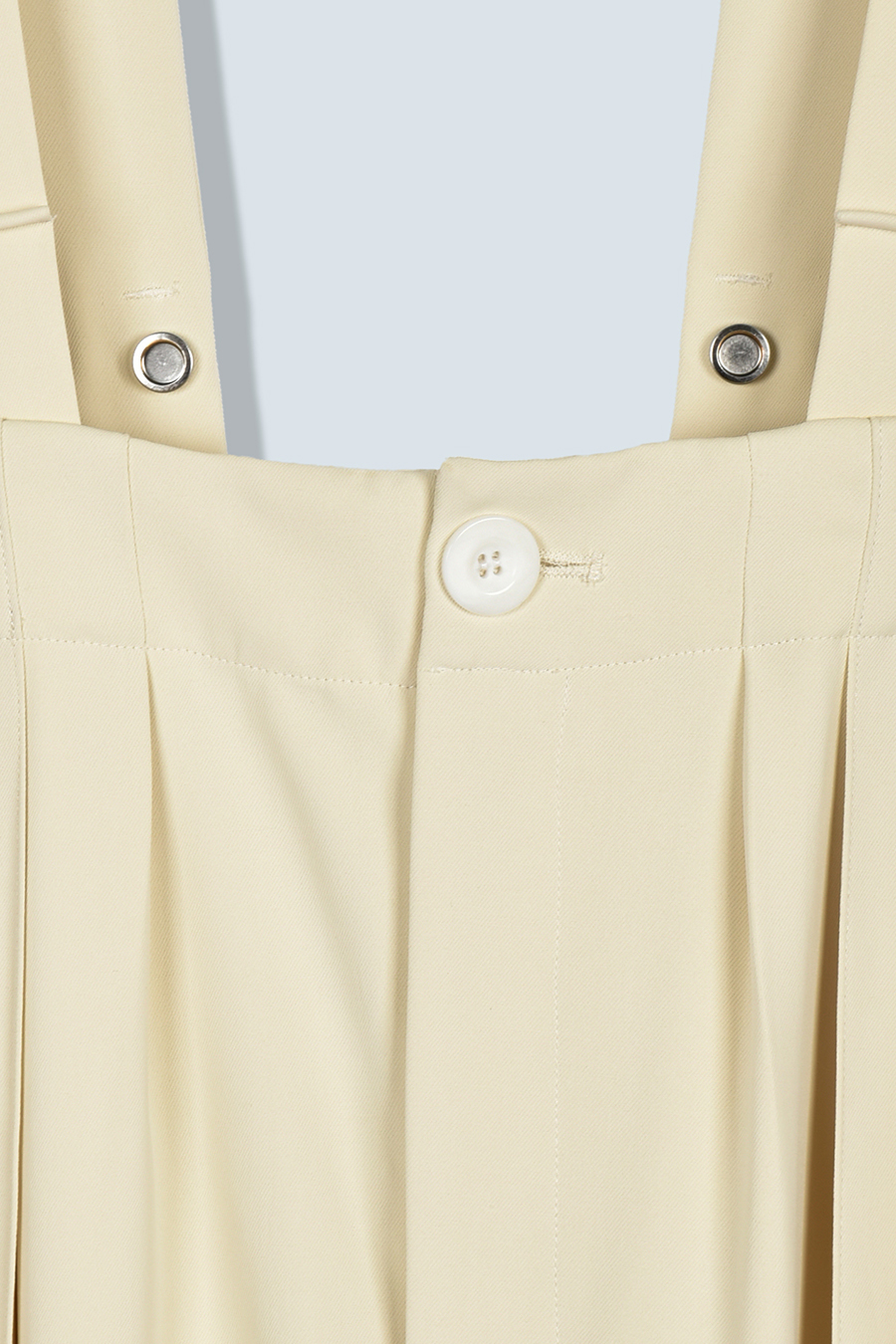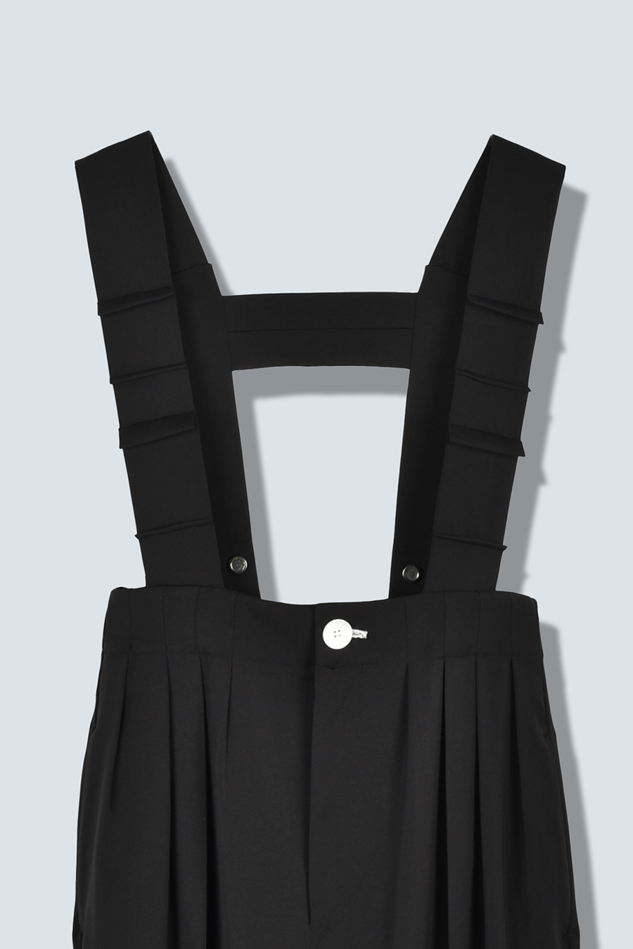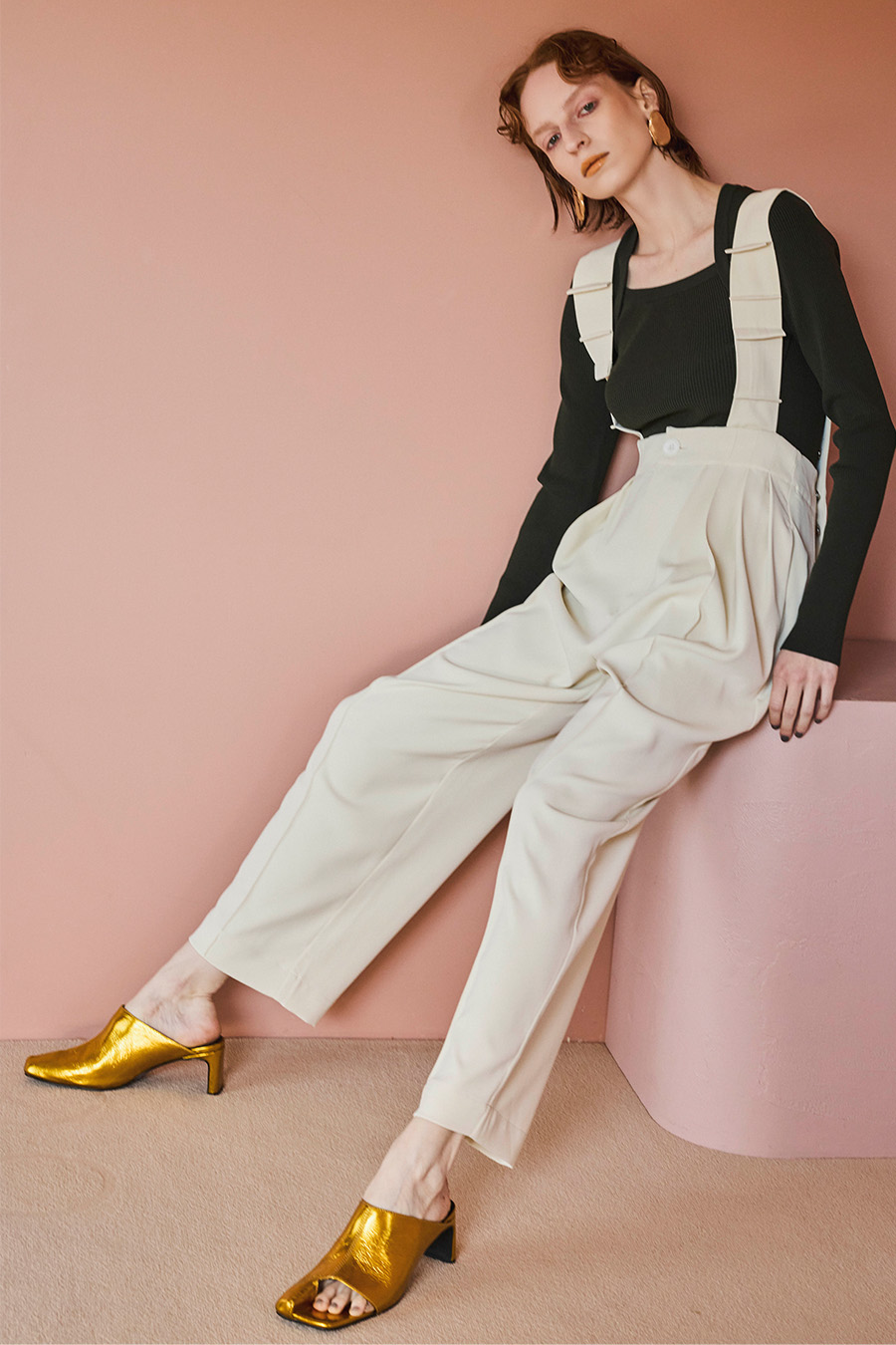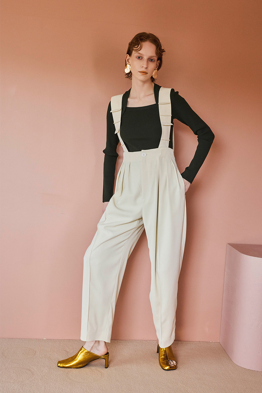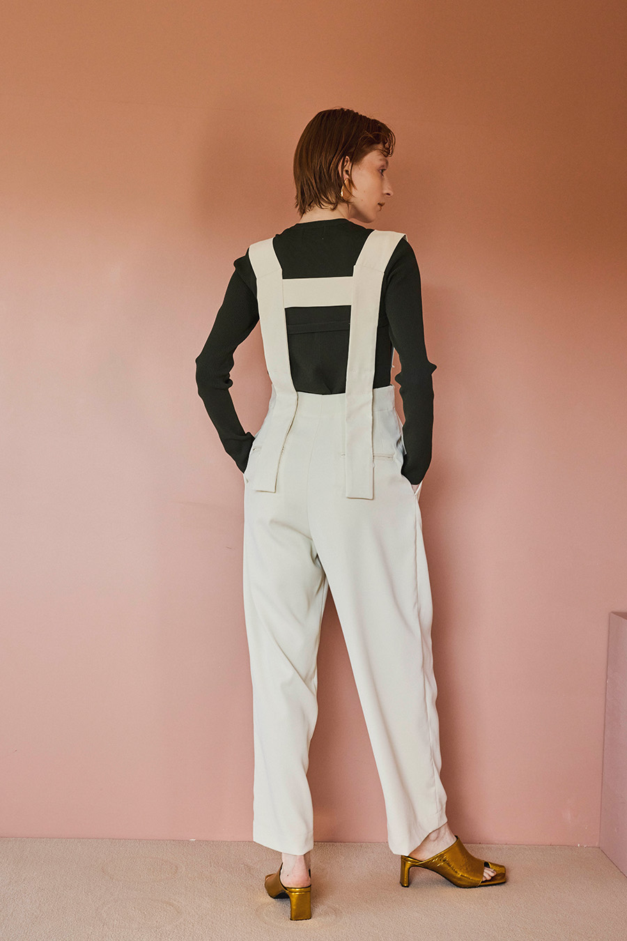 立体的なタックショルダーベルトがアクセントになったサスペンダーパンツ。落ち感のある素材を使用しており、ボリュームがありながらも脚をすっきりと魅せてくれる美脚シルエット。