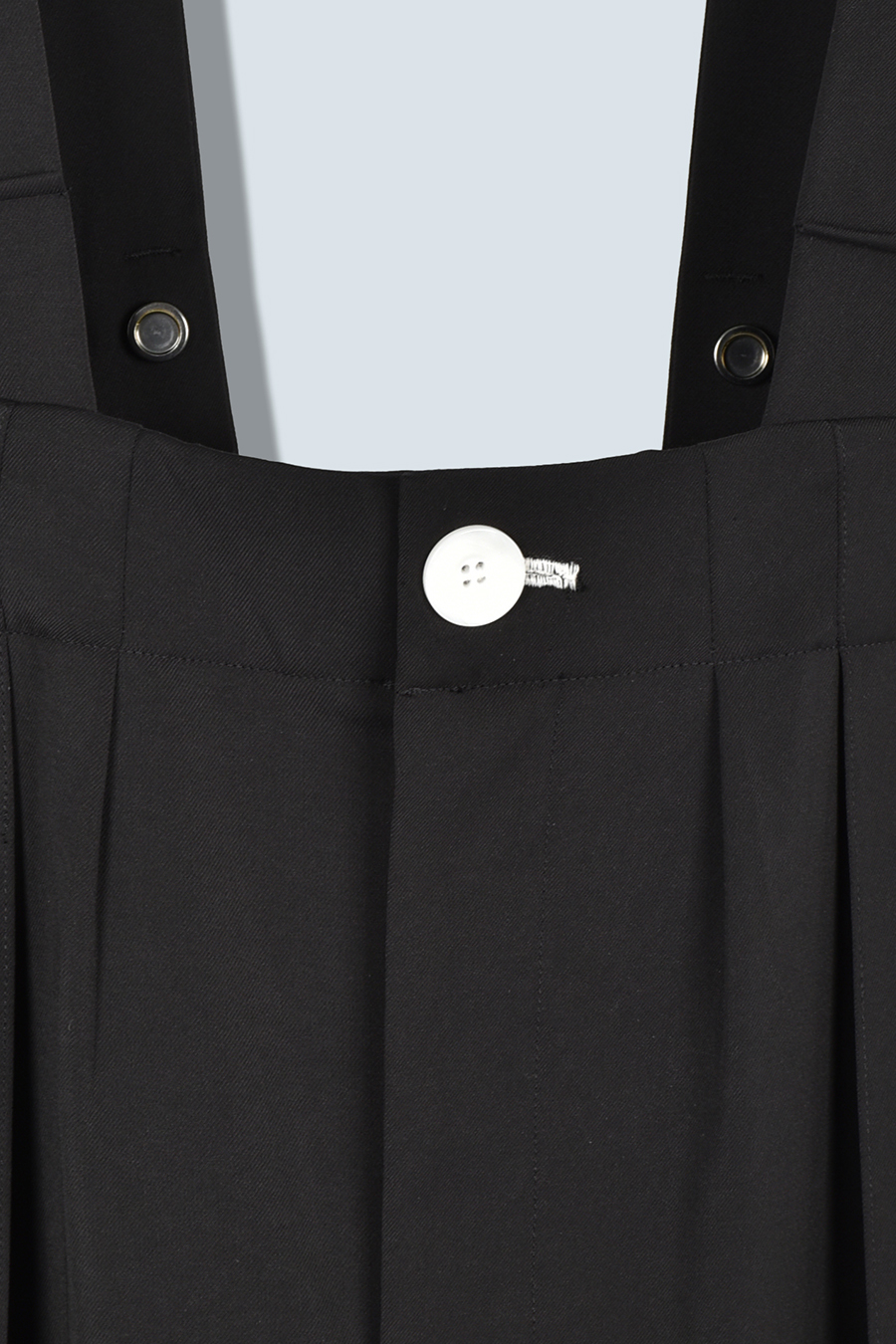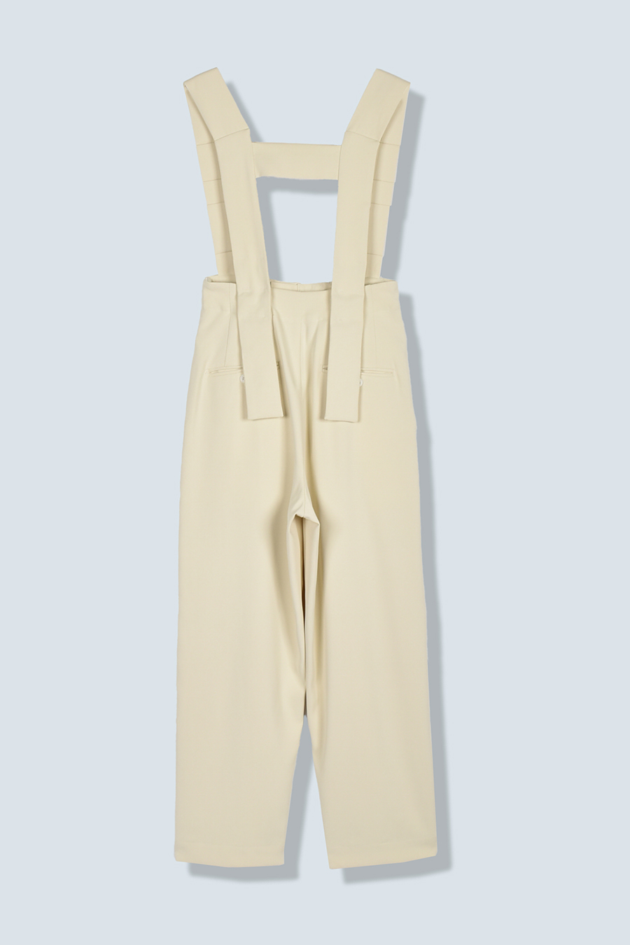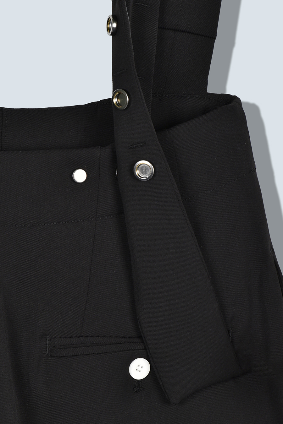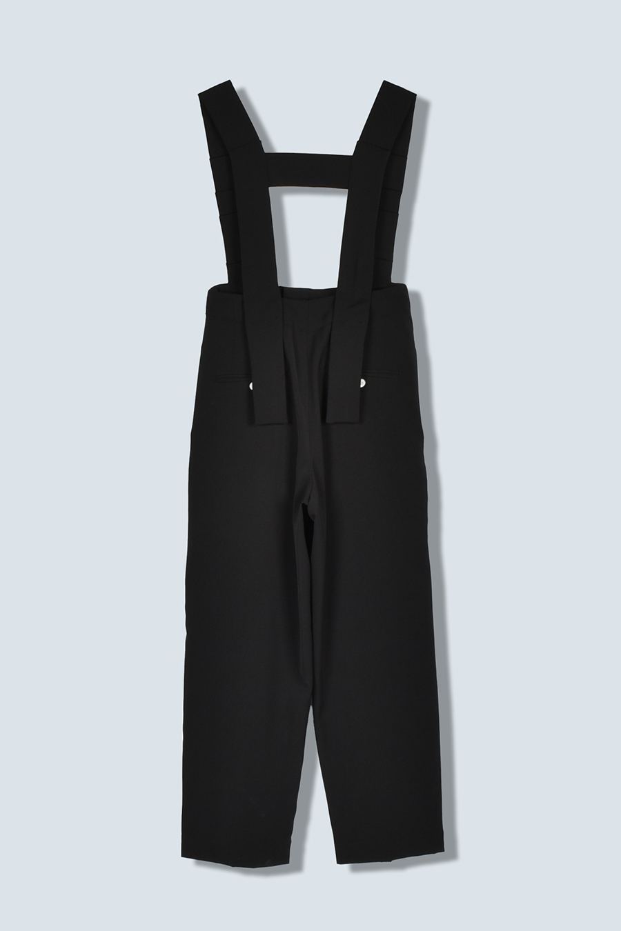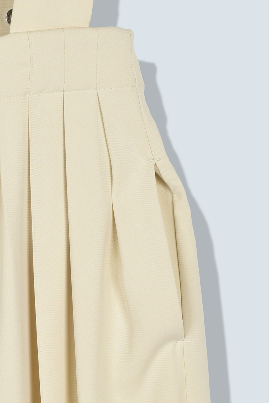 立体的なタックショルダーベルトがアクセントになったサスペンダーパンツ。落ち感のある素材を使用しており、ボリュームがありながらも脚をすっきりと魅せてくれる美脚シルエット。