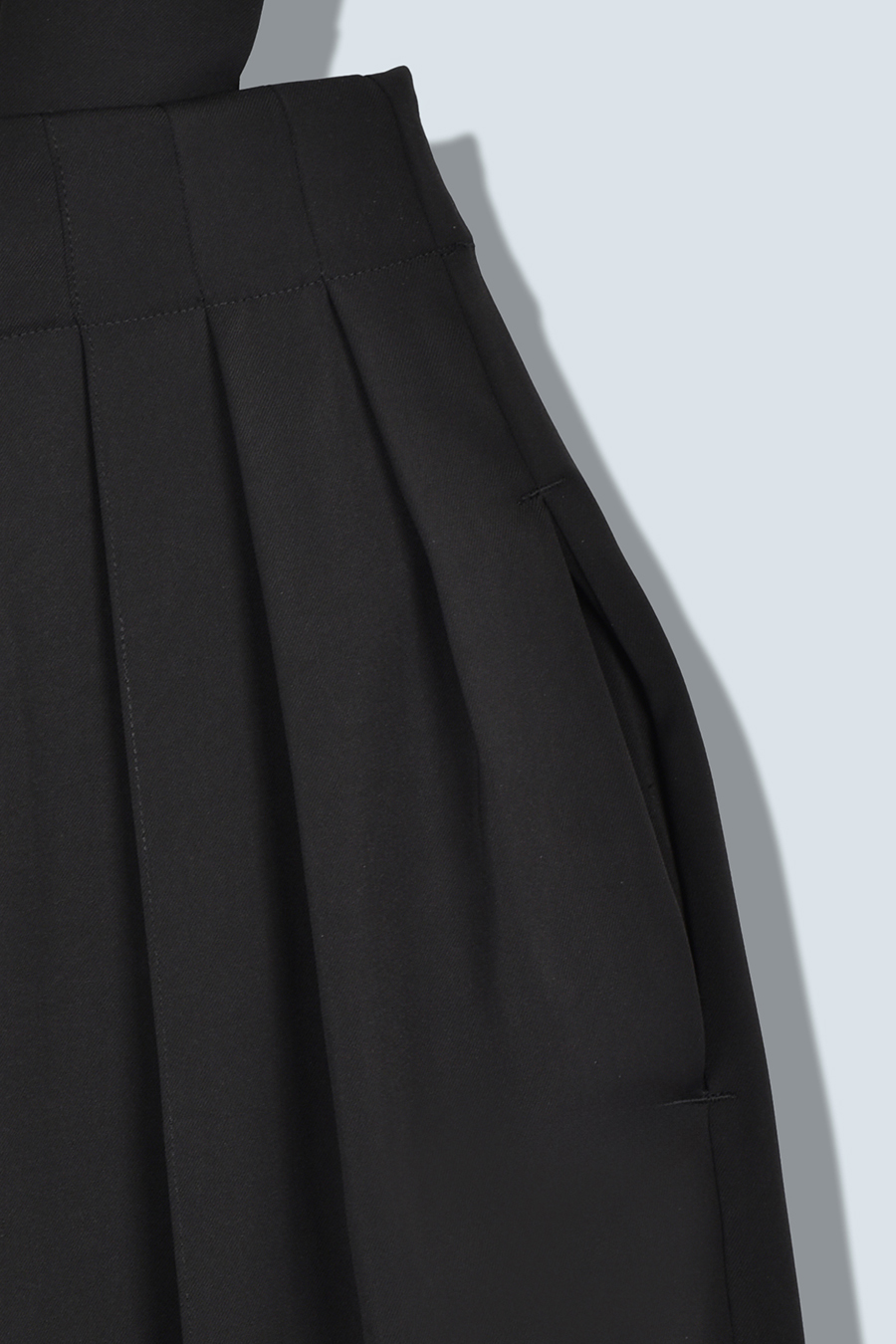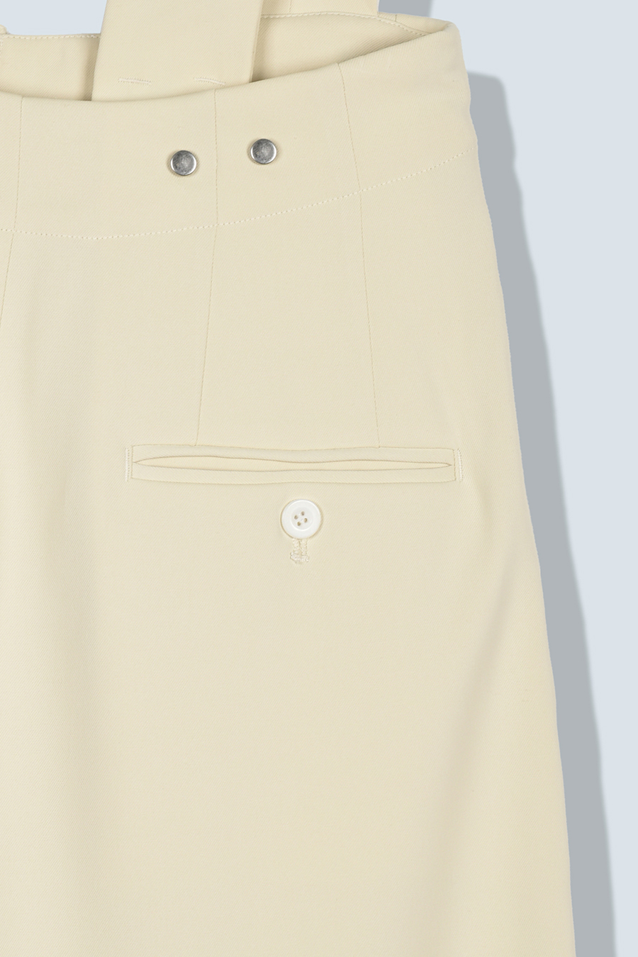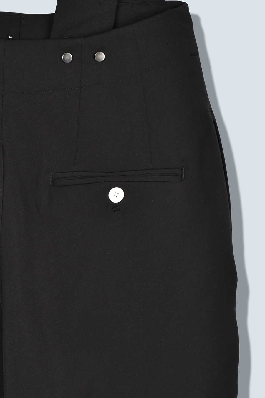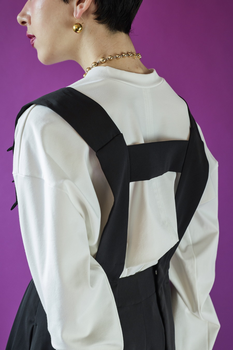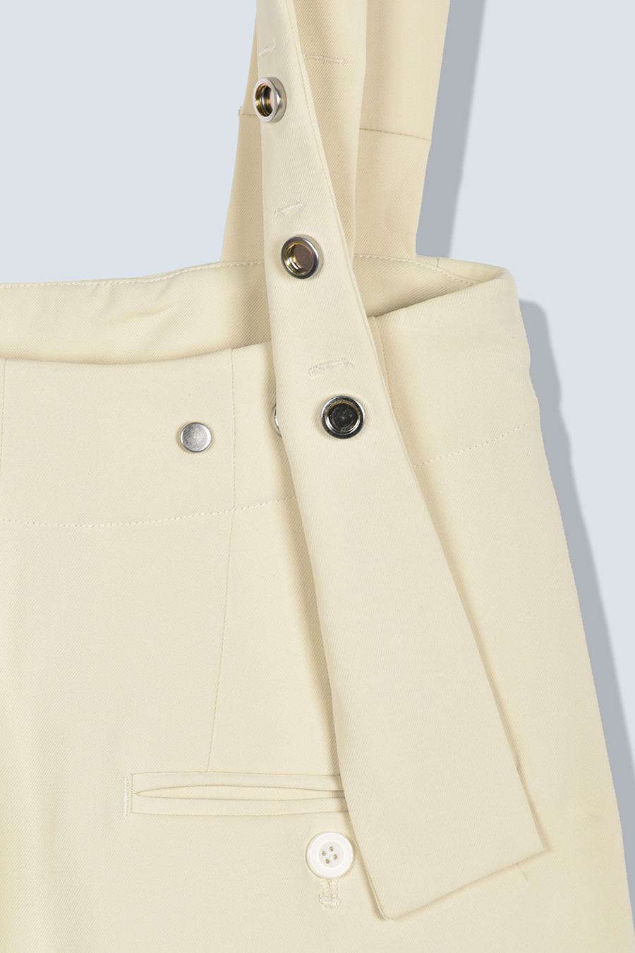 立体的なタックショルダーベルトがアクセントになったサスペンダーパンツ。落ち感のある素材を使用しており、ボリュームがありながらも脚をすっきりと魅せてくれる美脚シルエット。