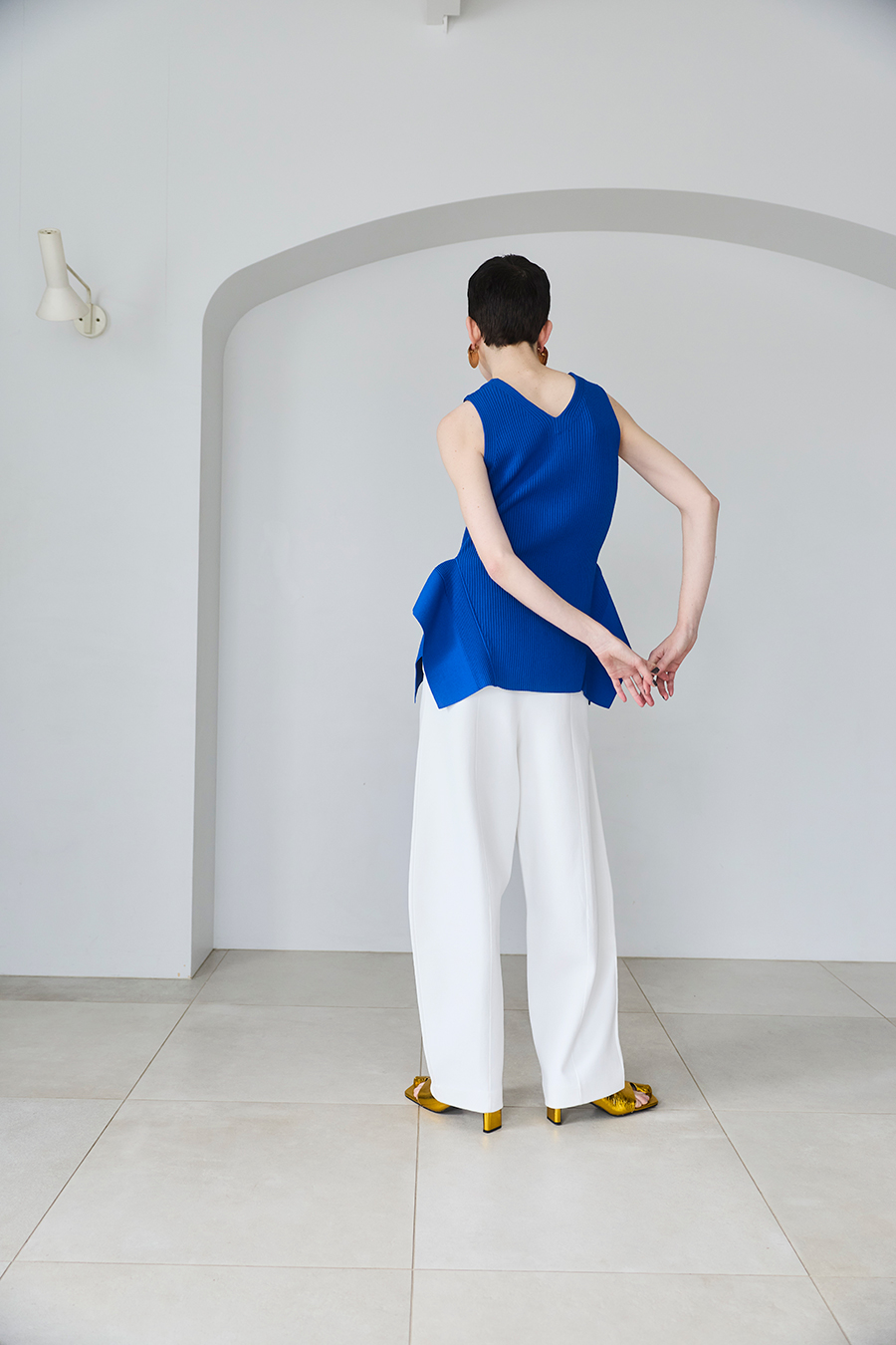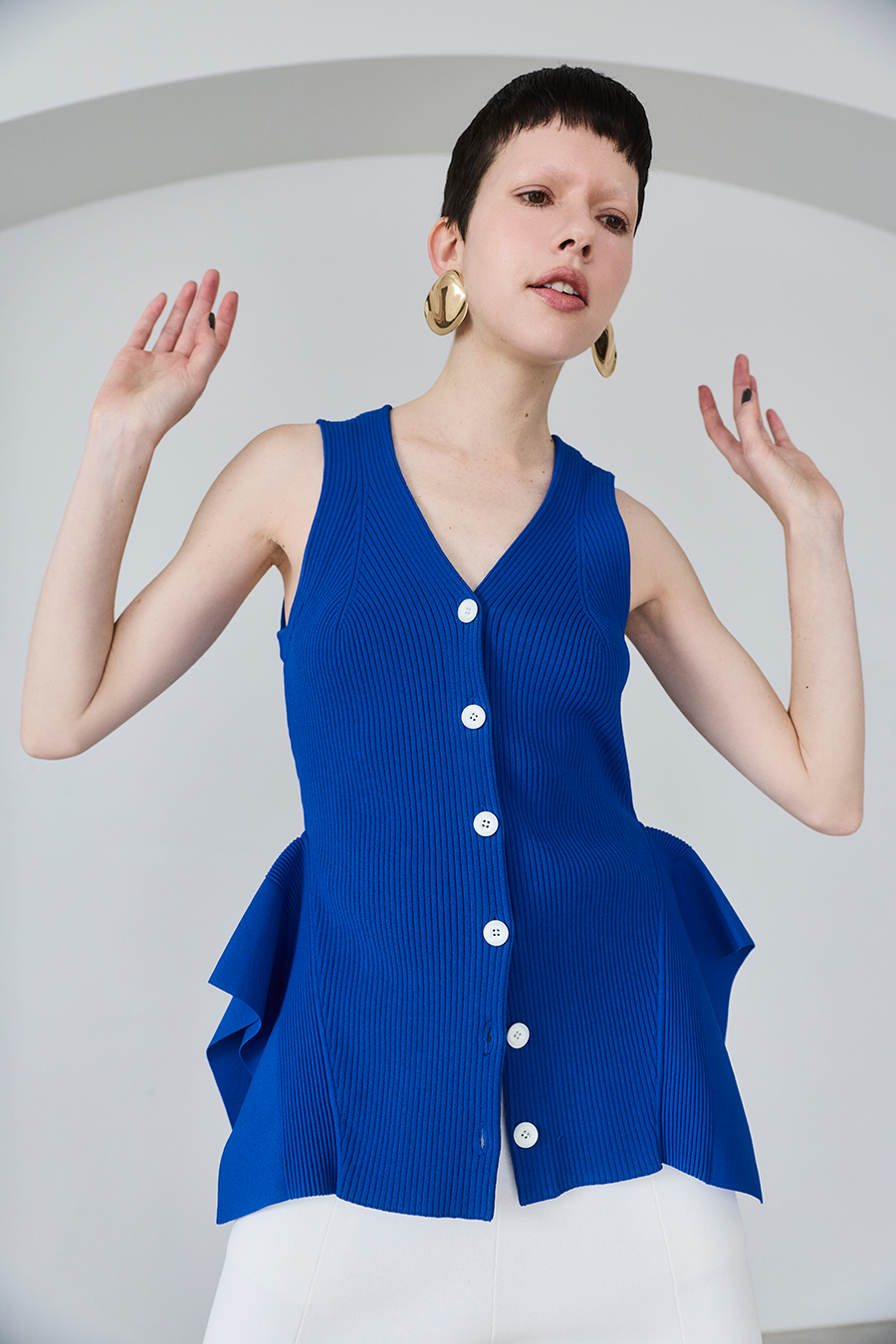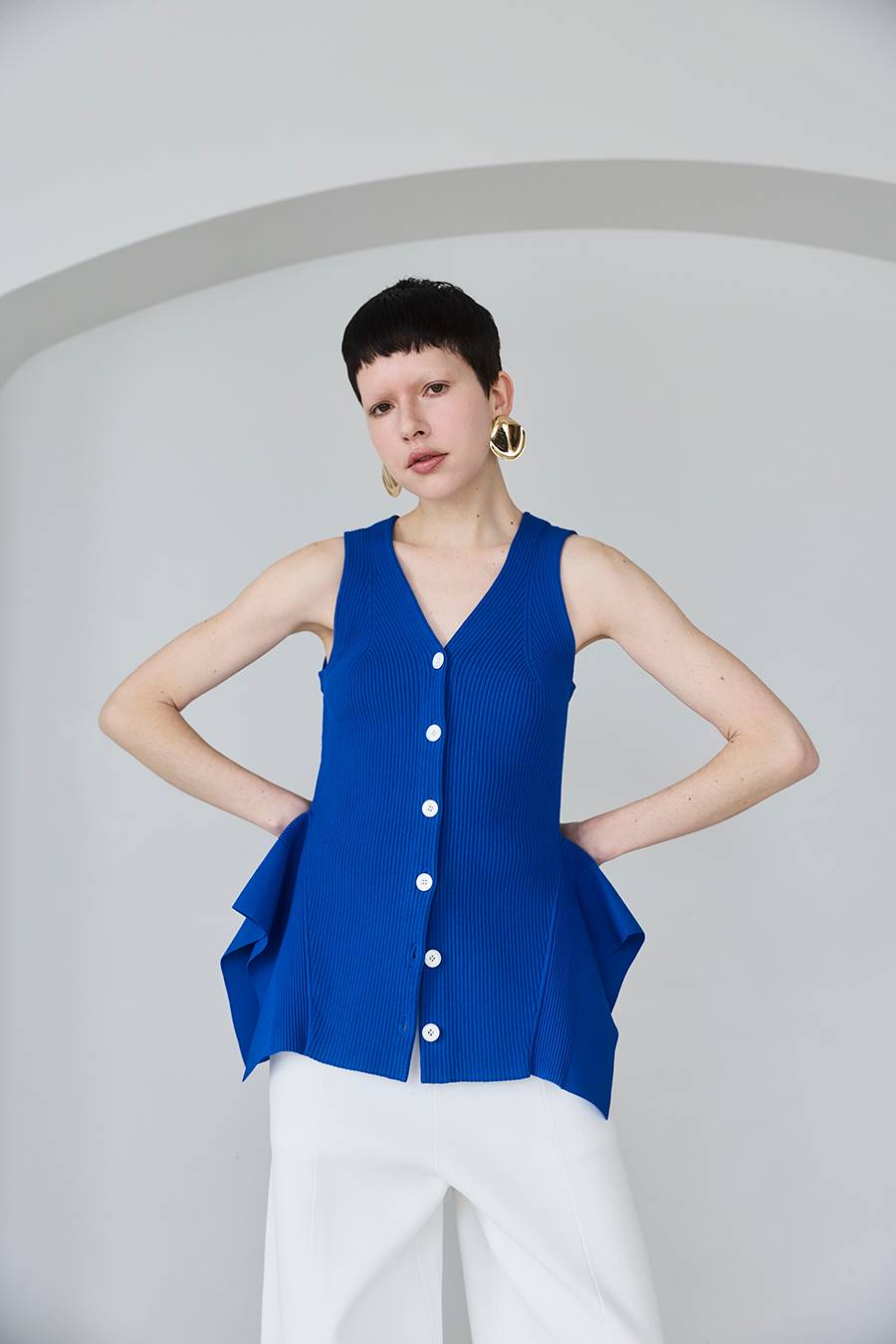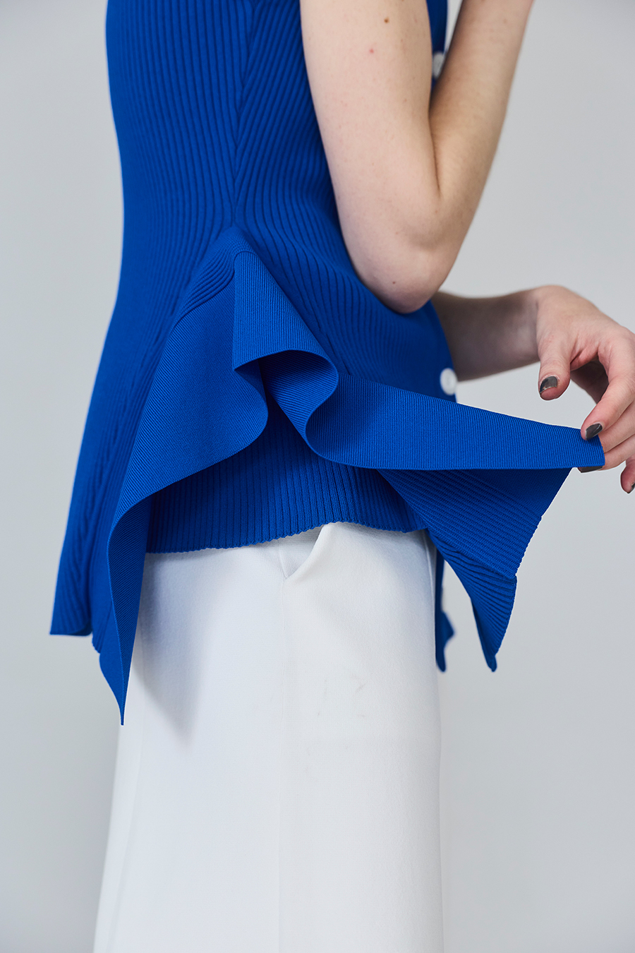 ウエストラインの構築的なペプラムが身体のラインを美しく魅せてくれるニットベスト。1枚でTOPSとして着用いただけるデザイン。