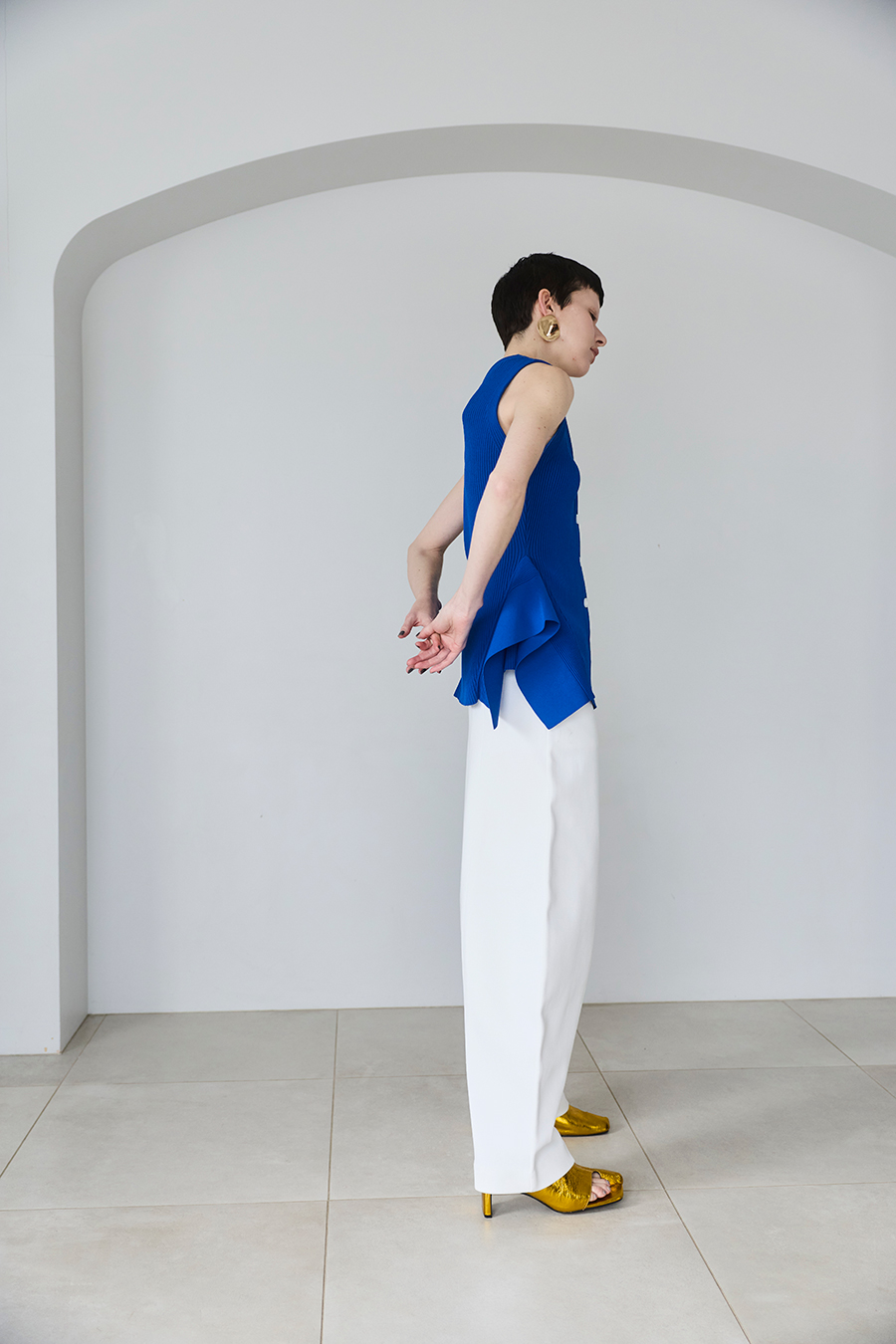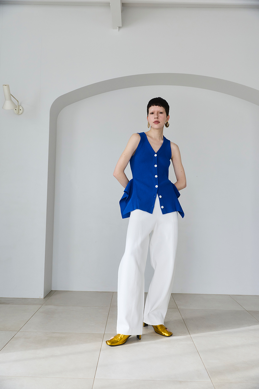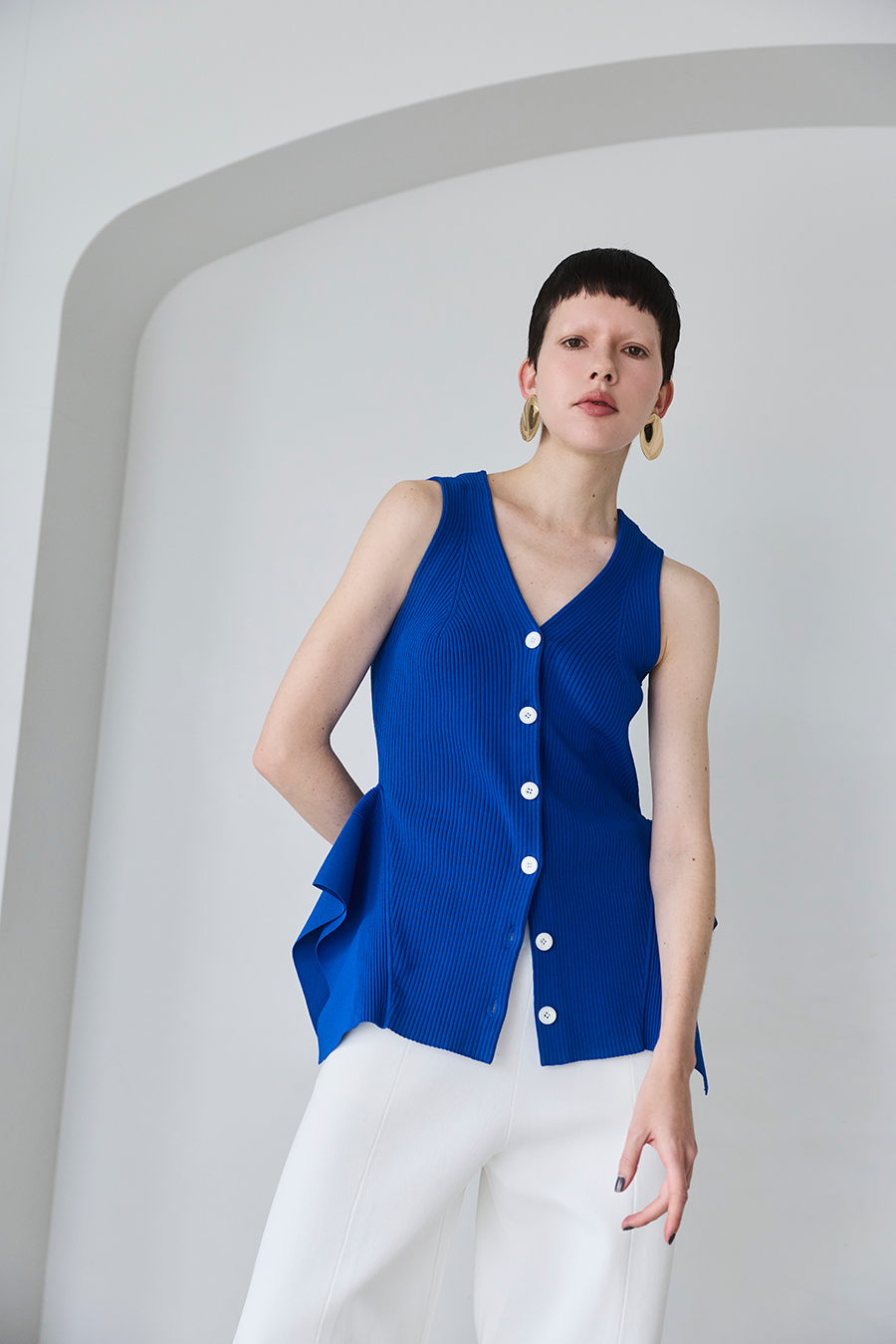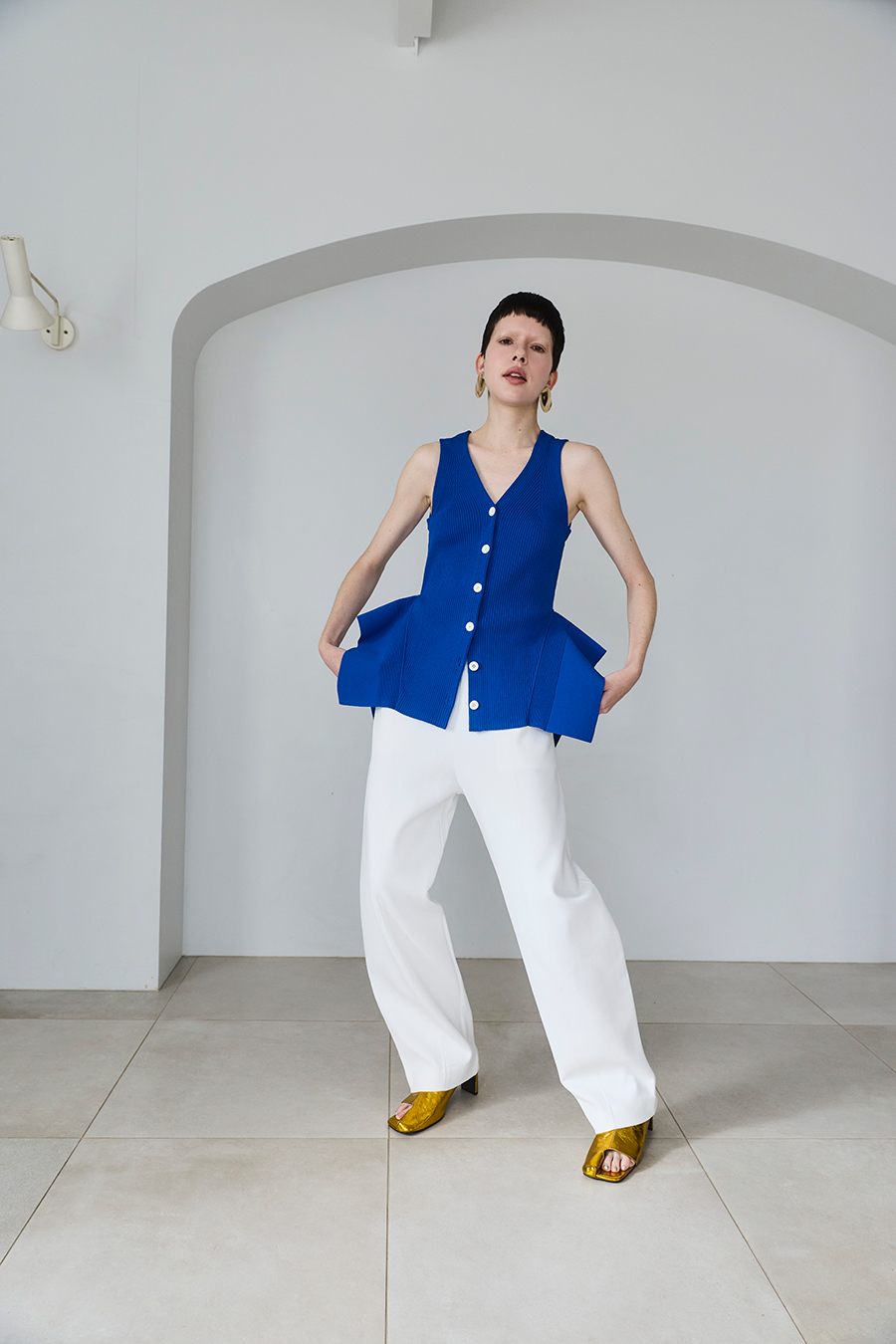 ウエストラインの構築的なペプラムが身体のラインを美しく魅せてくれるニットベスト。1枚でTOPSとして着用いただけるデザイン。