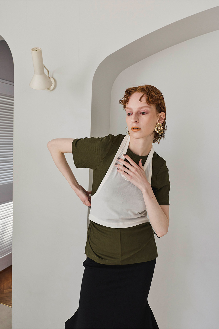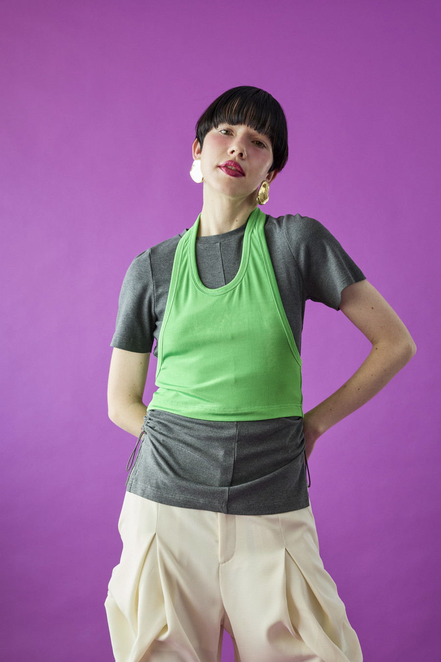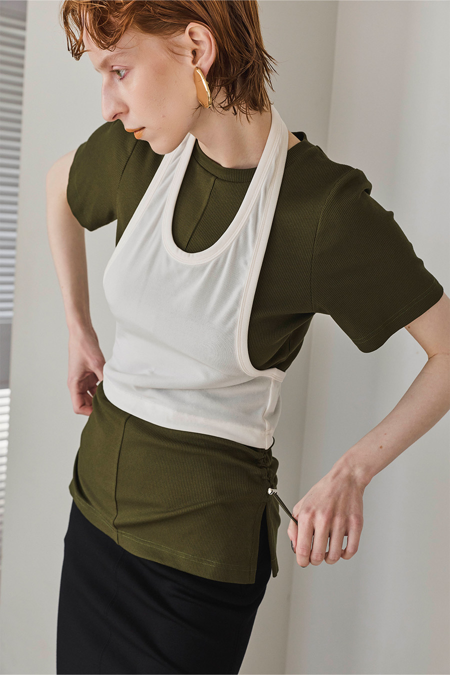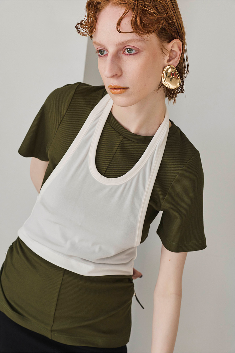 ホルターネックビスチェはシアー感と微光沢のあるキュプラ素材を使用し、重ねてきた時の濃淡のコントラストもモードな印象に。