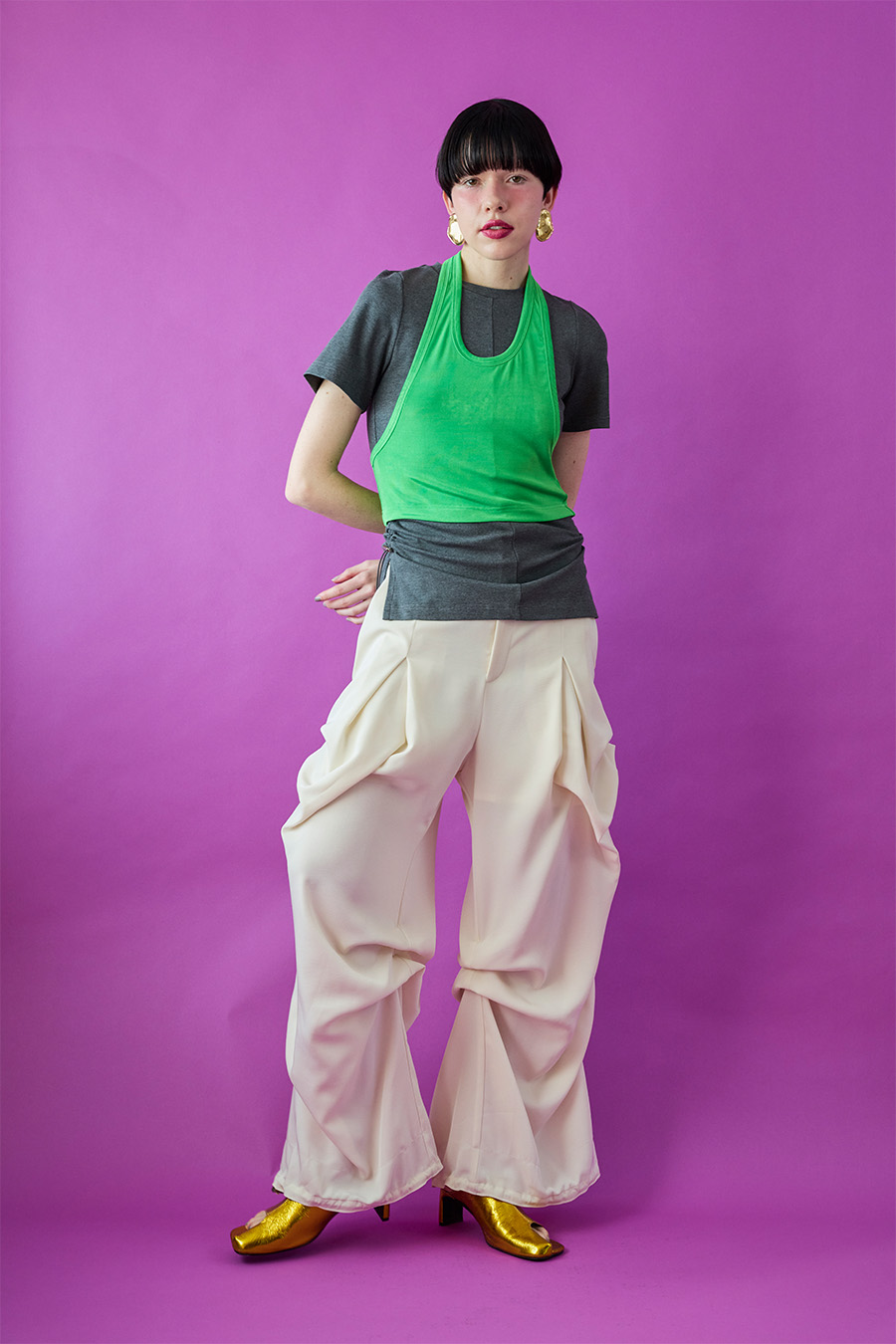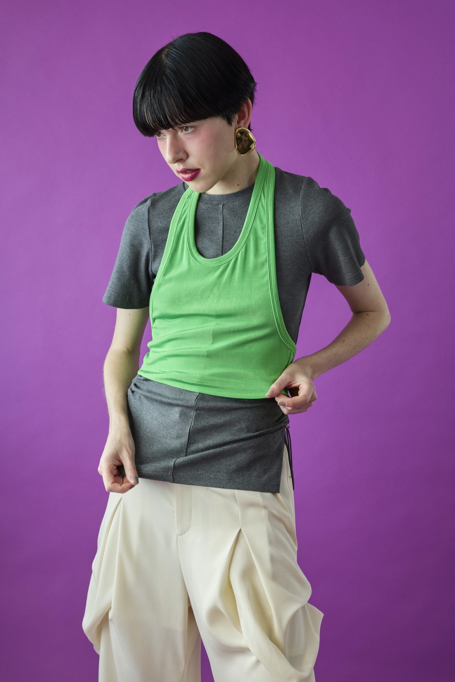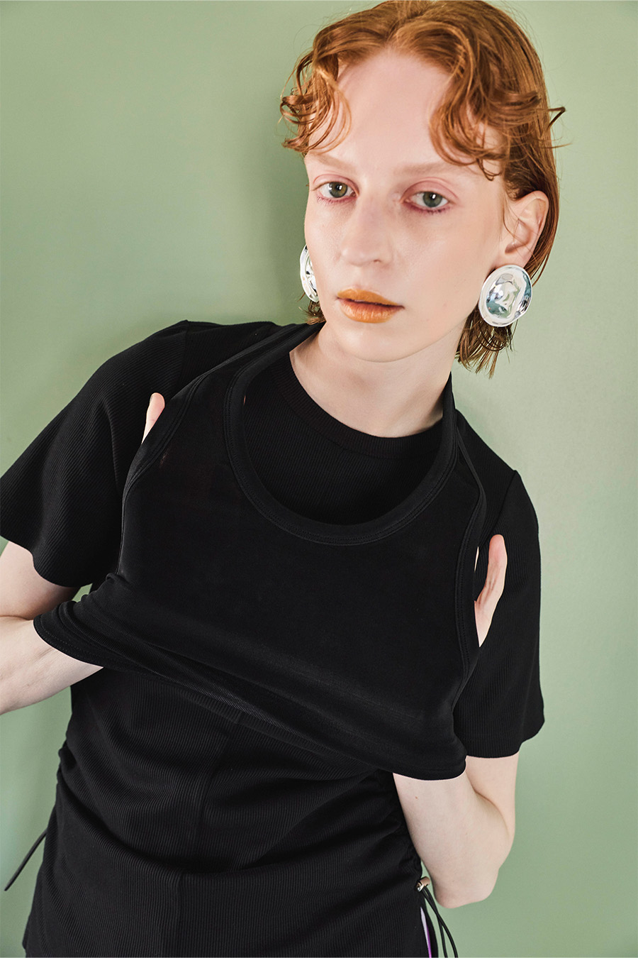 ホルターネックビスチェはシアー感と微光沢のあるキュプラ素材を使用し、重ねてきた時の濃淡のコントラストもモードな印象に。