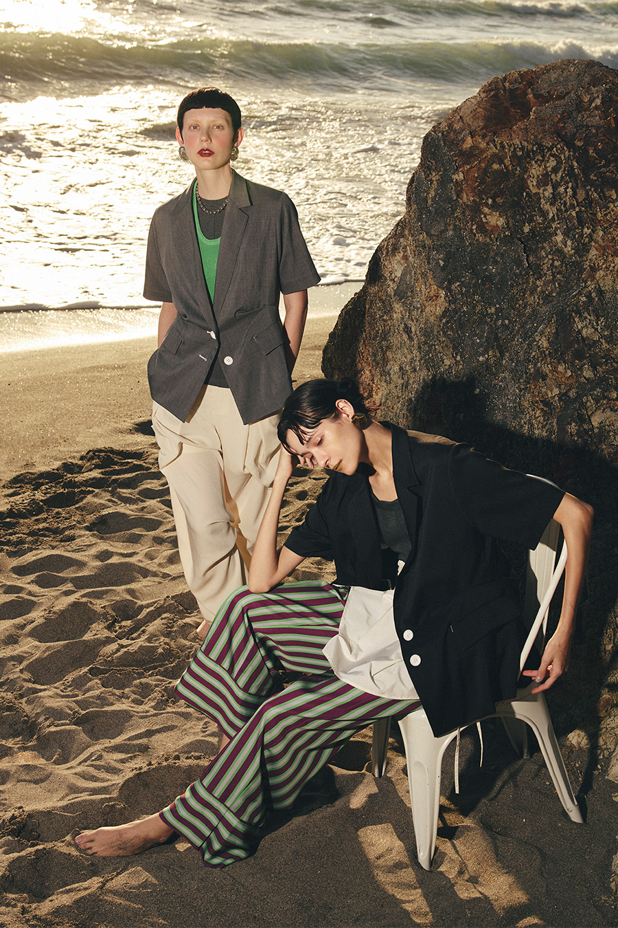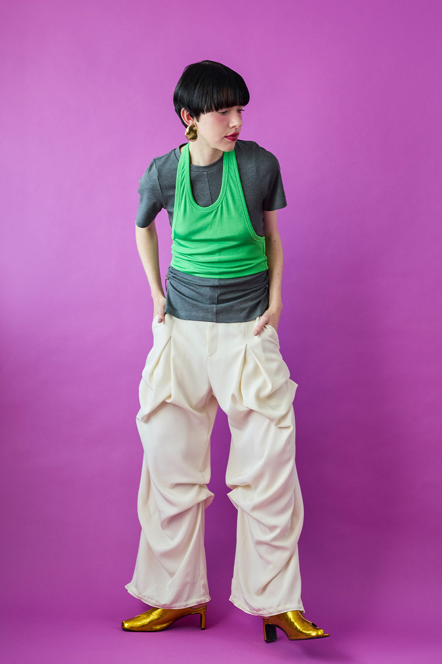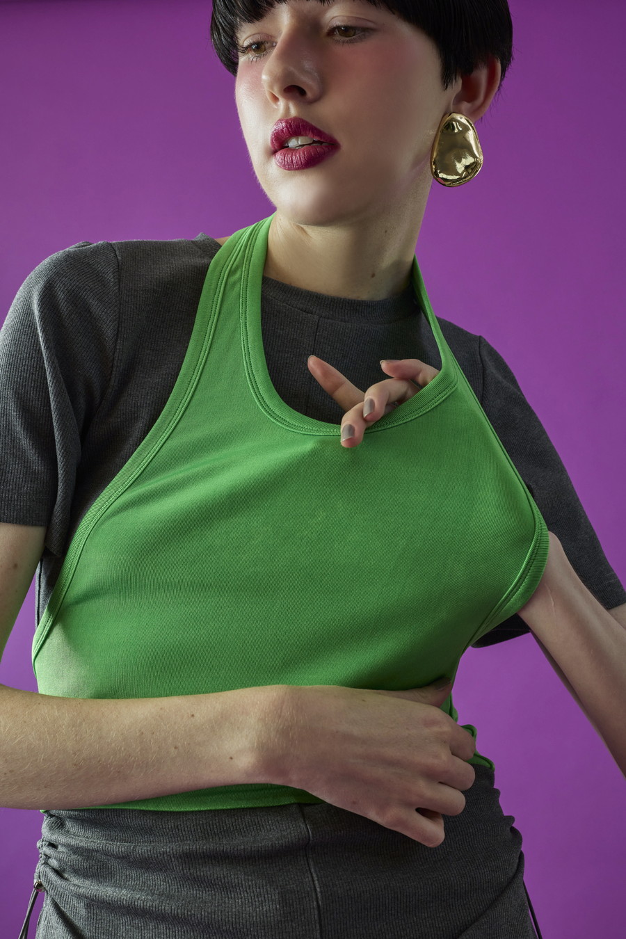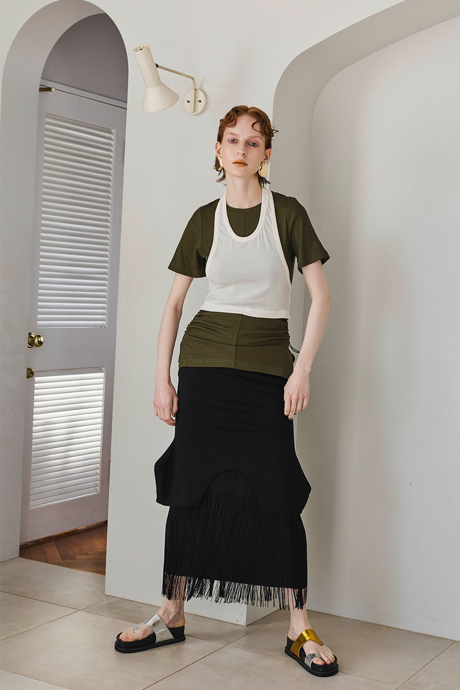 ホルターネックビスチェはシアー感と微光沢のあるキュプラ素材を使用し、重ねてきた時の濃淡のコントラストもモードな印象に。