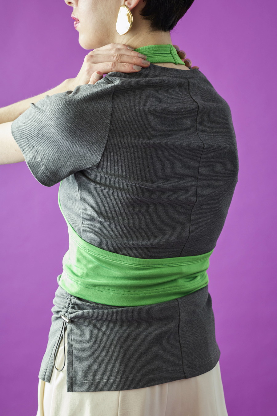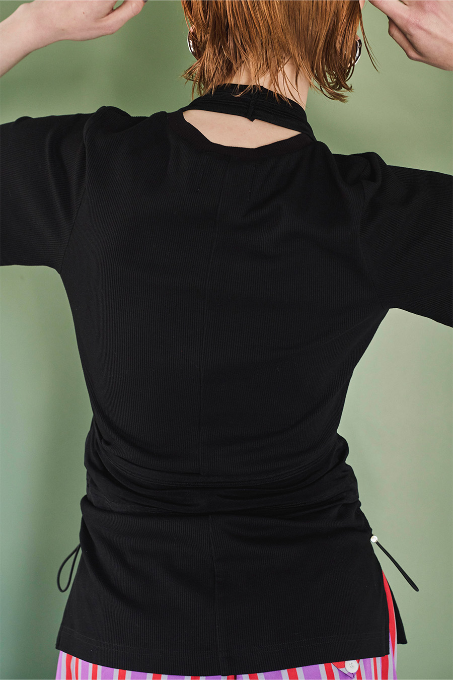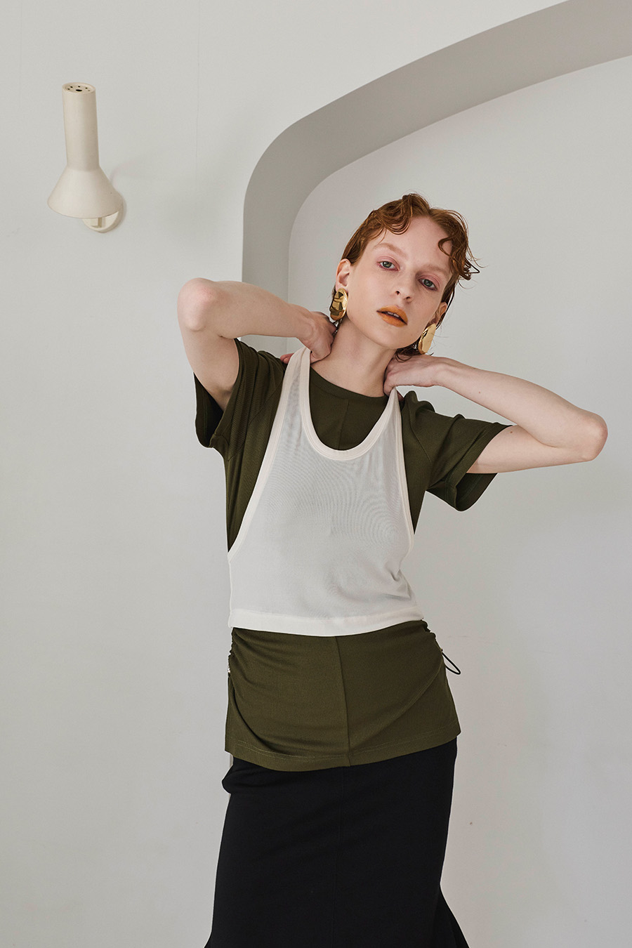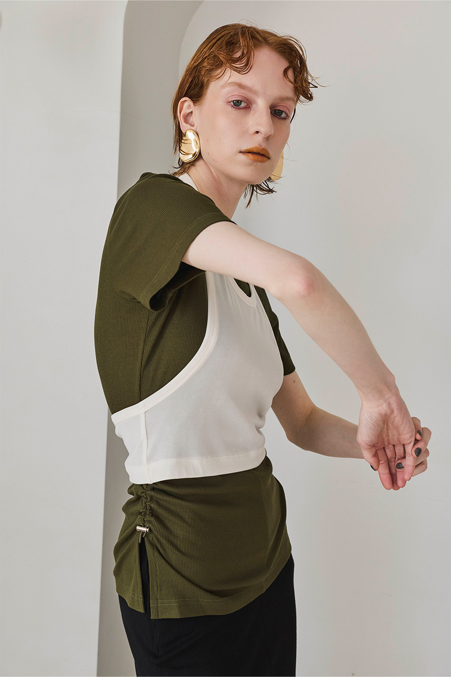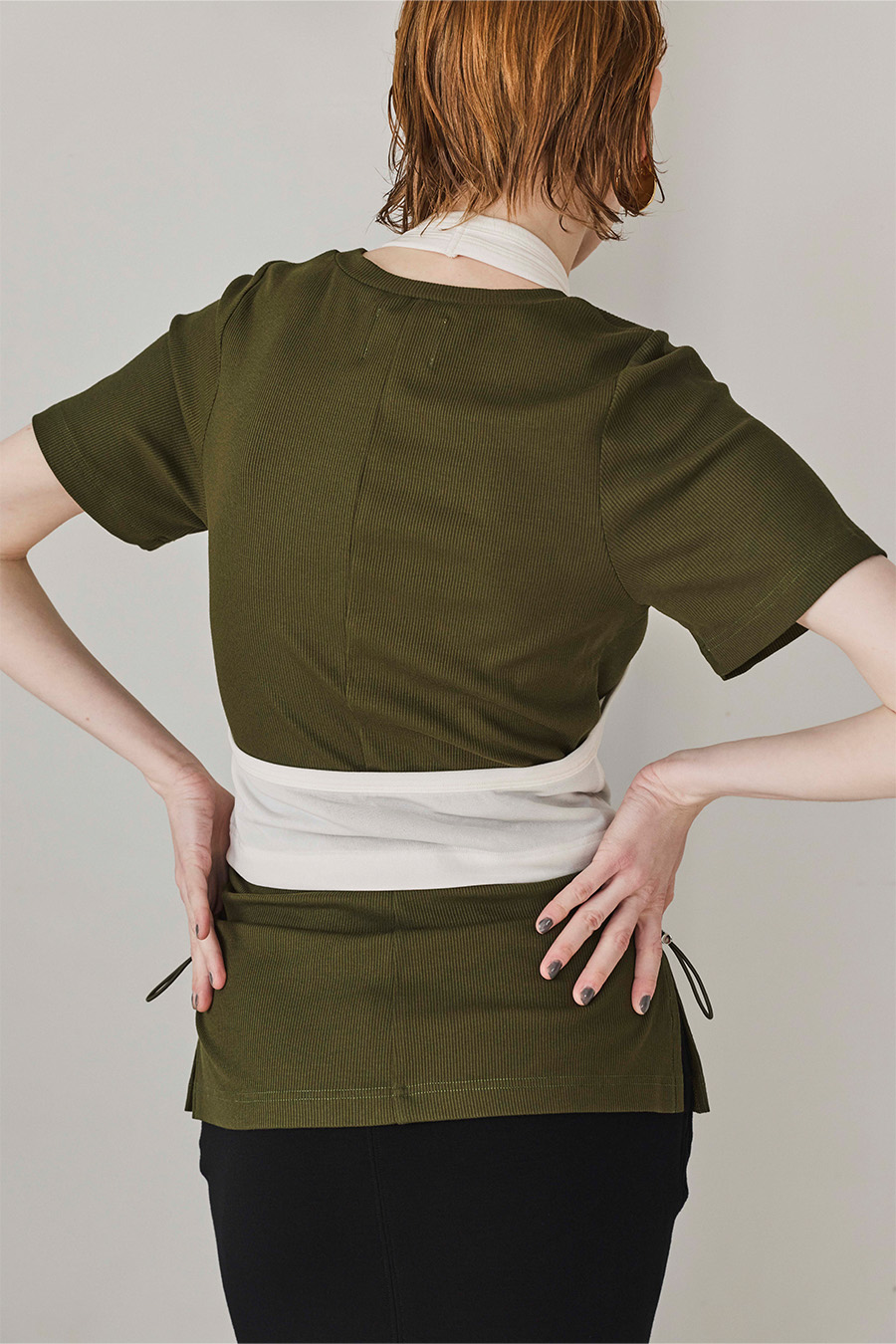 OMMOらしい配色が目を惹くレイヤードTシャツ。Tシャツはストレッチ性の高いレーヨンリブ素材を使用し、サイドのギャザーでウエスト周りをカバーし着丈もも調節していただけます。