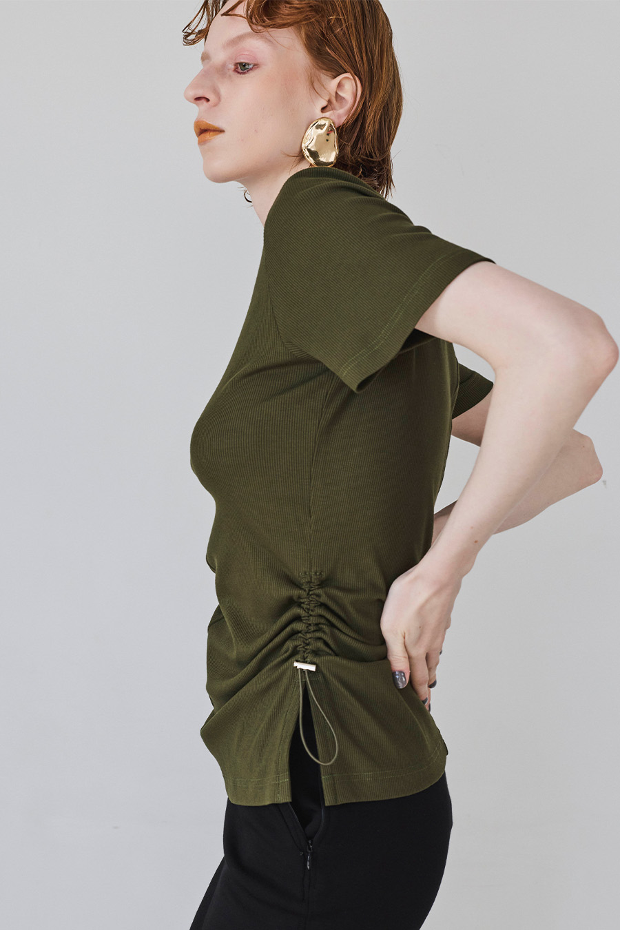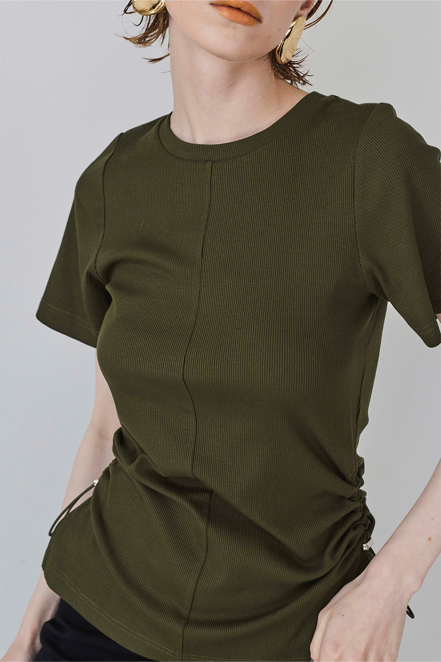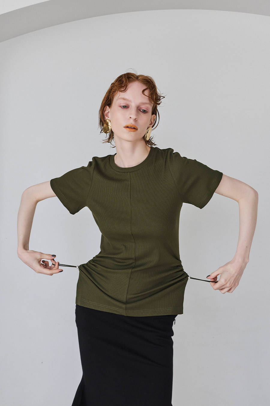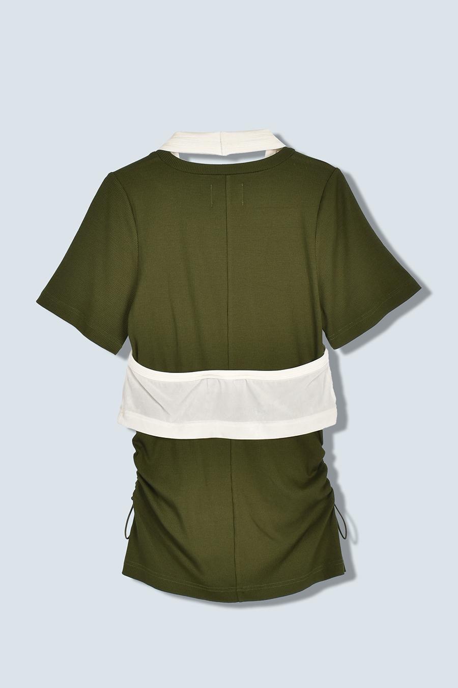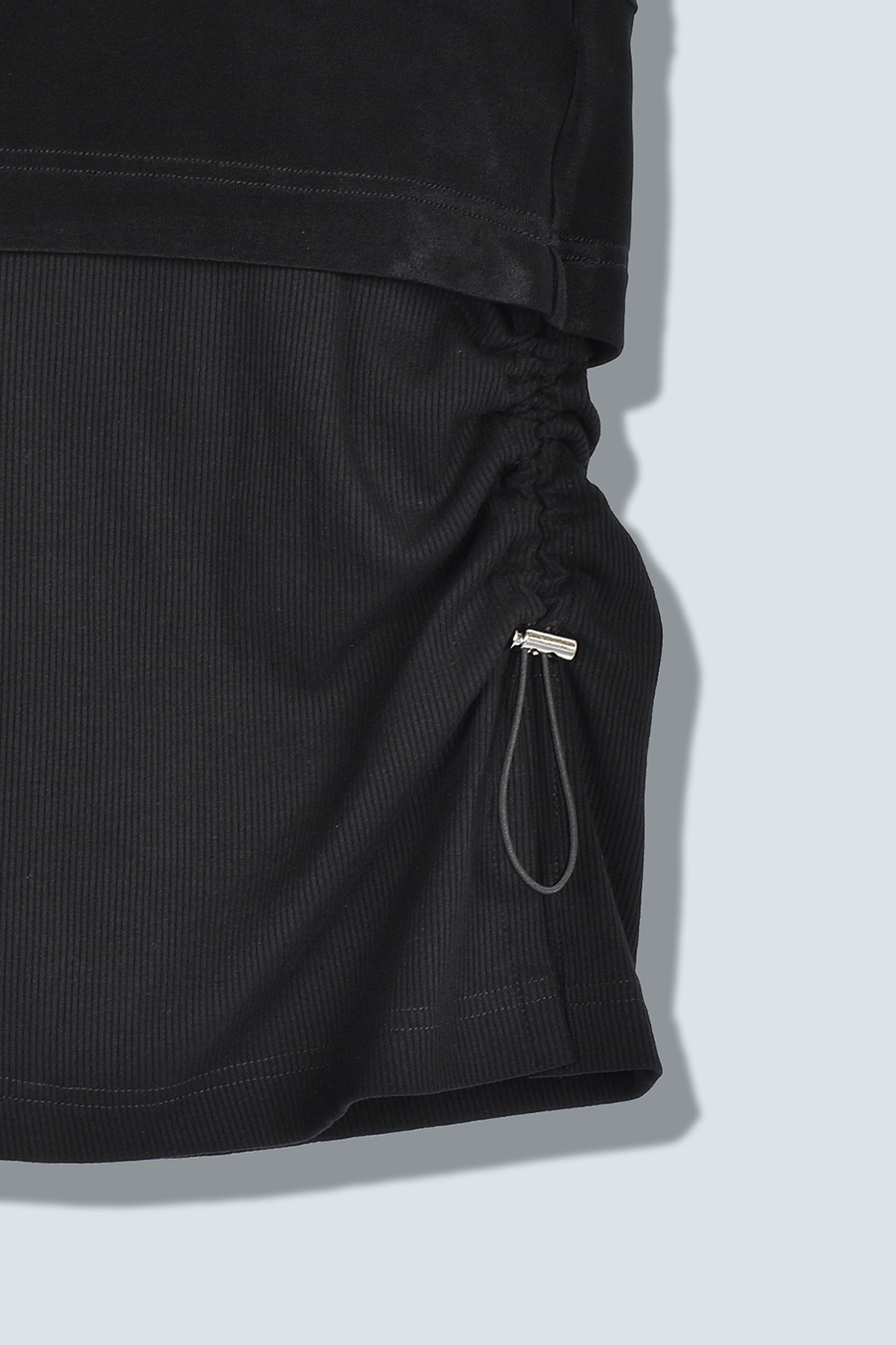 OMMOらしい配色が目を惹くレイヤードTシャツ。Tシャツはストレッチ性の高いレーヨンリブ素材を使用し、サイドのギャザーでウエスト周りをカバーし着丈もも調節していただけます。