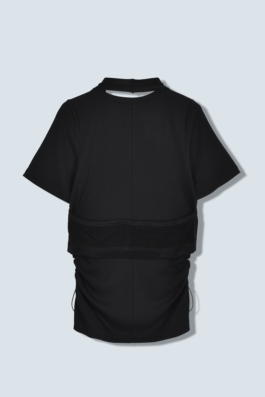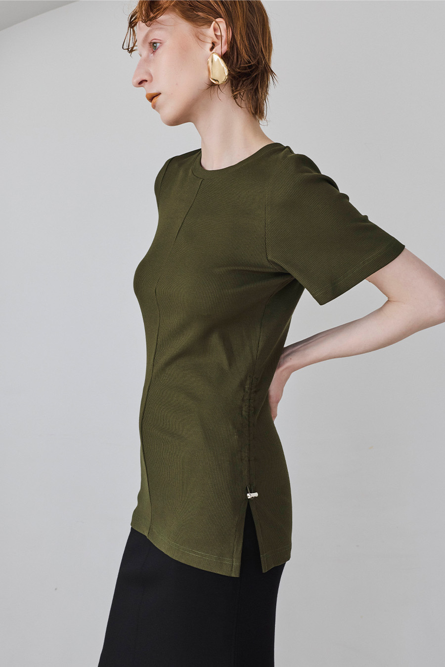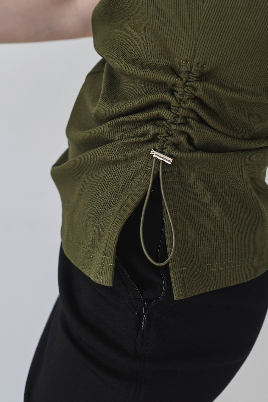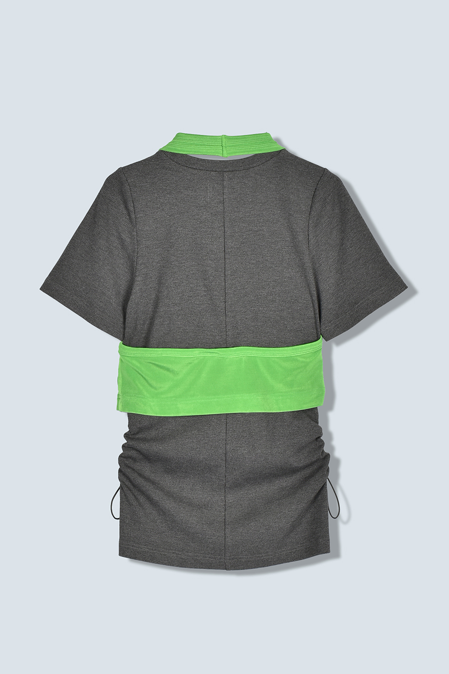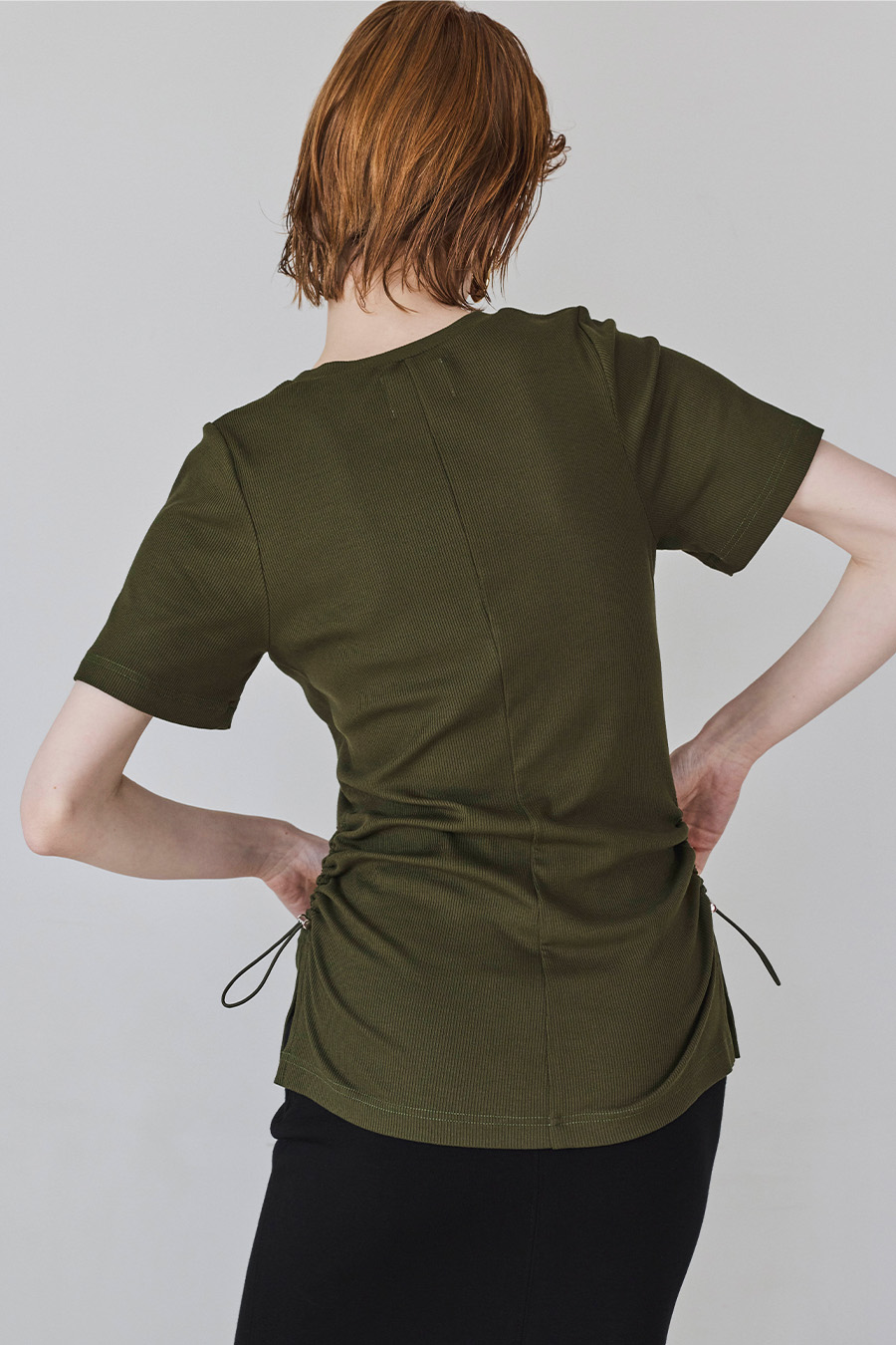 OMMOらしい配色が目を惹くレイヤードTシャツ。Tシャツはストレッチ性の高いレーヨンリブ素材を使用し、サイドのギャザーでウエスト周りをカバーし着丈もも調節していただけます。