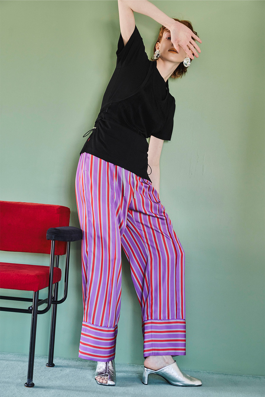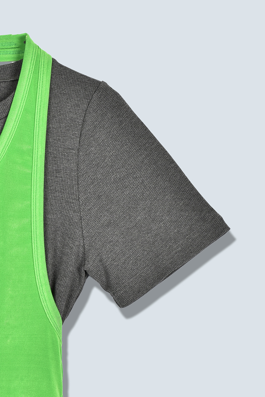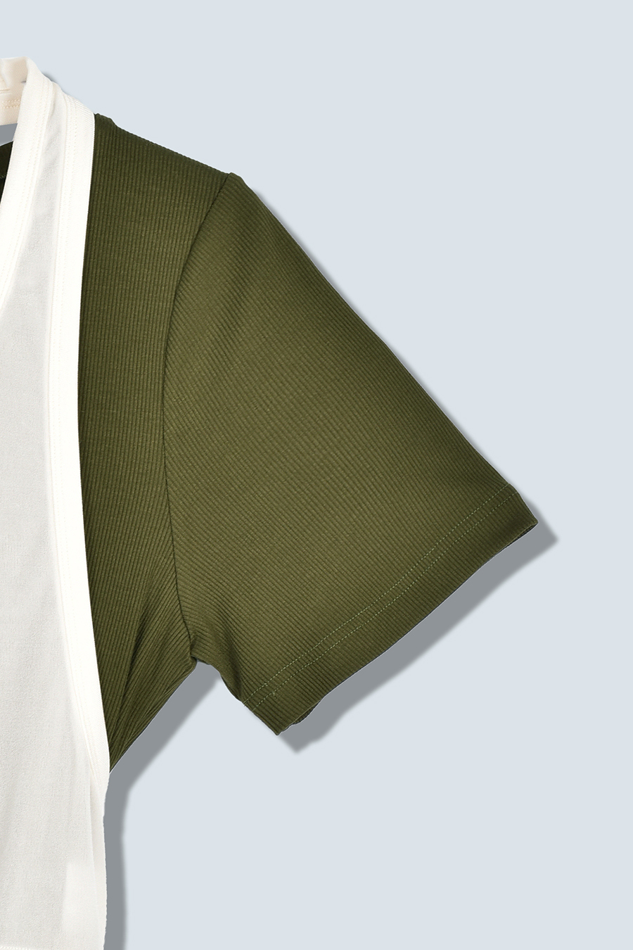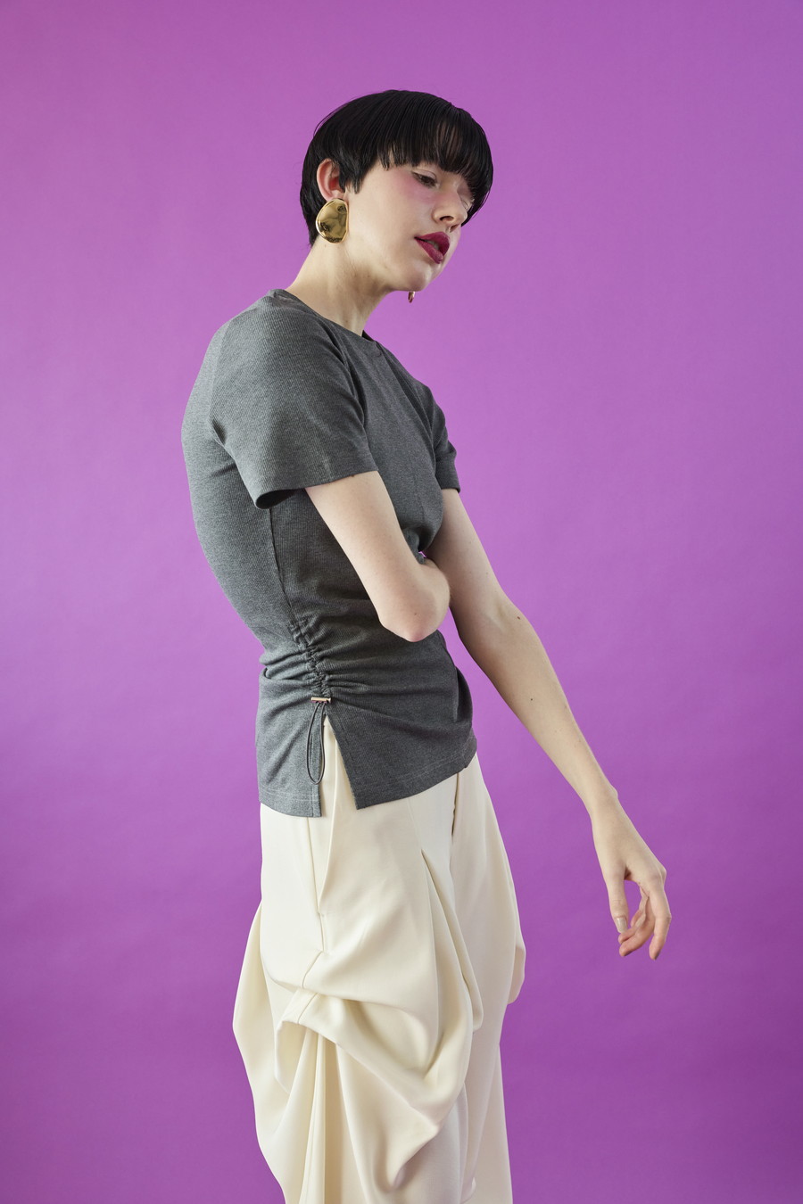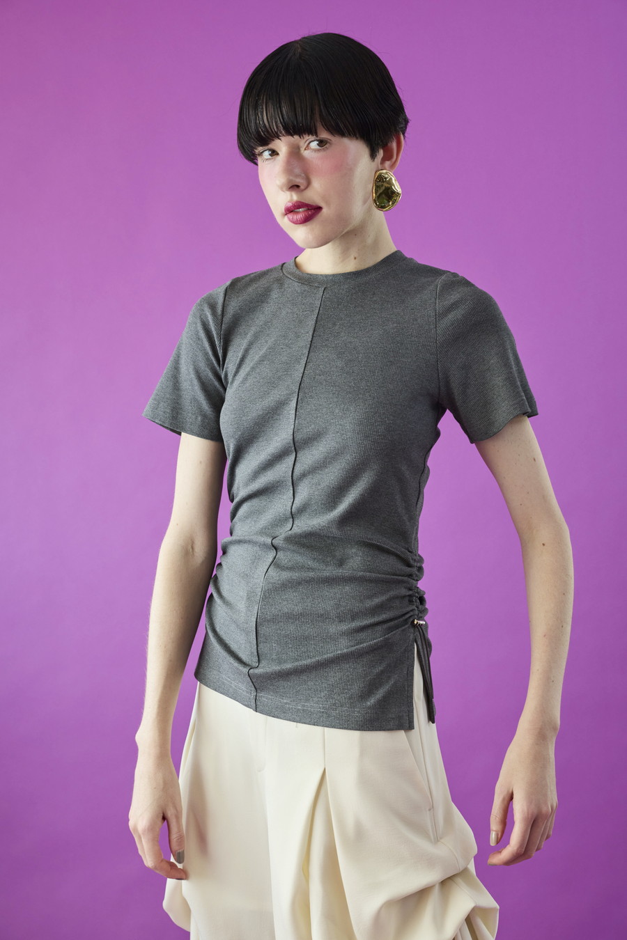 OMMOらしい配色が目を惹くレイヤードTシャツ。Tシャツはストレッチ性の高いレーヨンリブ素材を使用し、サイドのギャザーでウエスト周りをカバーし着丈もも調節していただけます。