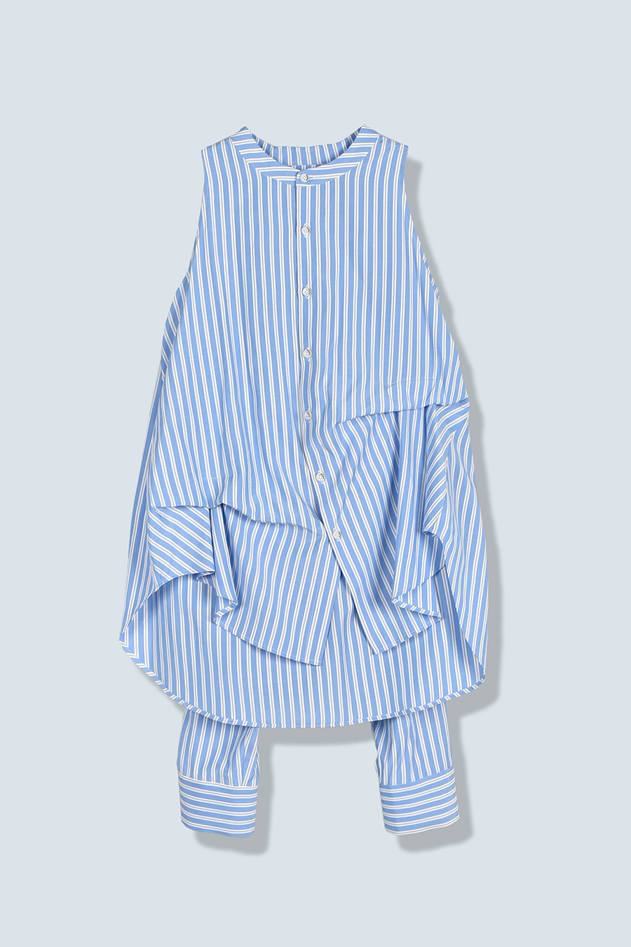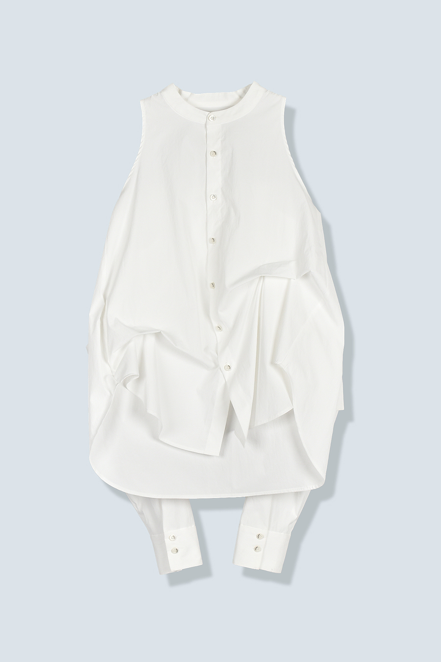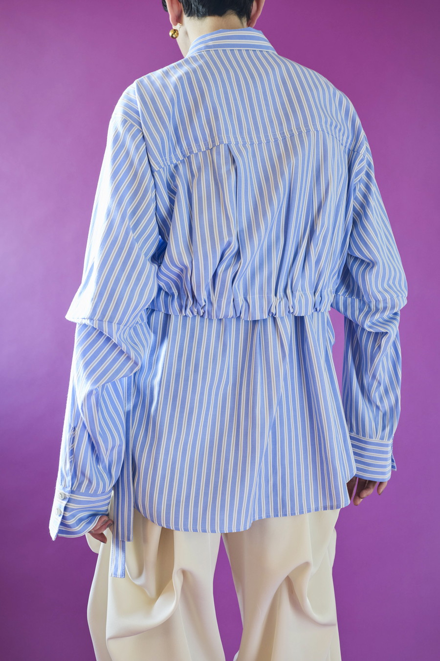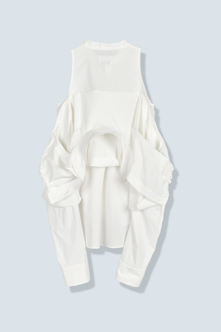 ノースリーブシャツとショート丈の長袖シャツをドッキングさせたユニークなデザインのタックシャツ。長袖シャッツをレイヤードして着たり、ノースリーブとして長袖部分を背中に垂らしたまま着たり、フロントで袖を結んだり様々な着こなしが出来る動きのあるデザインが特徴です。
