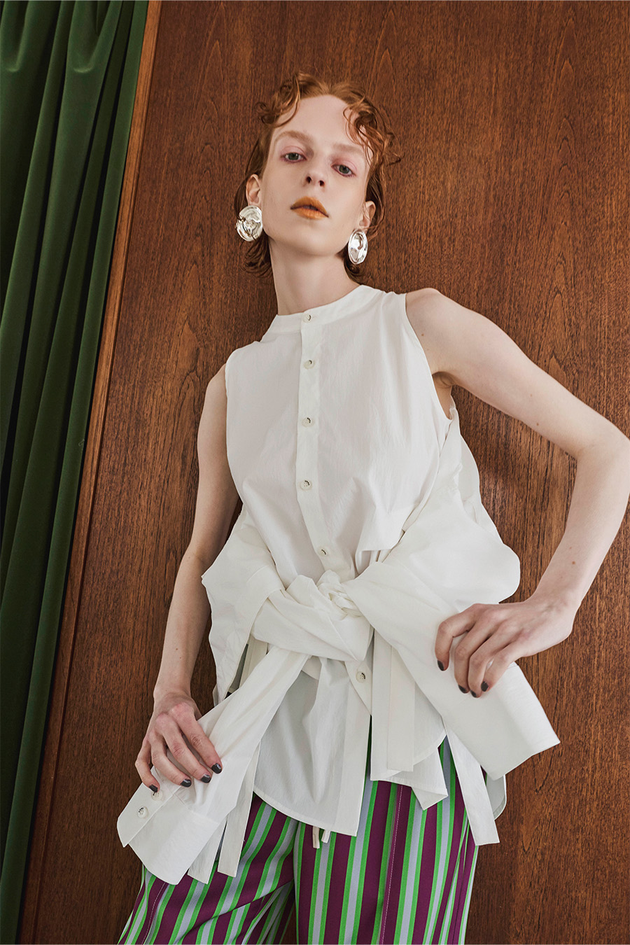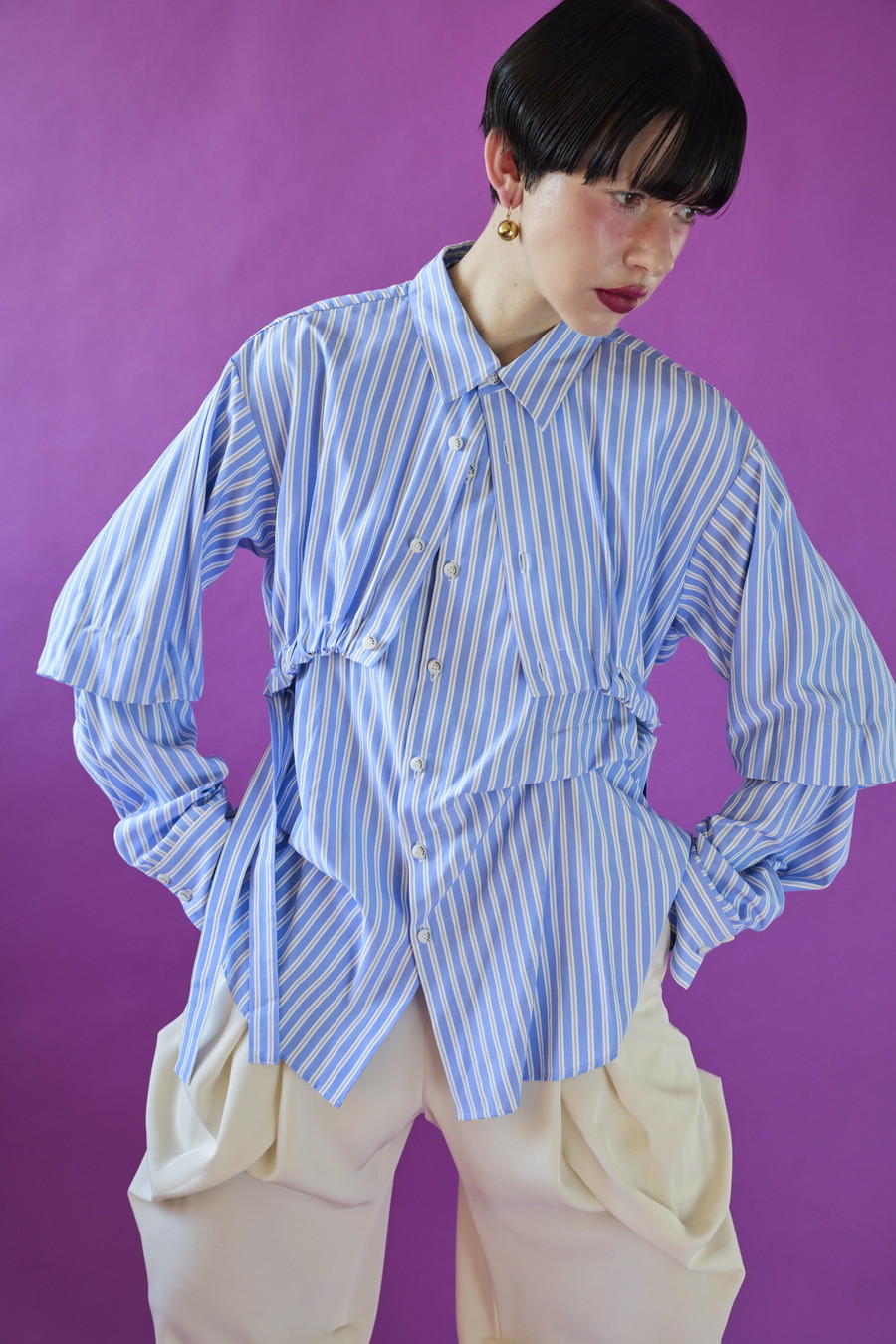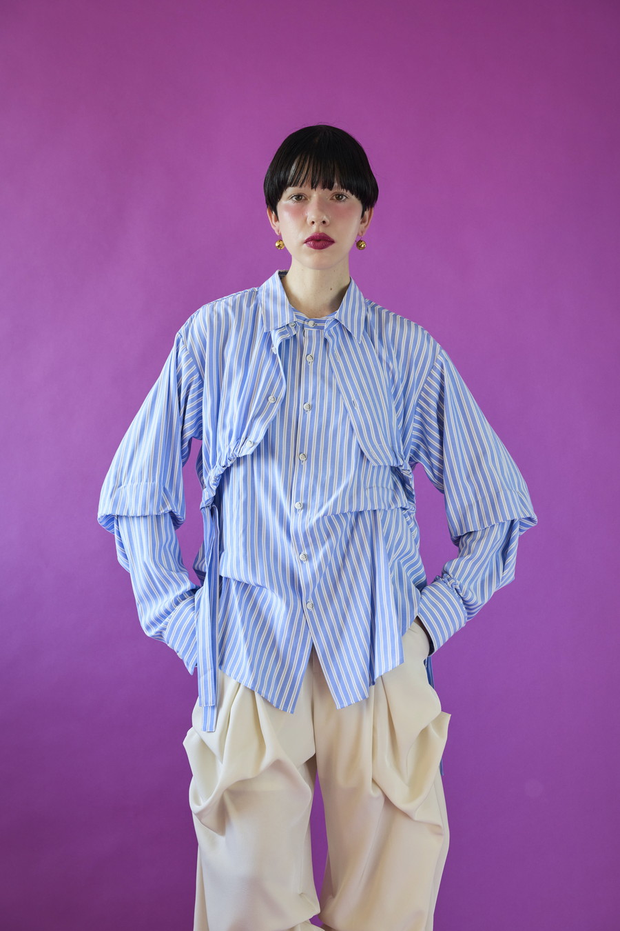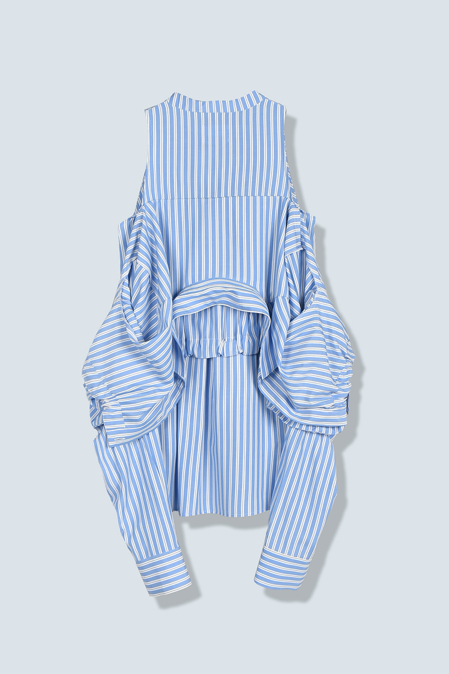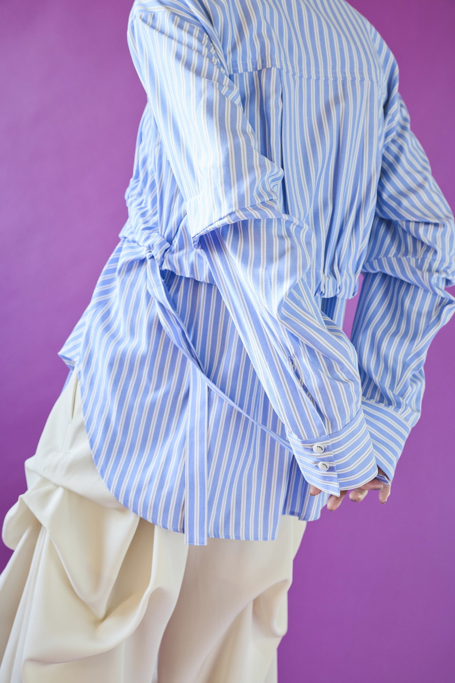 ノースリーブシャツとショート丈の長袖シャツをドッキングさせたユニークなデザインのタックシャツ。長袖シャッツをレイヤードして着たり、ノースリーブとして長袖部分を背中に垂らしたまま着たり、フロントで袖を結んだり様々な着こなしが出来る動きのあるデザインが特徴です。