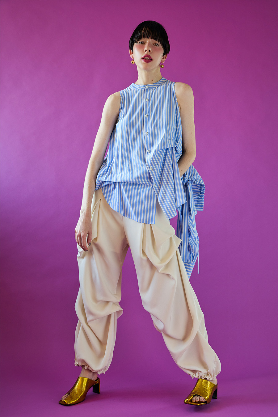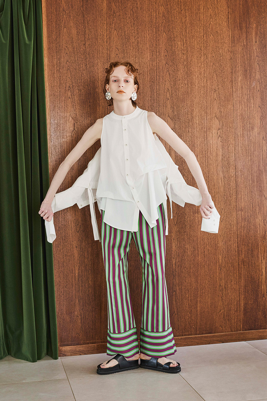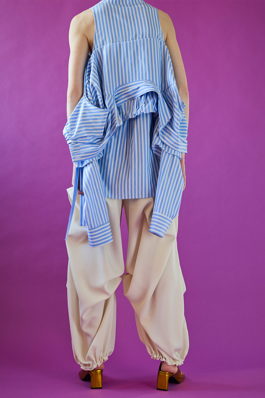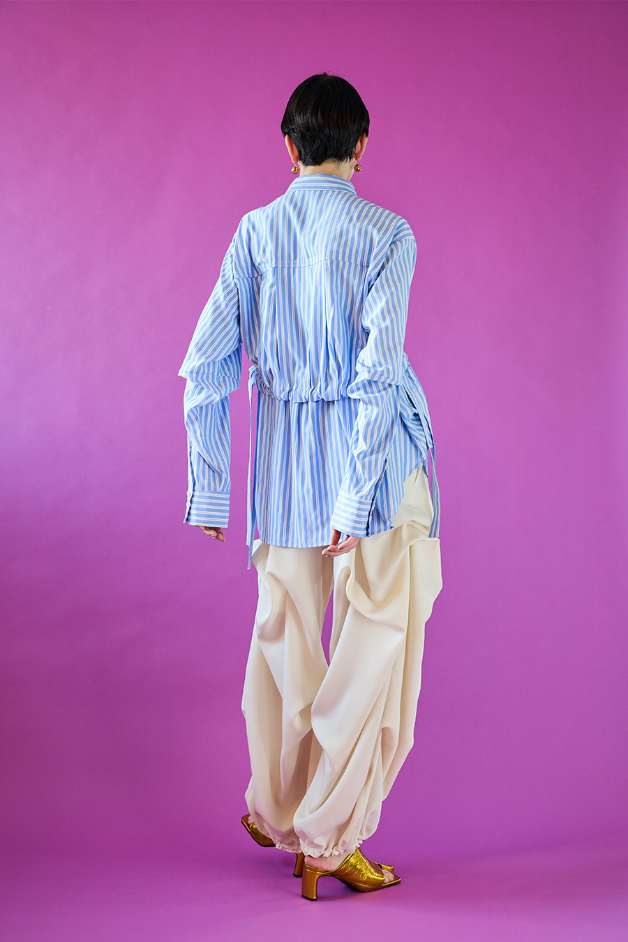 ノースリーブシャツとショート丈の長袖シャツをドッキングさせたユニークなデザインのタックシャツ。長袖シャッツをレイヤードして着たり、ノースリーブとして長袖部分を背中に垂らしたまま着たり、フロントで袖を結んだり様々な着こなしが出来る動きのあるデザインが特徴です。
