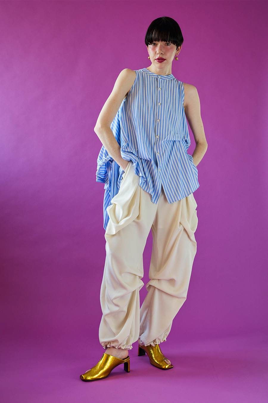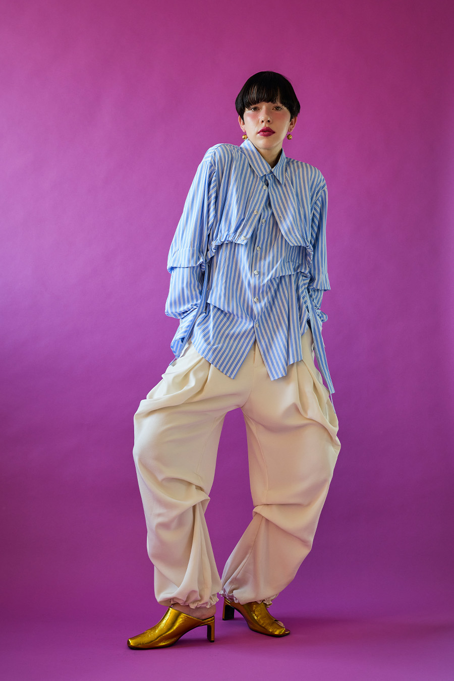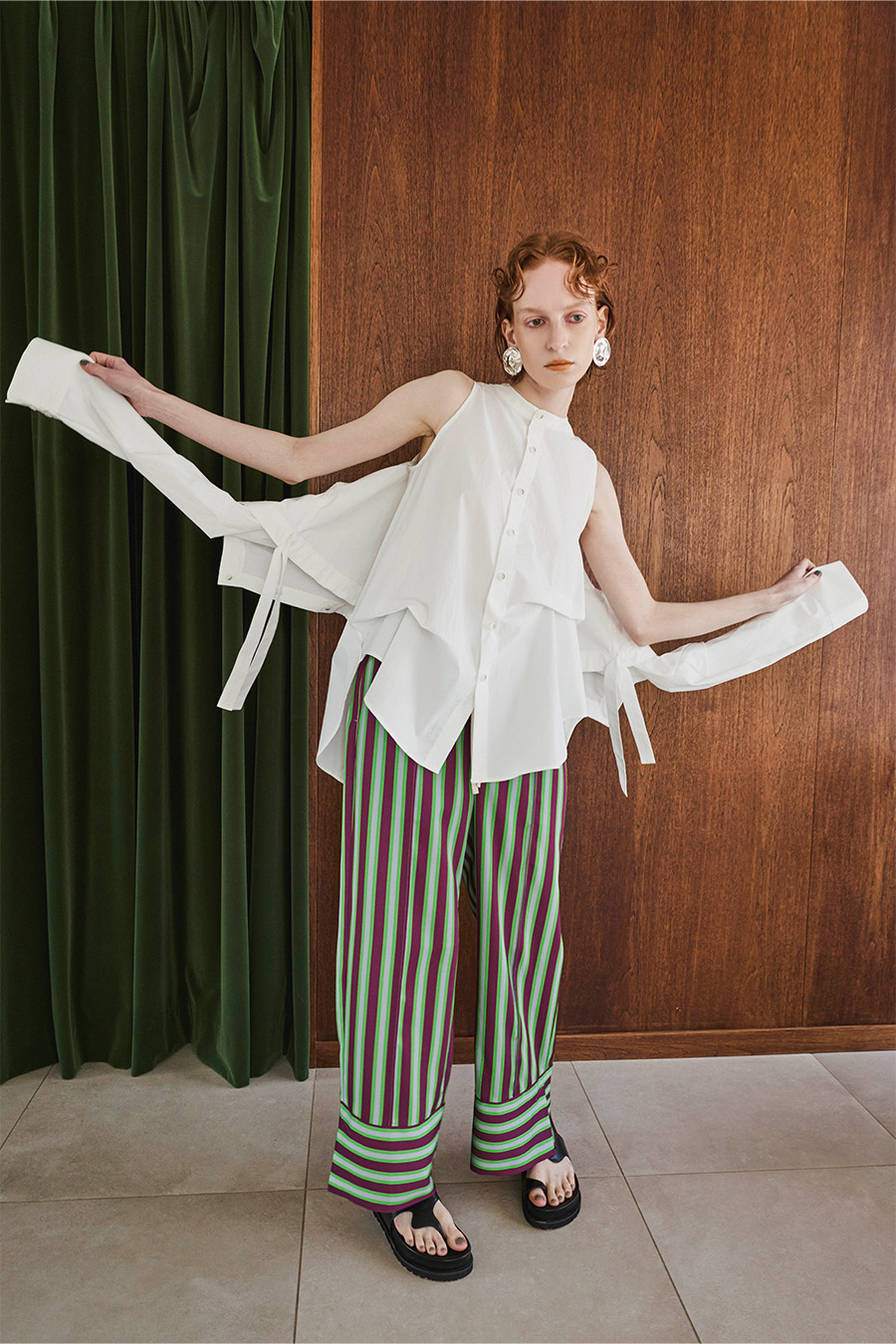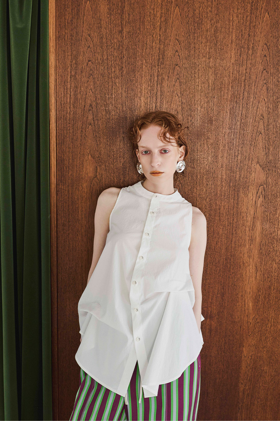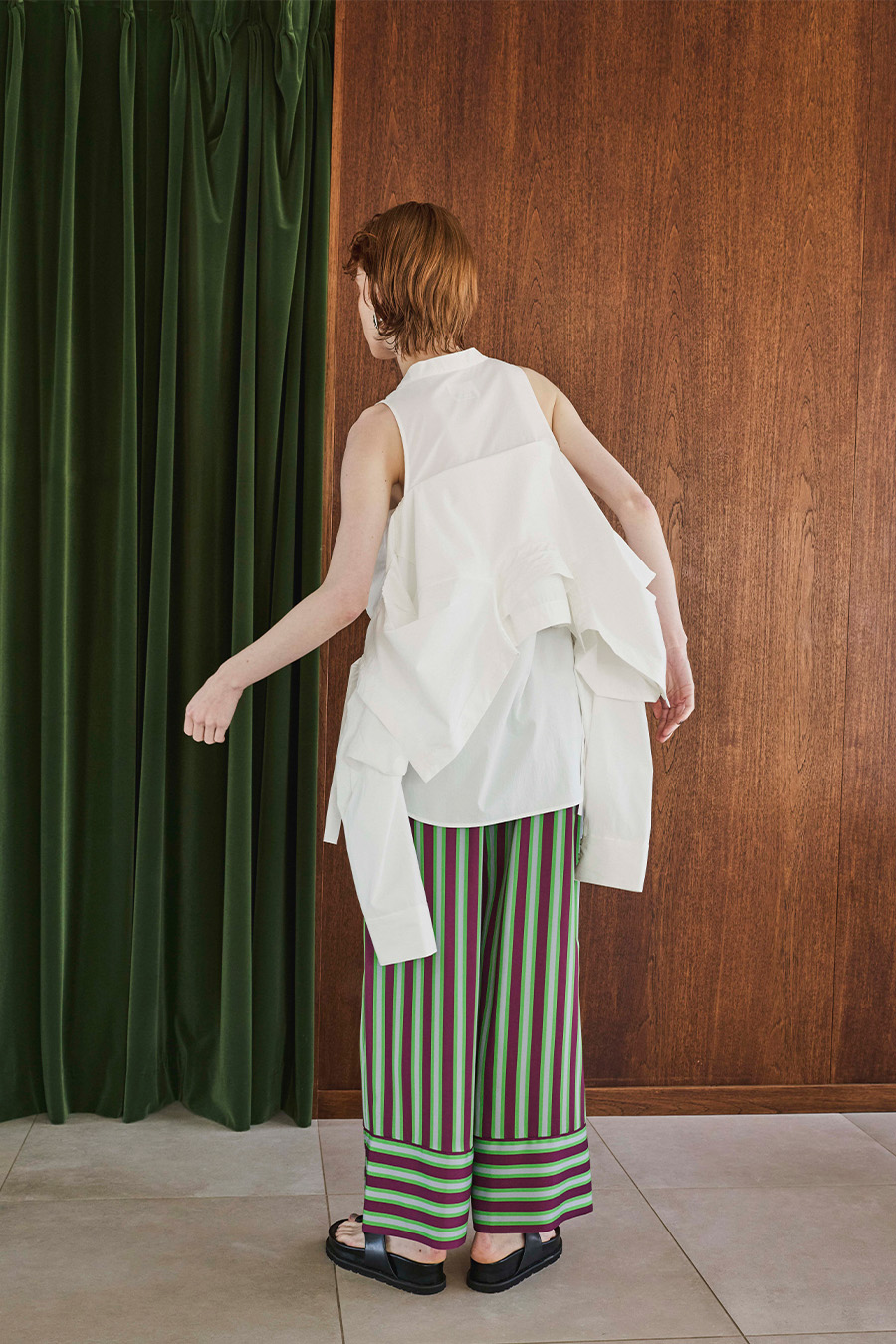 ノースリーブシャツとショート丈の長袖シャツをドッキングさせたユニークなデザインのタックシャツ。長袖シャッツをレイヤードして着たり、ノースリーブとして長袖部分を背中に垂らしたまま着たり、フロントで袖を結んだり様々な着こなしが出来る動きのあるデザインが特徴です。