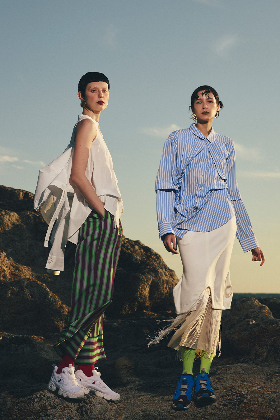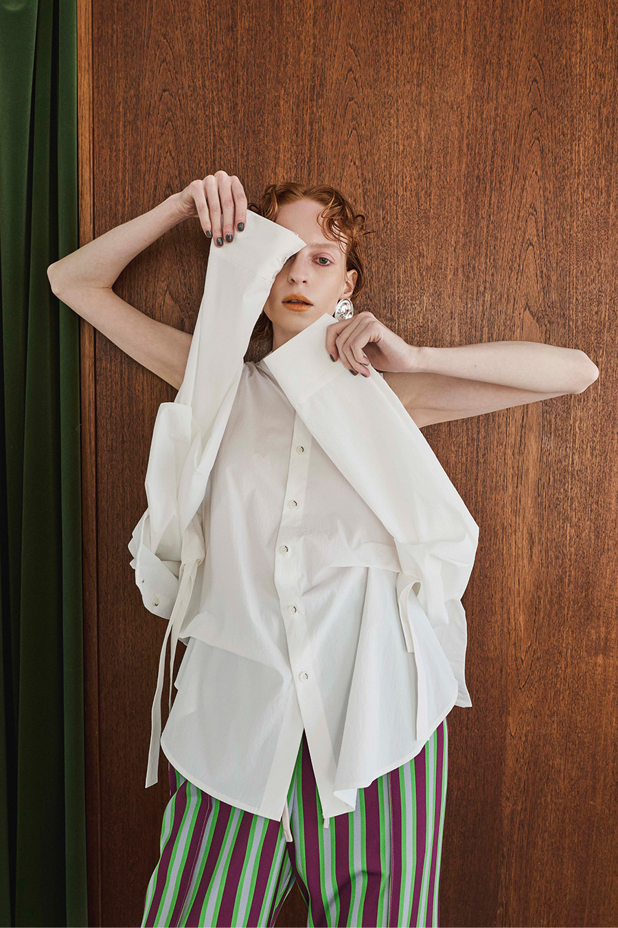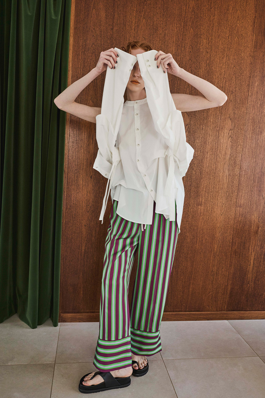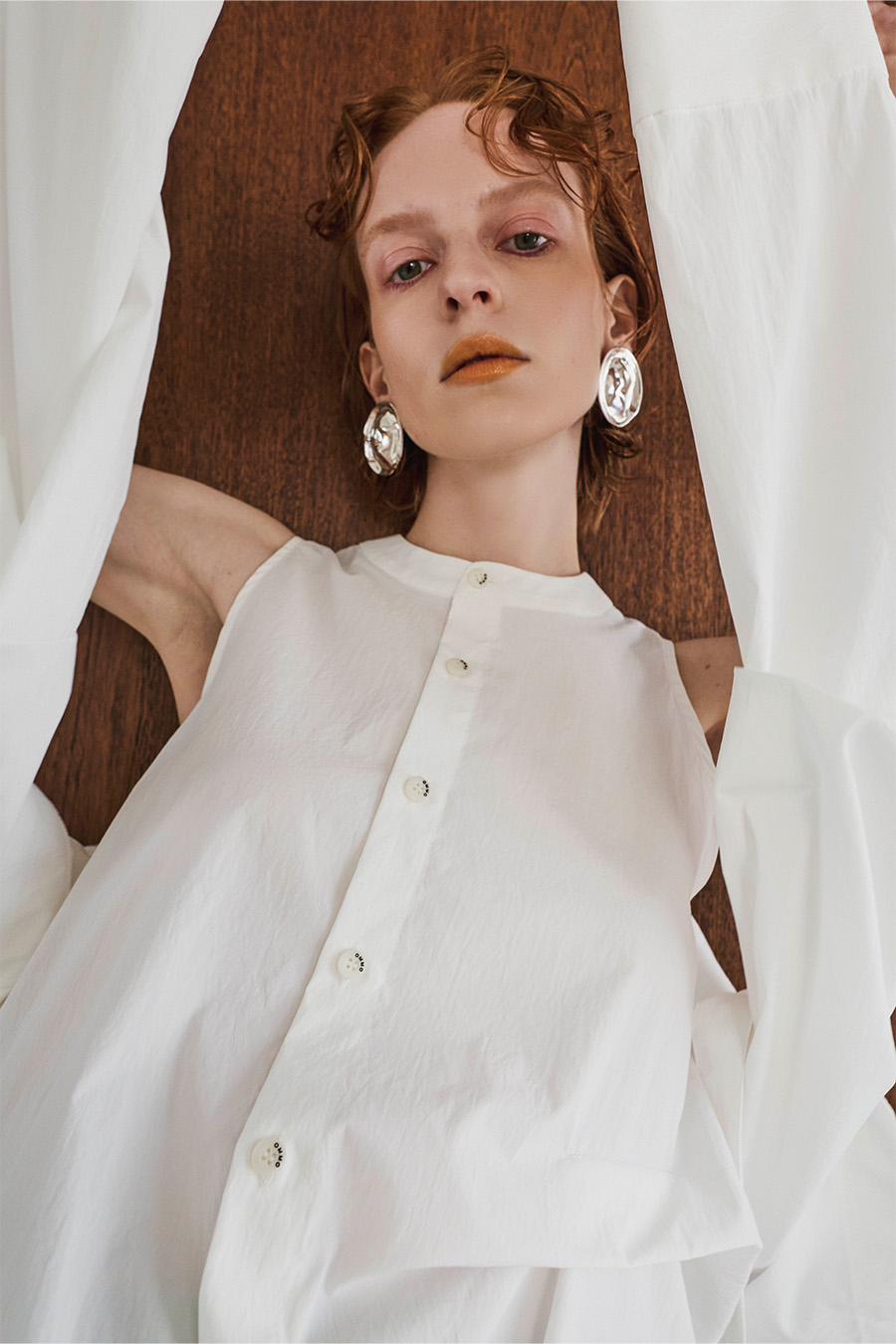 ノースリーブシャツとショート丈の長袖シャツをドッキングさせたユニークなデザインのタックシャツ。長袖シャッツをレイヤードして着たり、ノースリーブとして長袖部分を背中に垂らしたまま着たり、フロントで袖を結んだり様々な着こなしが出来る動きのあるデザインが特徴です。