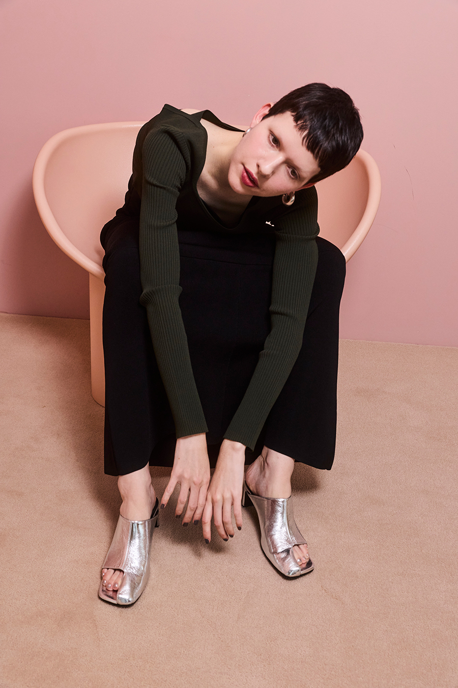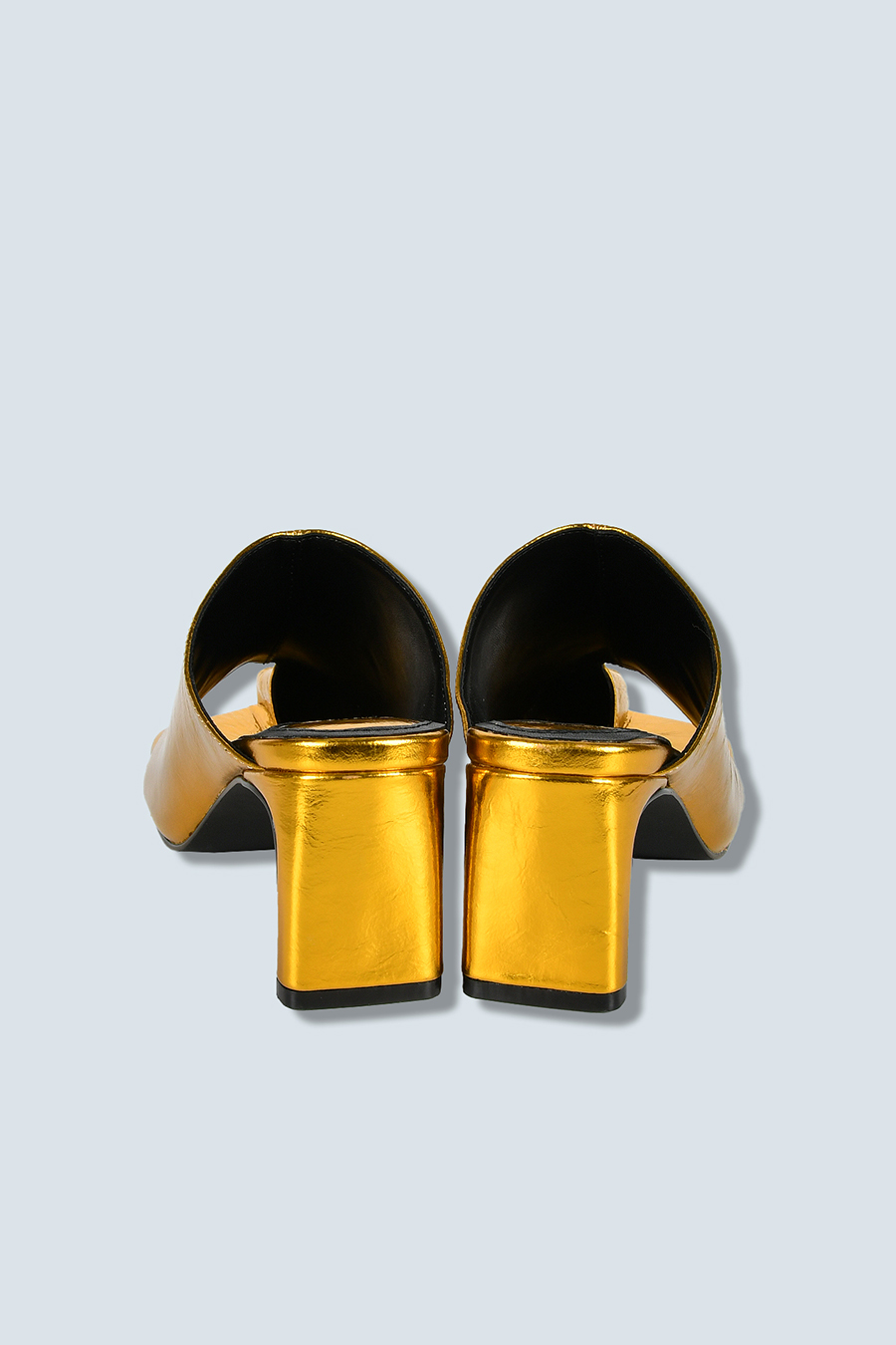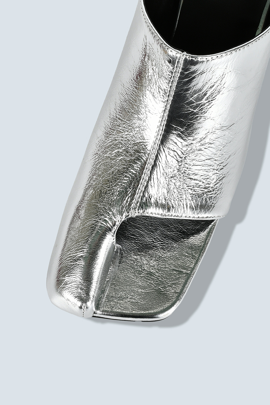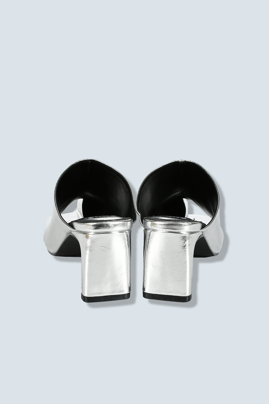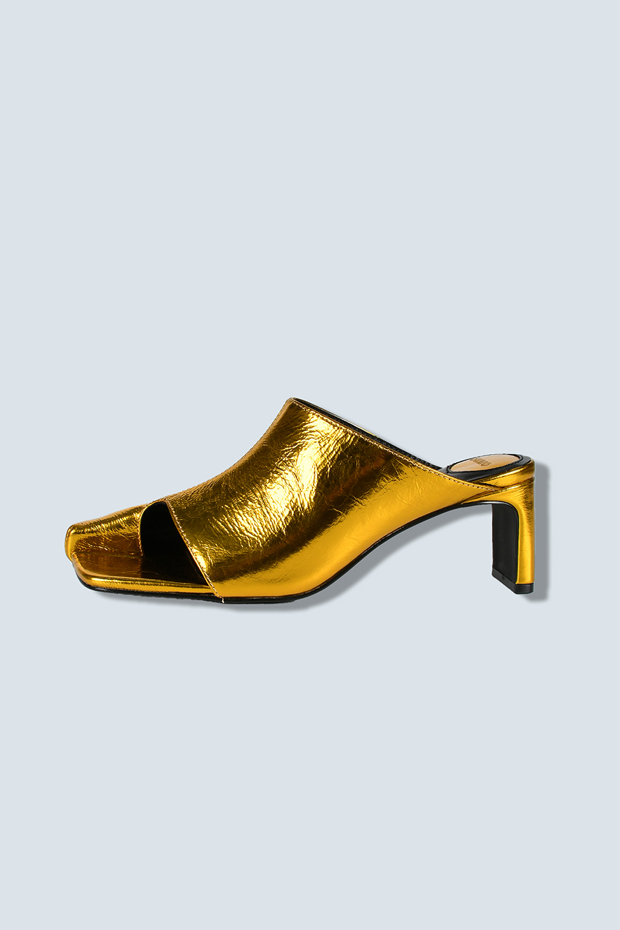 アシンメトリーなカッティングが目を引くミュール。つま先は程よく開いたデザインで、足元に抜け感と軽やかさをプラスし、モードな印象でスタイリングを引き立てます。