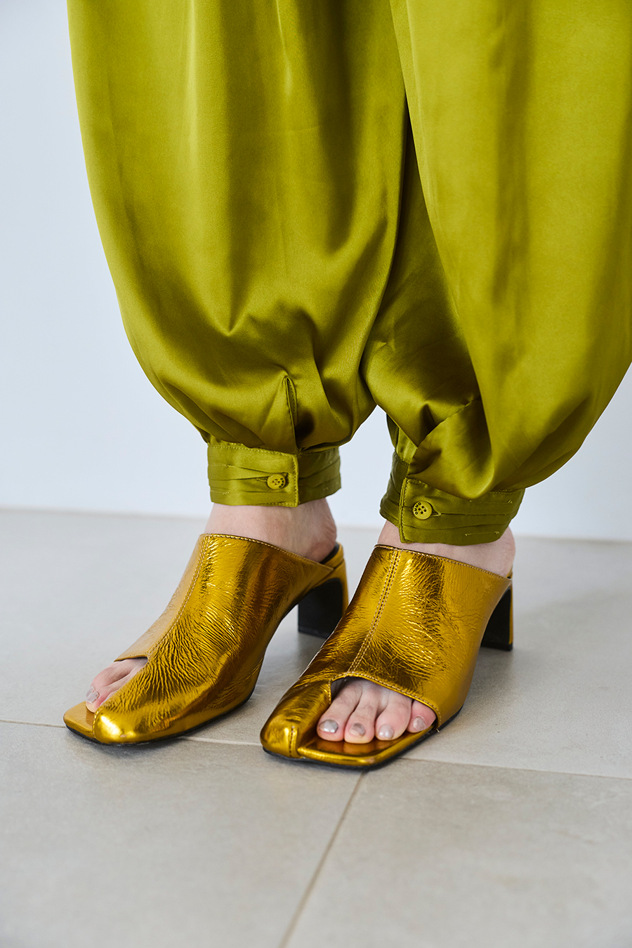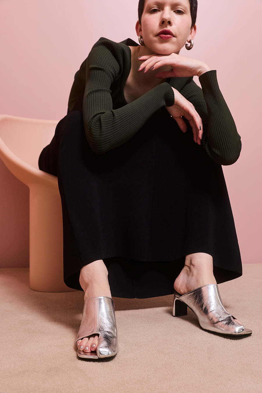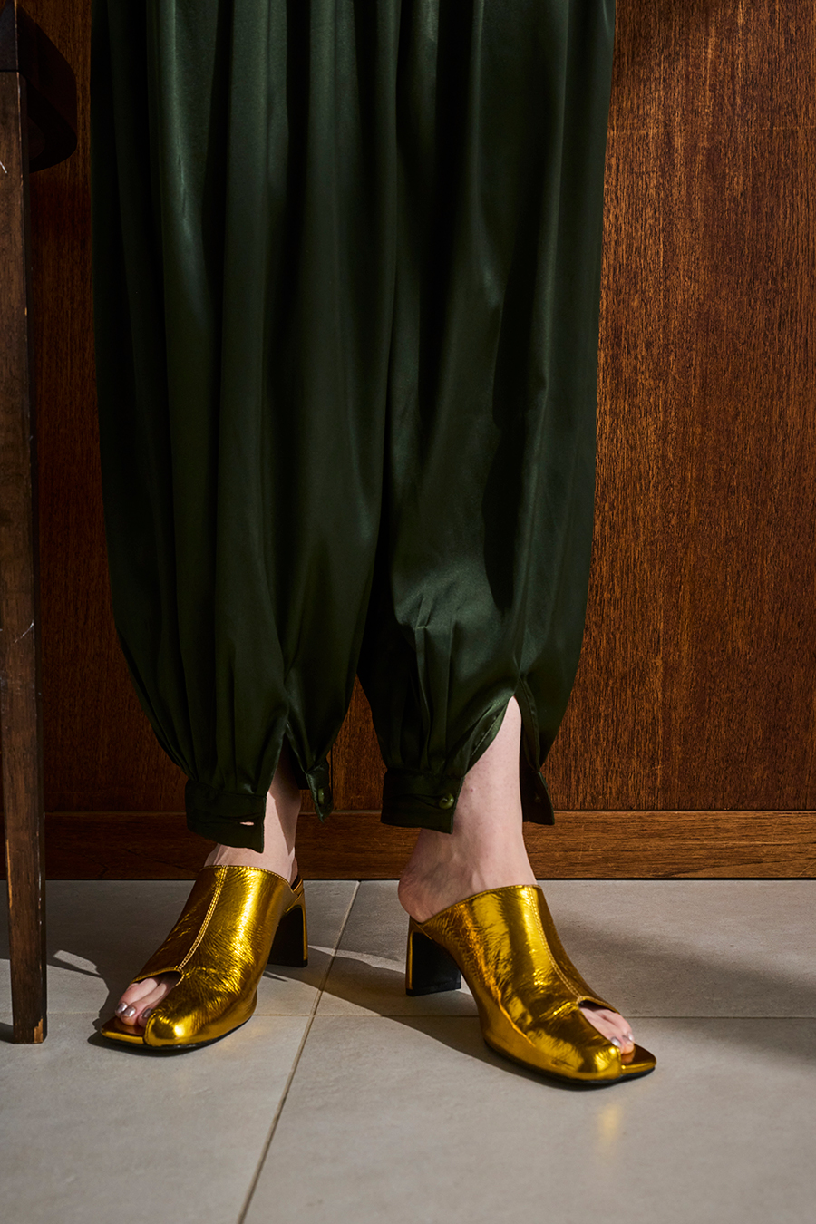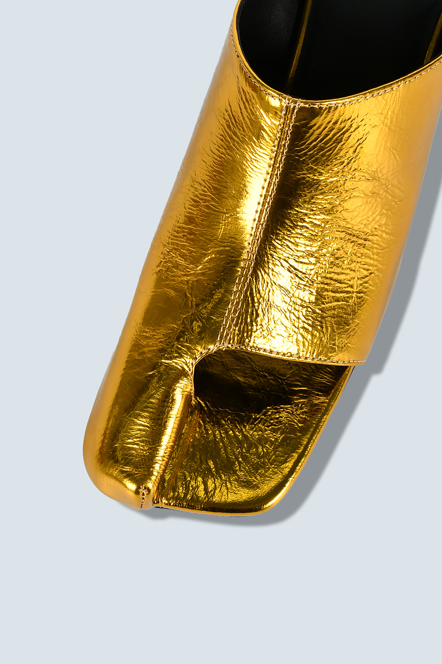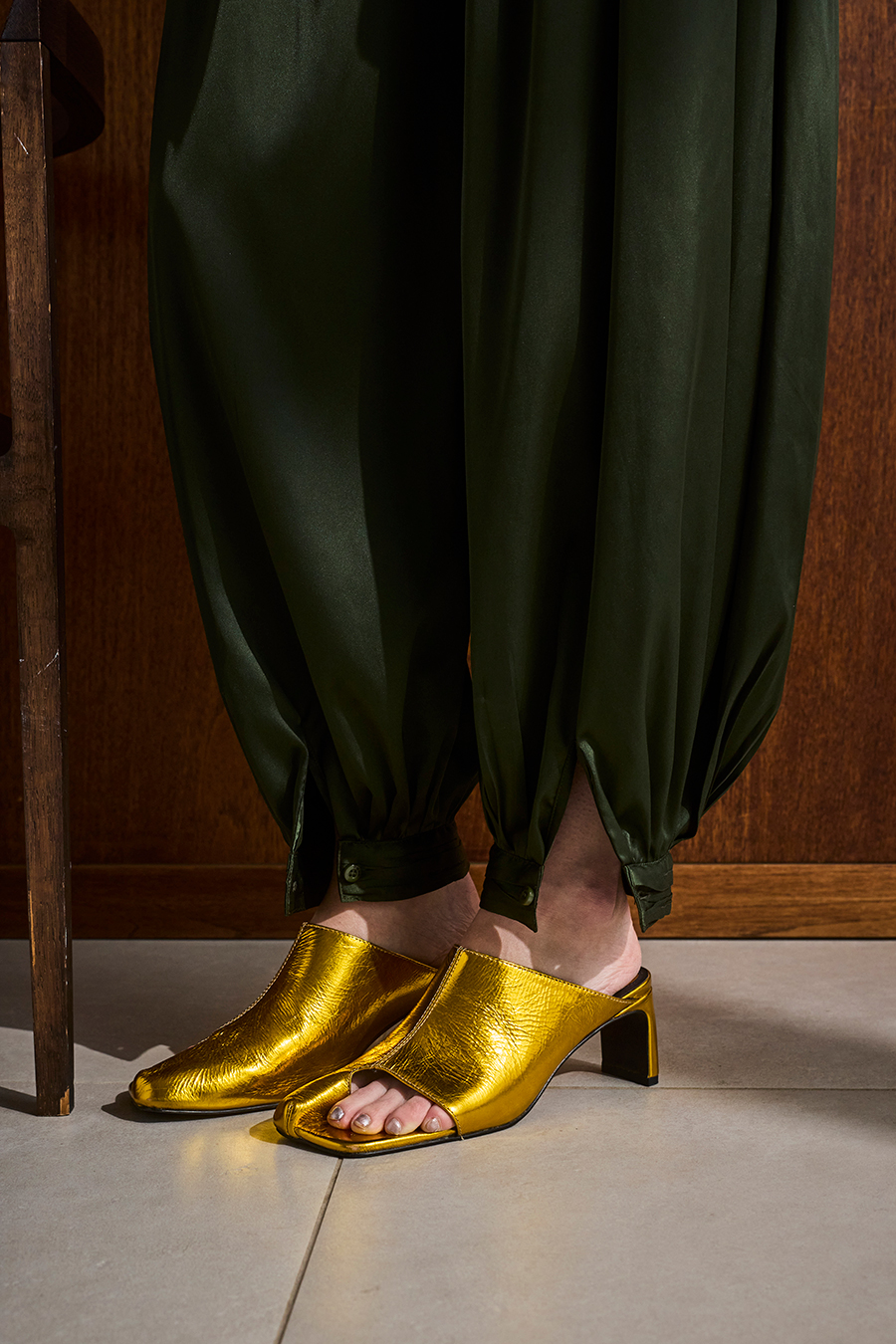 アシンメトリーなカッティングが目を引くミュール。つま先は程よく開いたデザインで、足元に抜け感と軽やかさをプラスし、モードな印象でスタイリングを引き立てます。