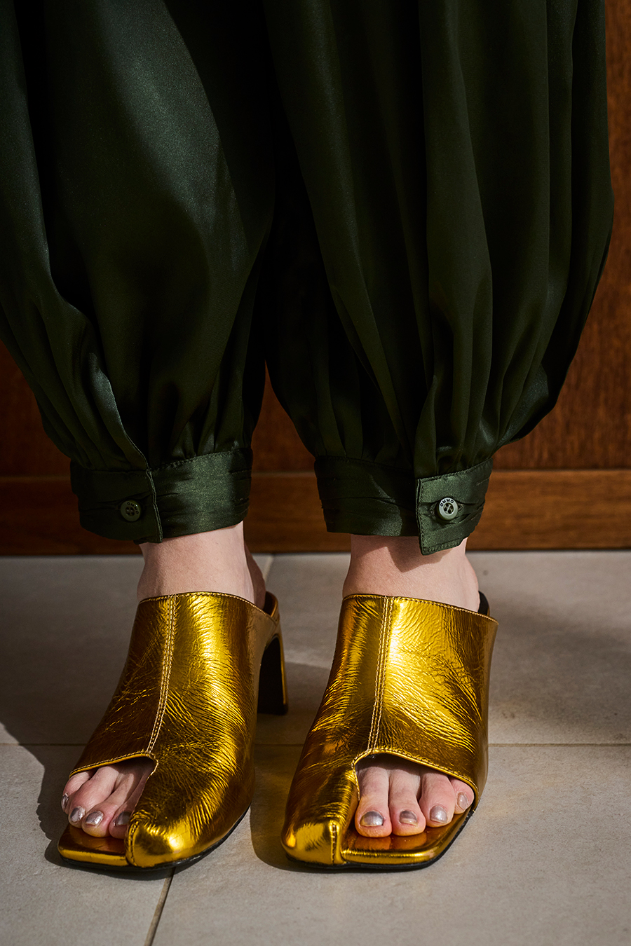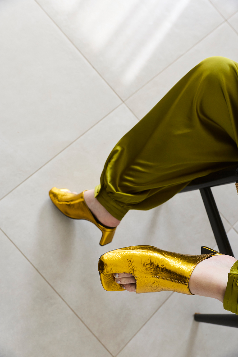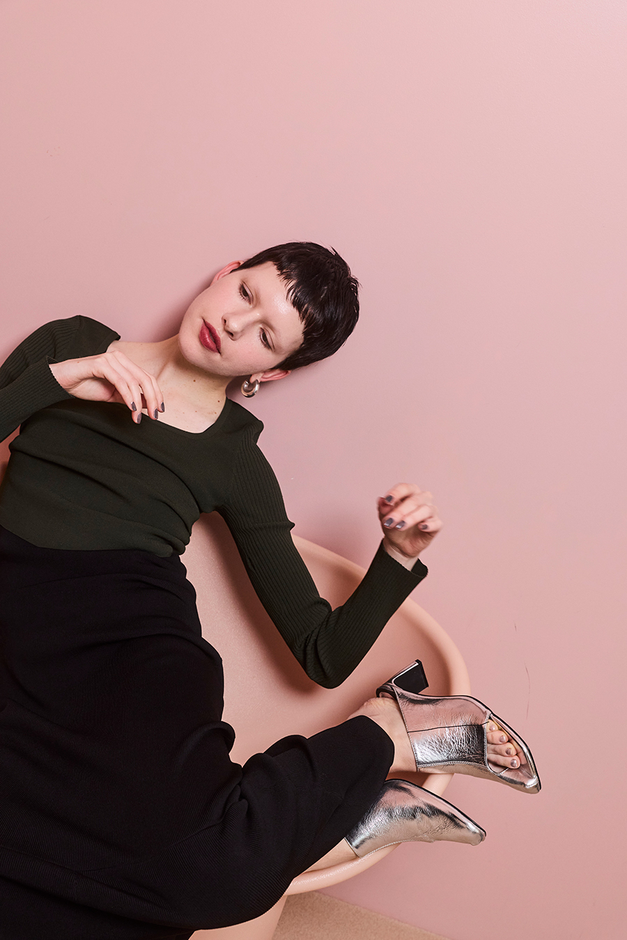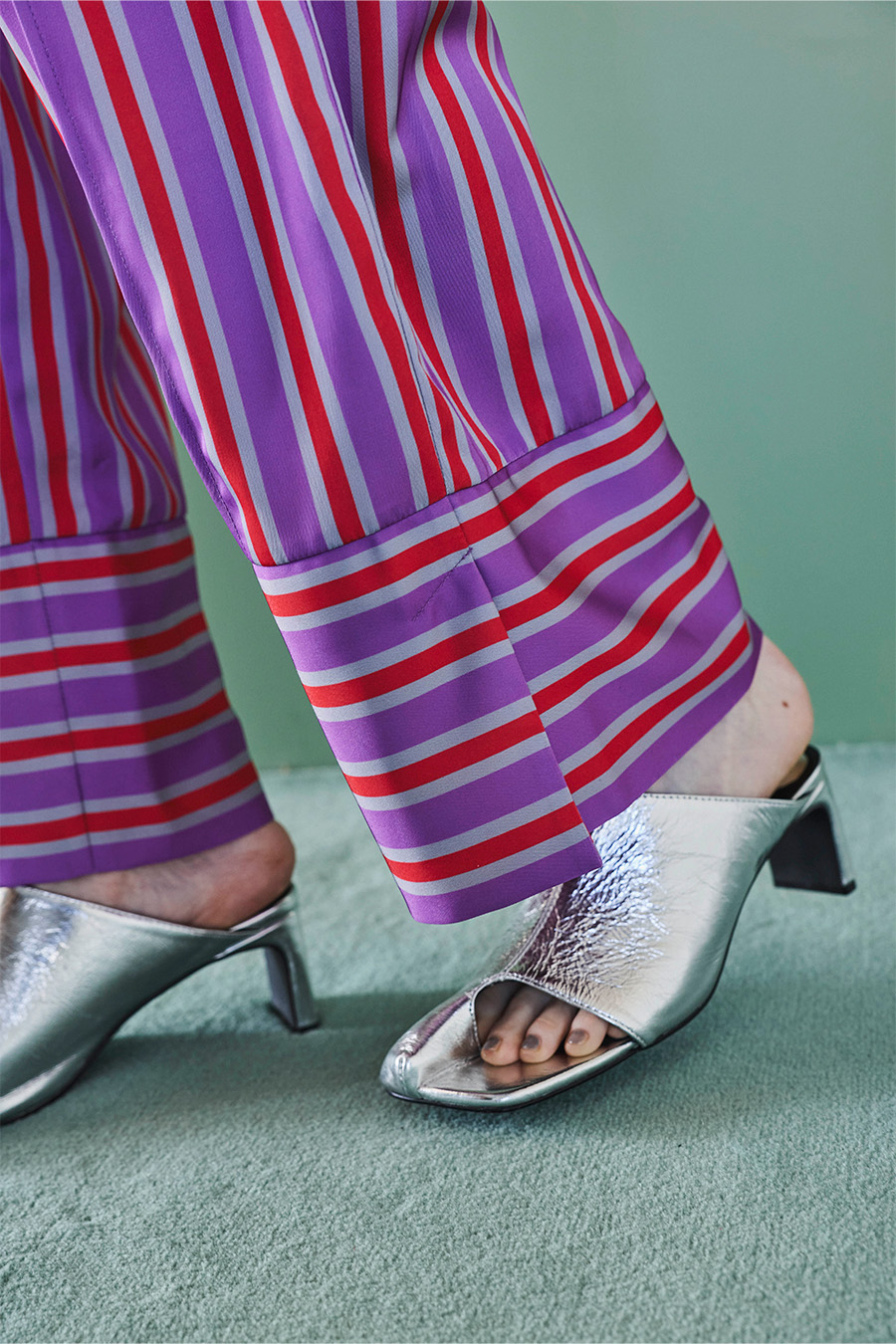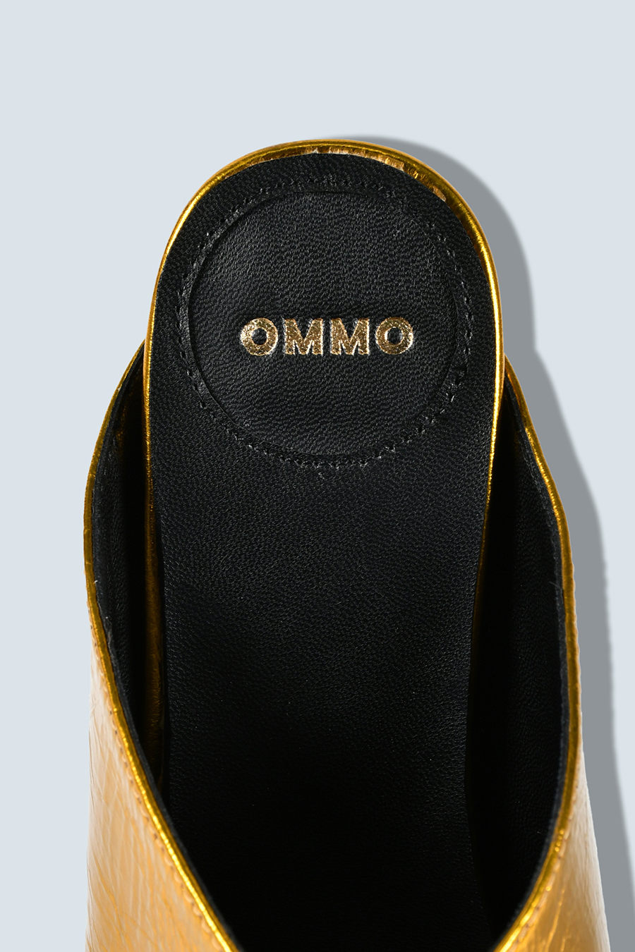 アシンメトリーなカッティングが目を引くミュール。つま先は程よく開いたデザインで、足元に抜け感と軽やかさをプラスし、モードな印象でスタイリングを引き立てます。