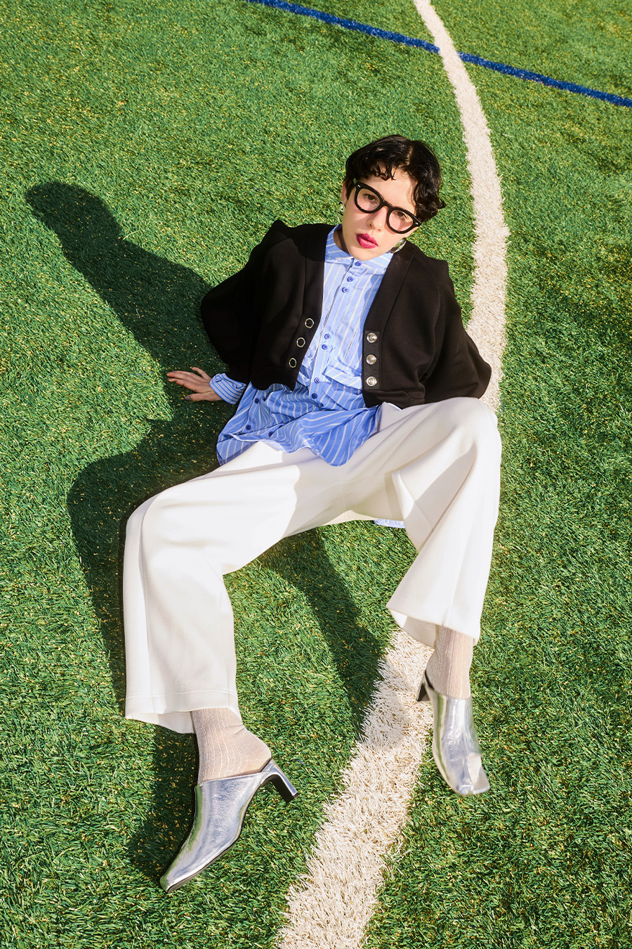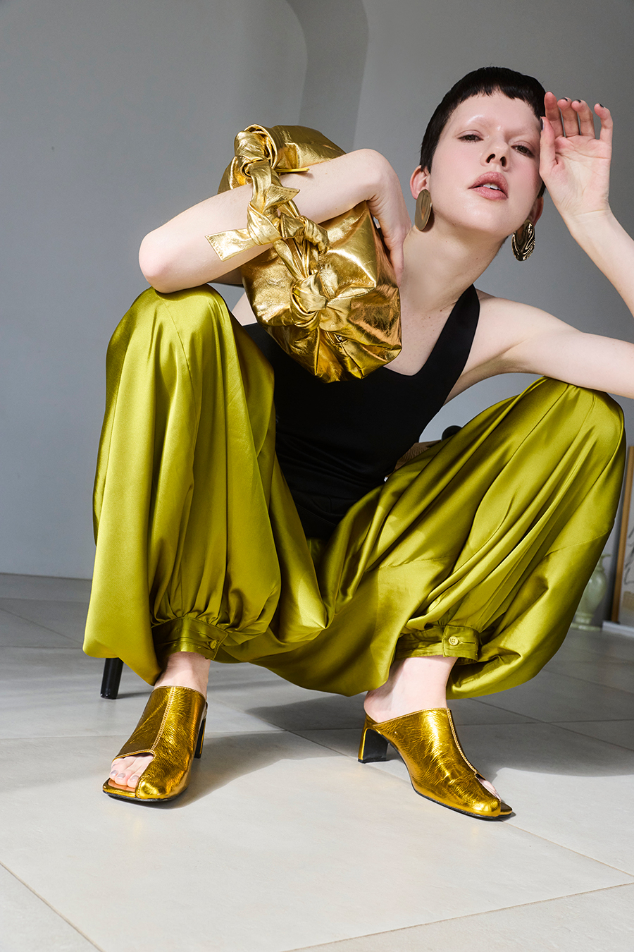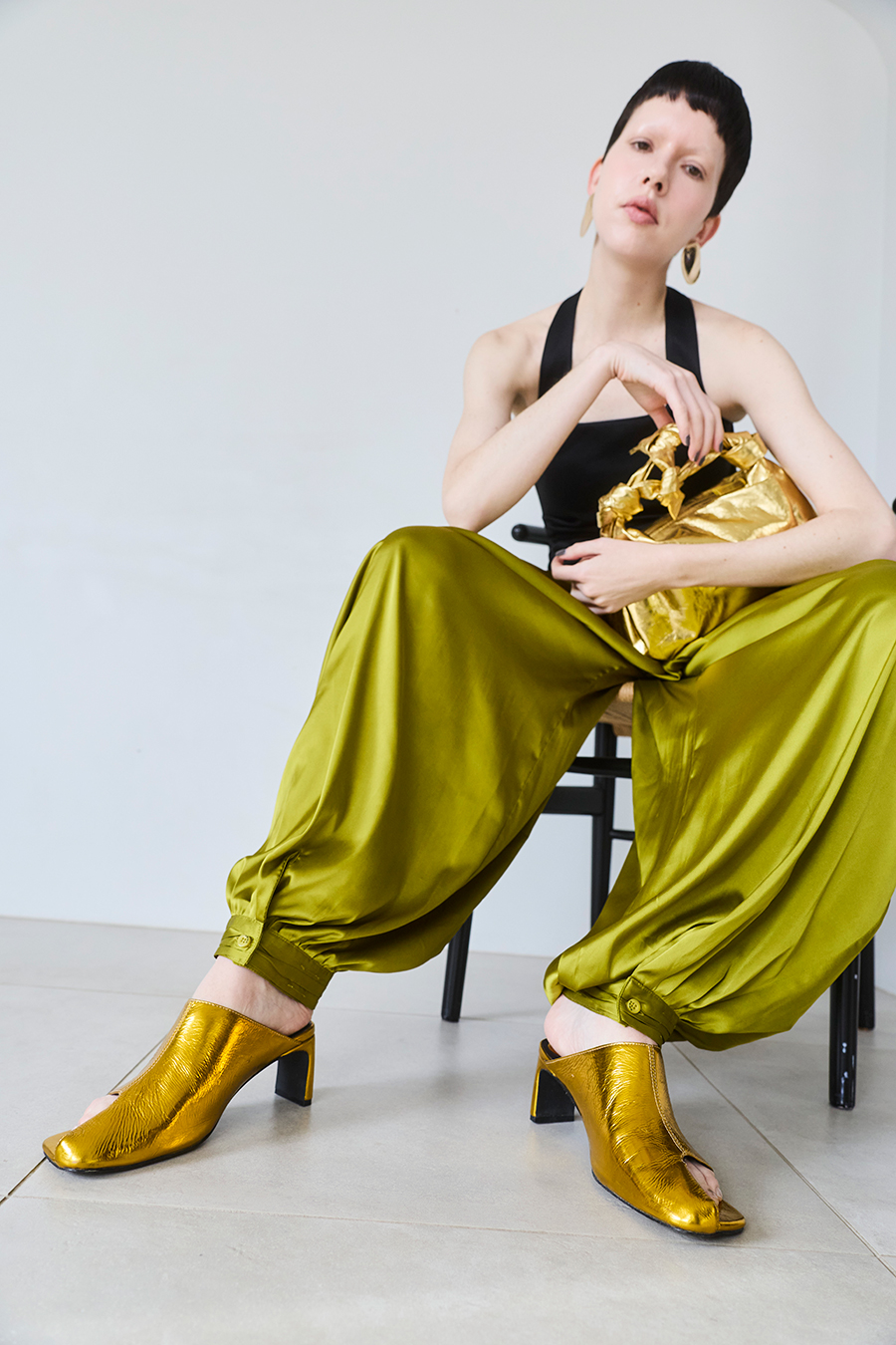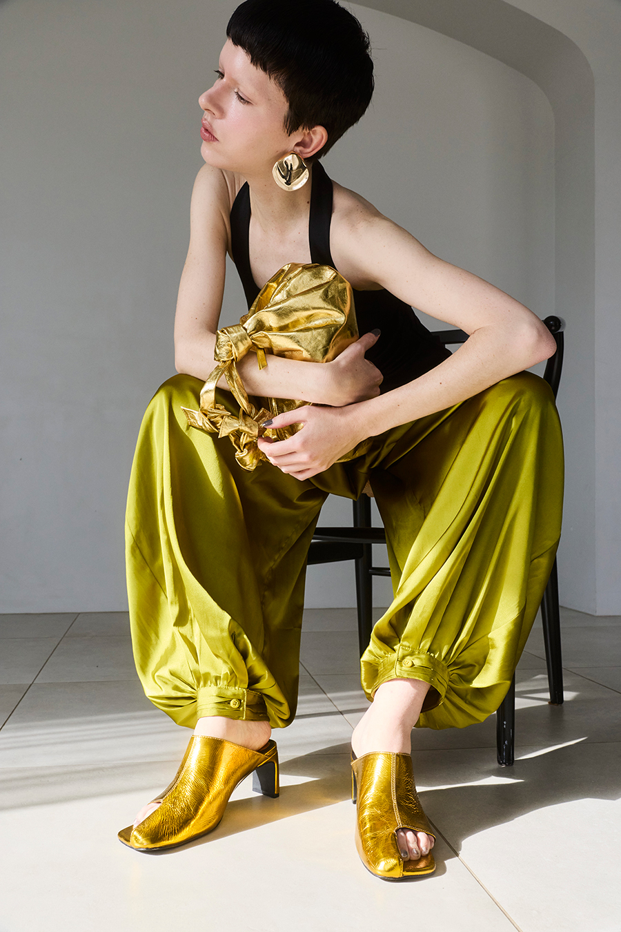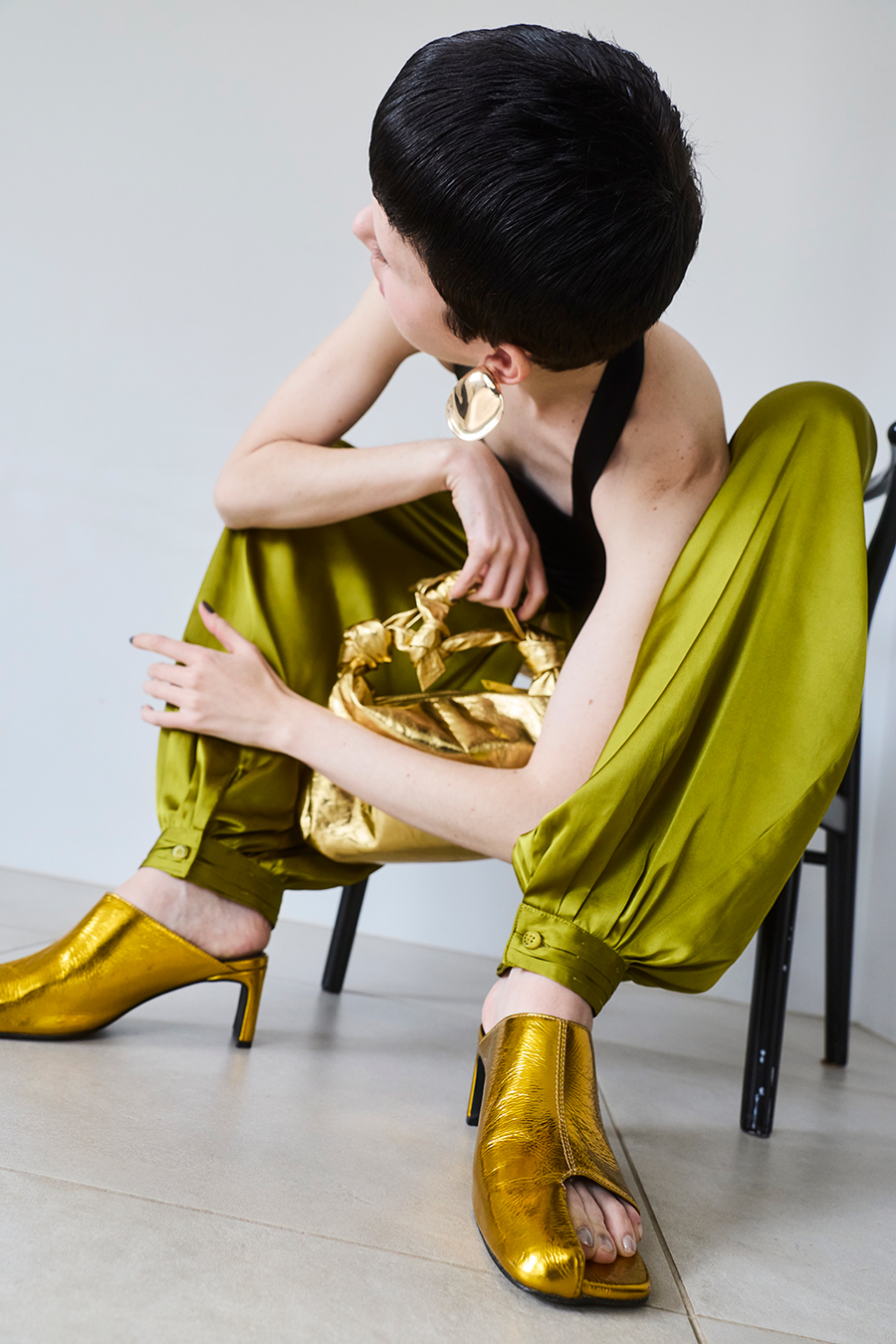 アシンメトリーなカッティングが目を引くミュール。つま先は程よく開いたデザインで、足元に抜け感と軽やかさをプラスし、モードな印象でスタイリングを引き立てます。