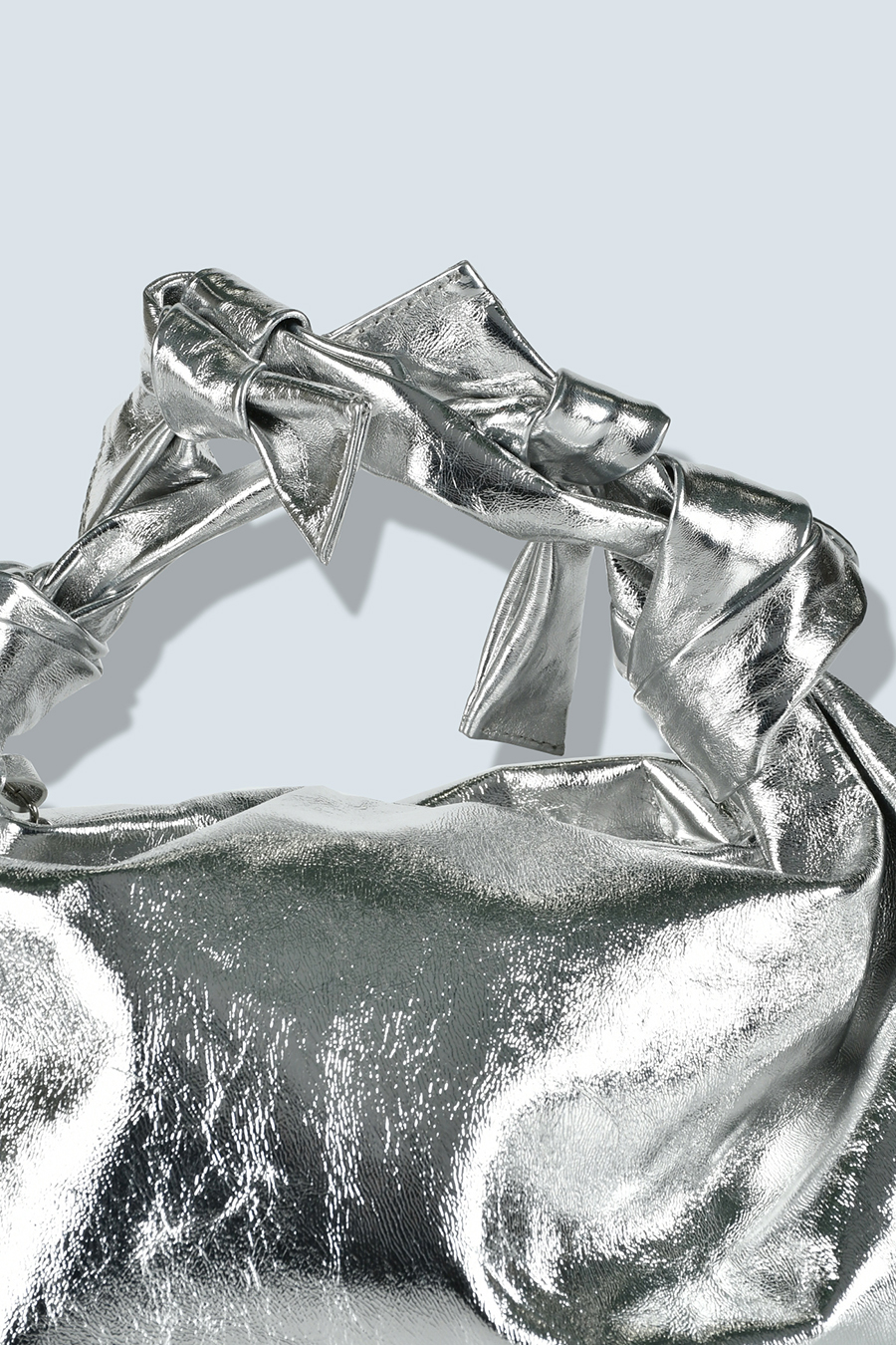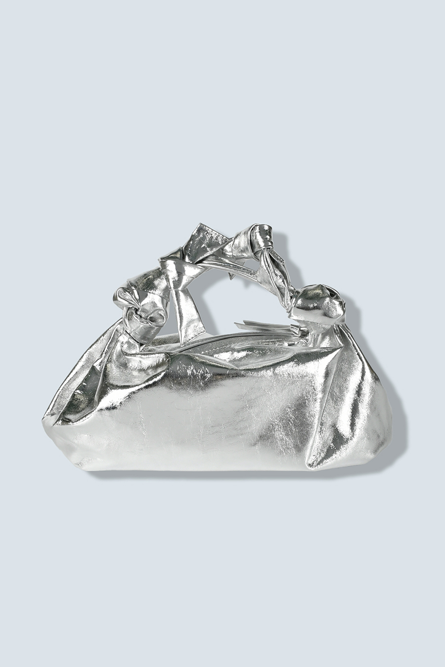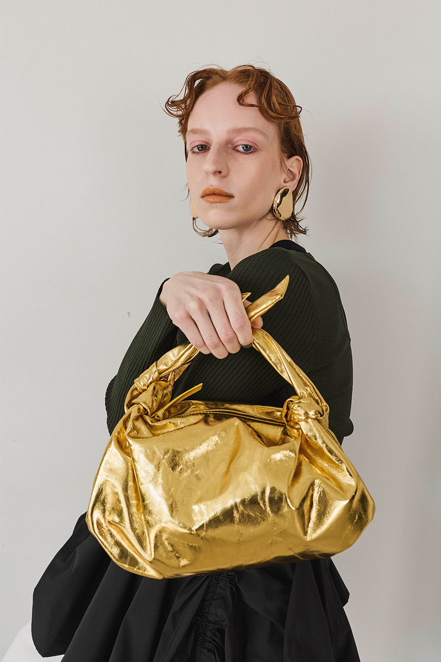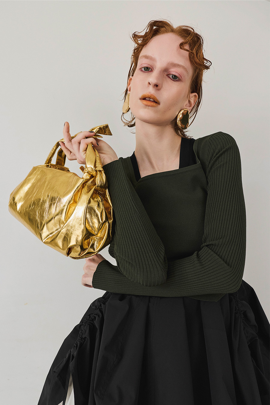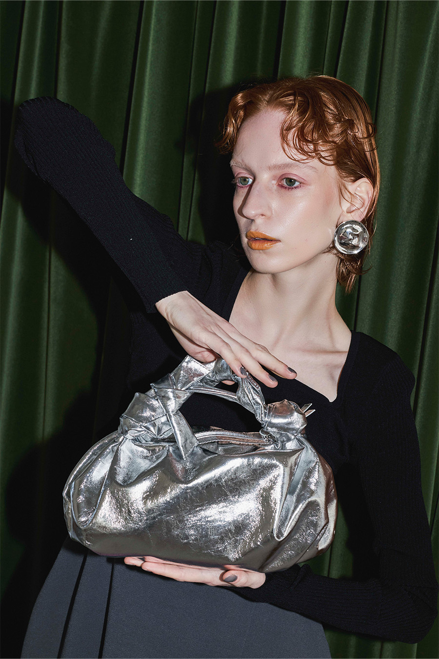 コロンと丸みのあるフォルムと、ハンドルの結び目デザインが印象的なバッグ。メタリックカラーがコーディネートのアクセントになります。