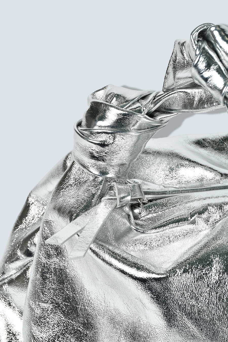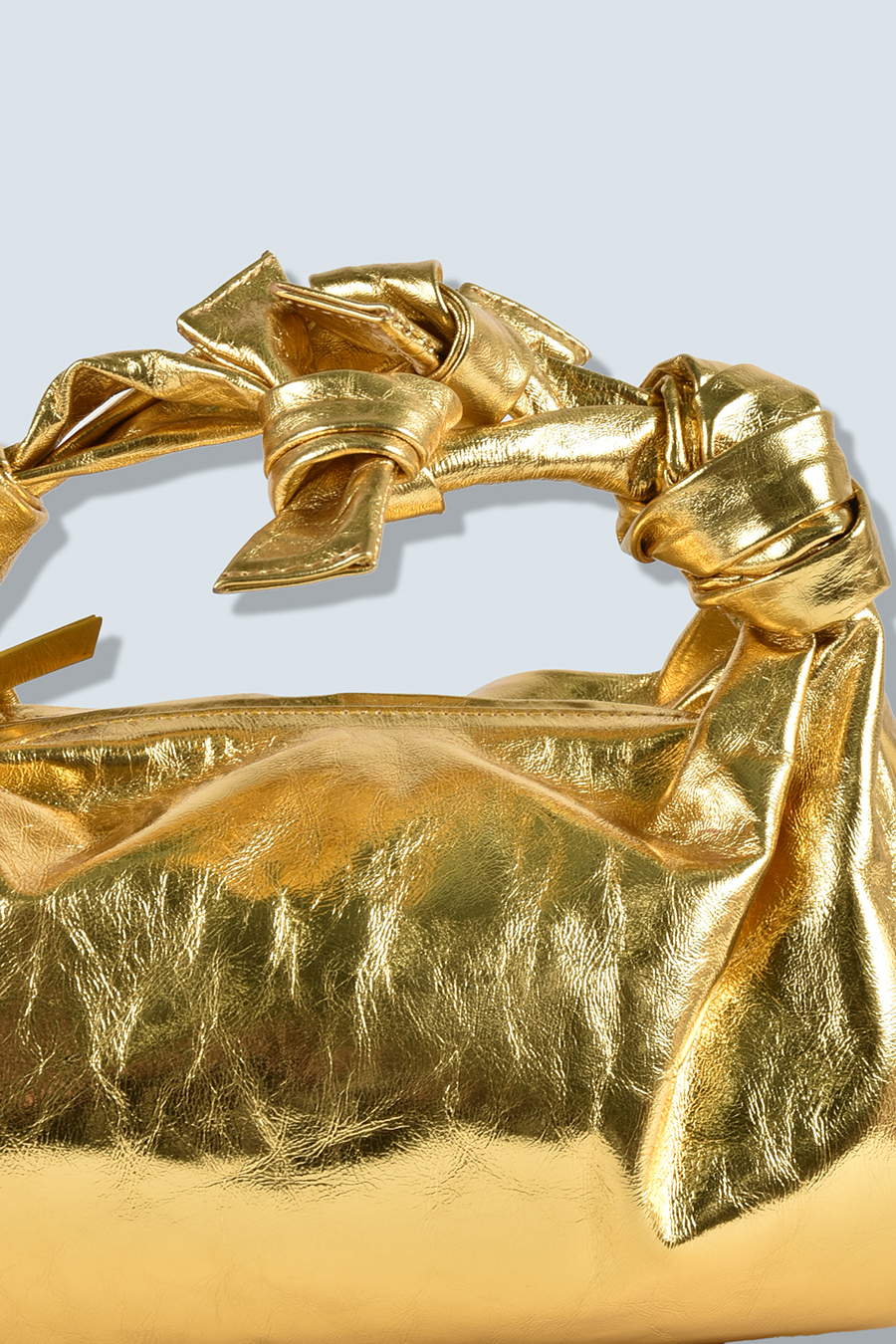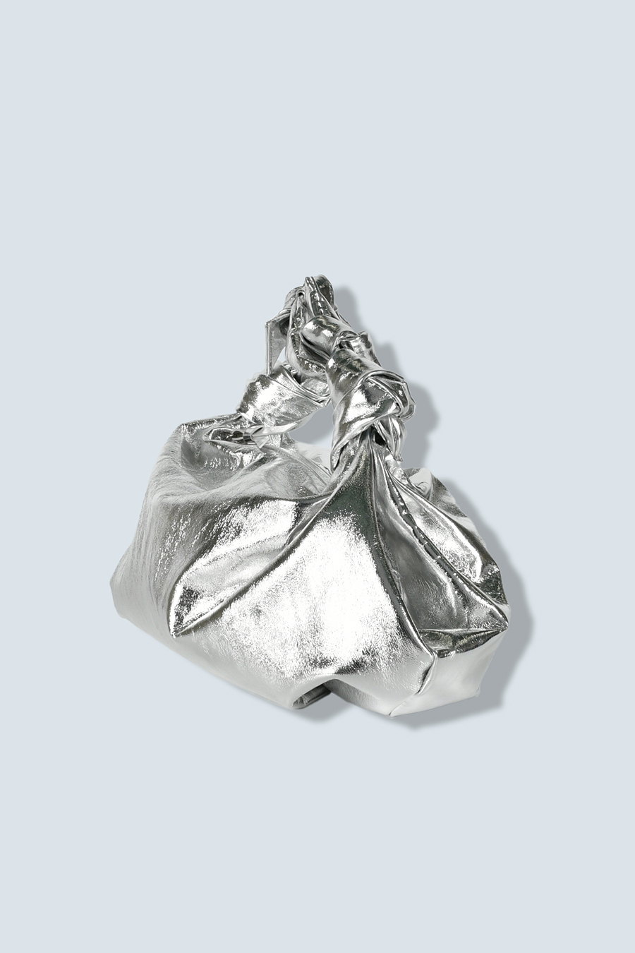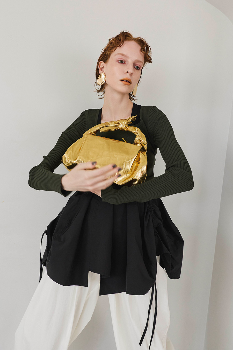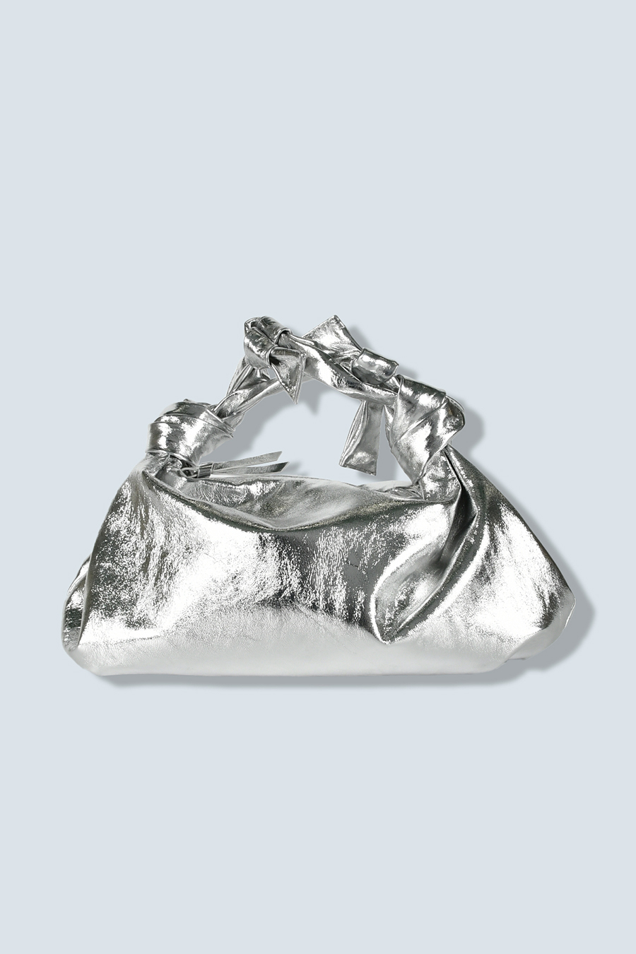コロンと丸みのあるフォルムと、ハンドルの結び目デザインが印象的なバッグ。メタリックカラーがコーディネートのアクセントになります。