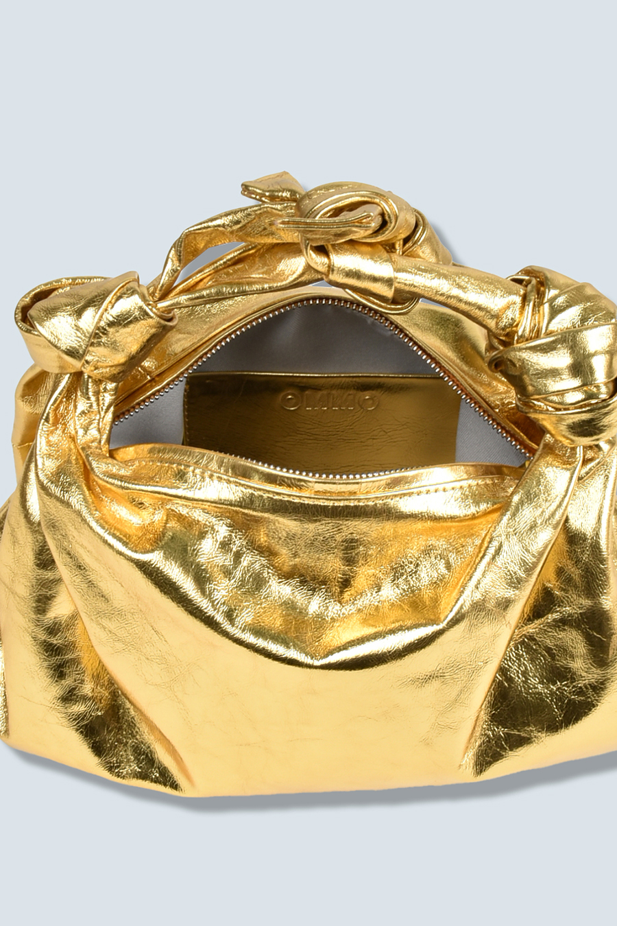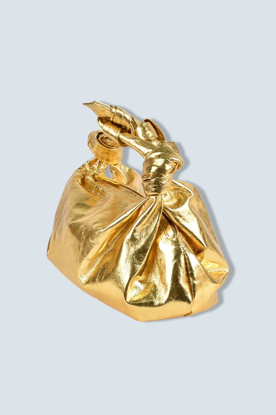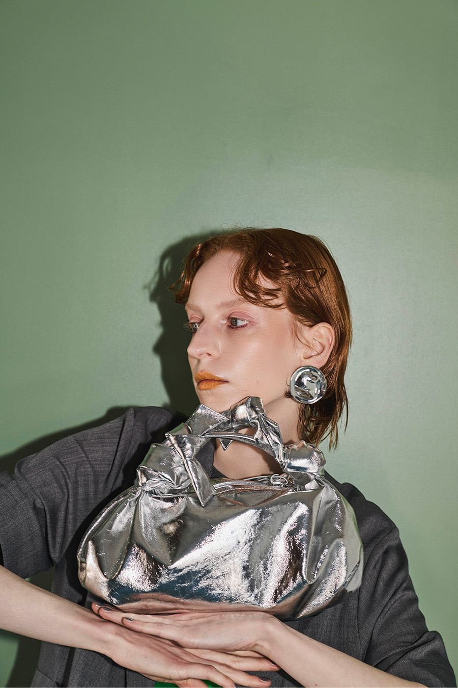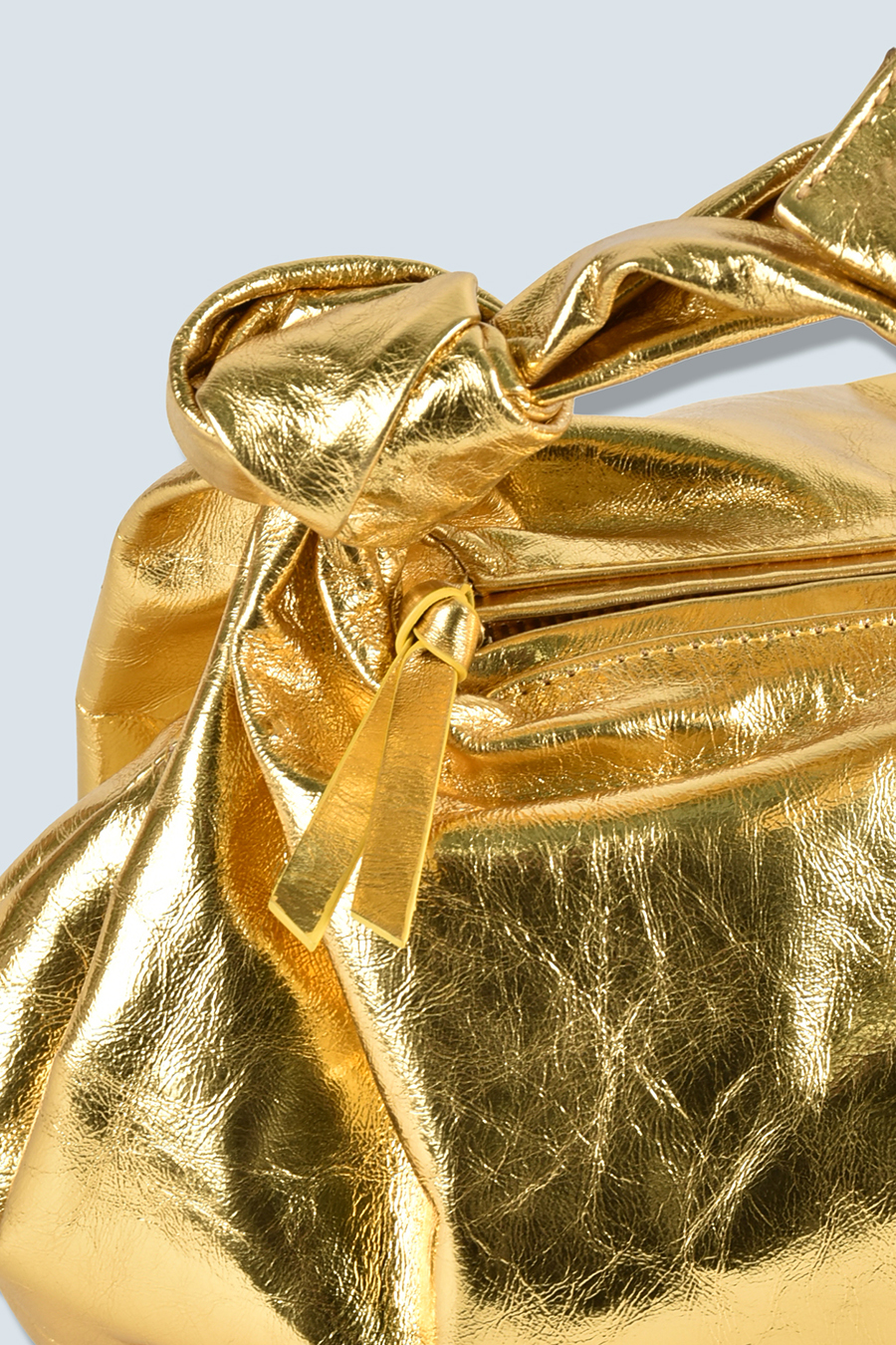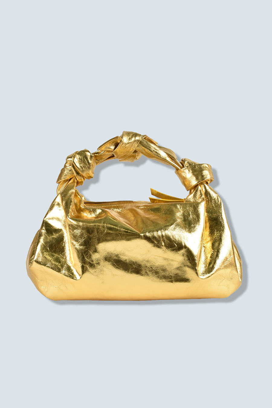 コロンと丸みのあるフォルムと、ハンドルの結び目デザインが印象的なバッグ。メタリックカラーがコーディネートのアクセントになります。