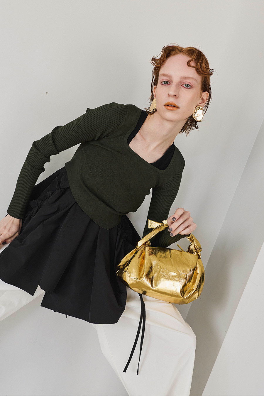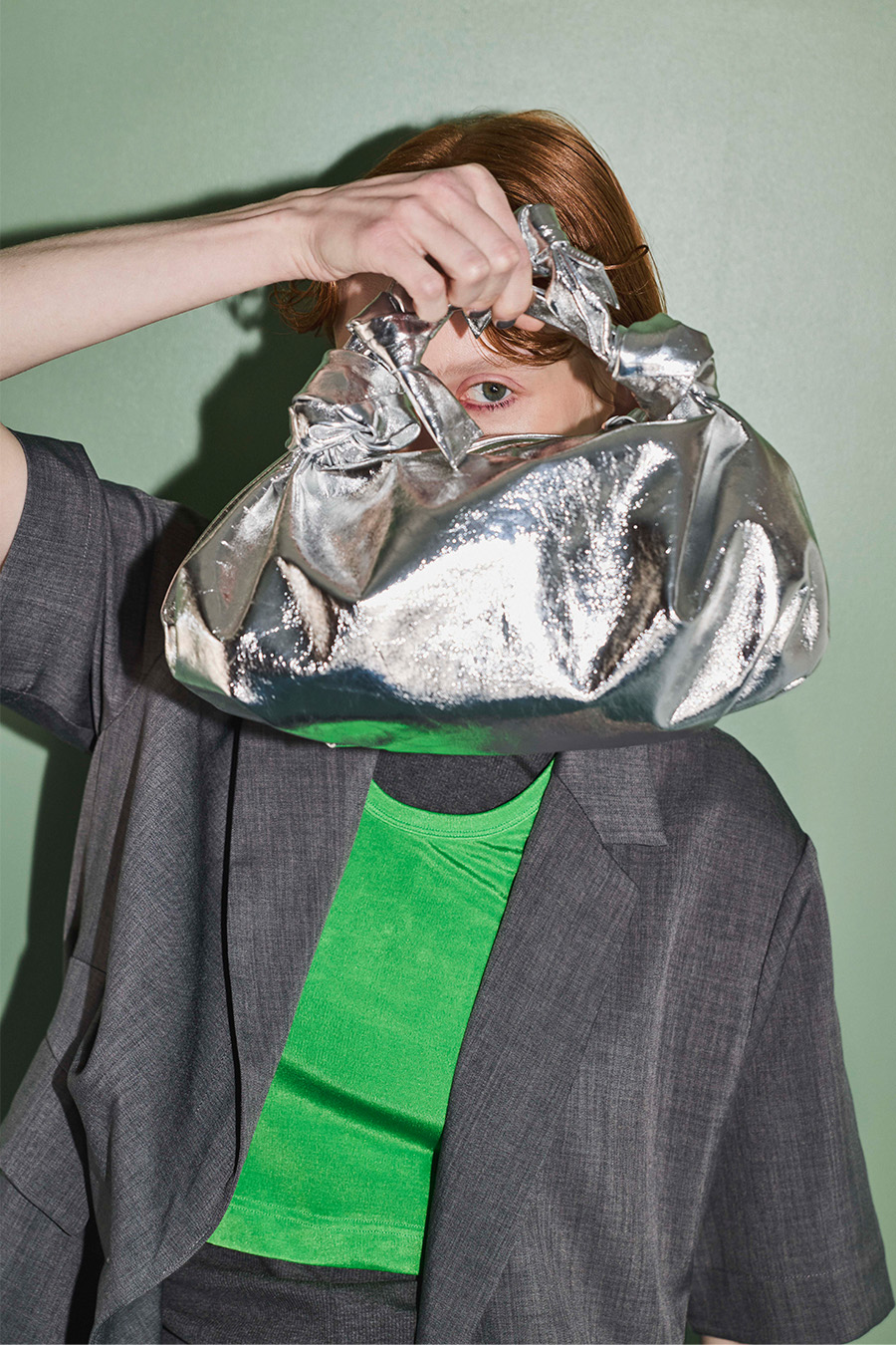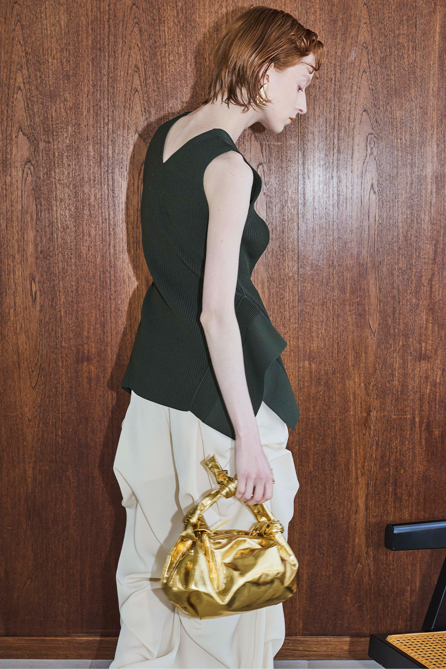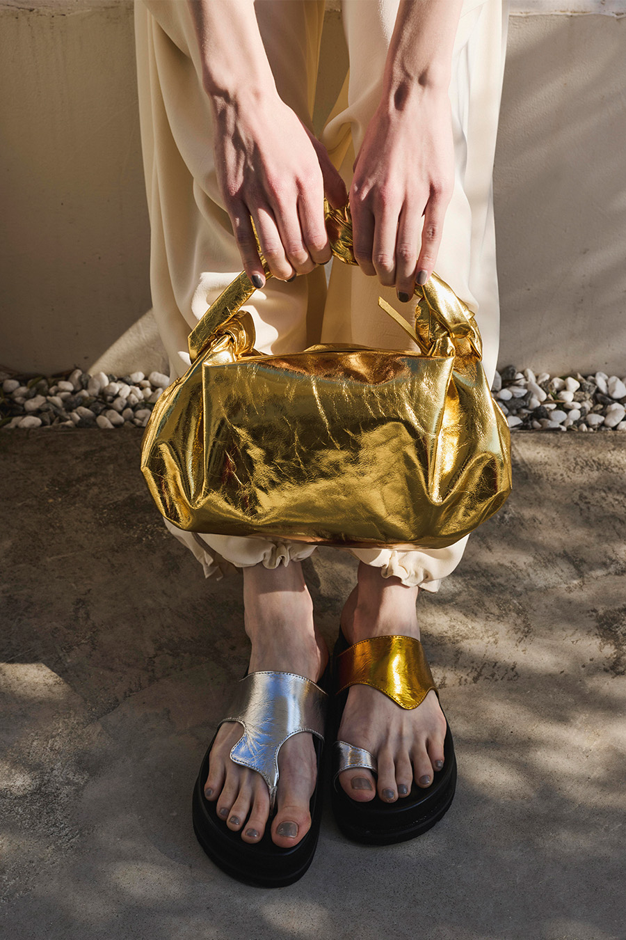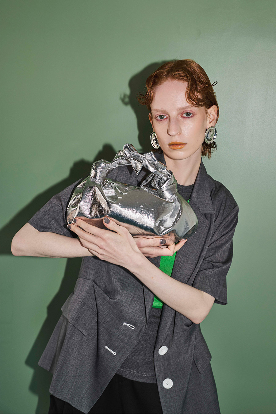 コロンと丸みのあるフォルムと、ハンドルの結び目デザインが印象的なバッグ。メタリックカラーがコーディネートのアクセントになります。