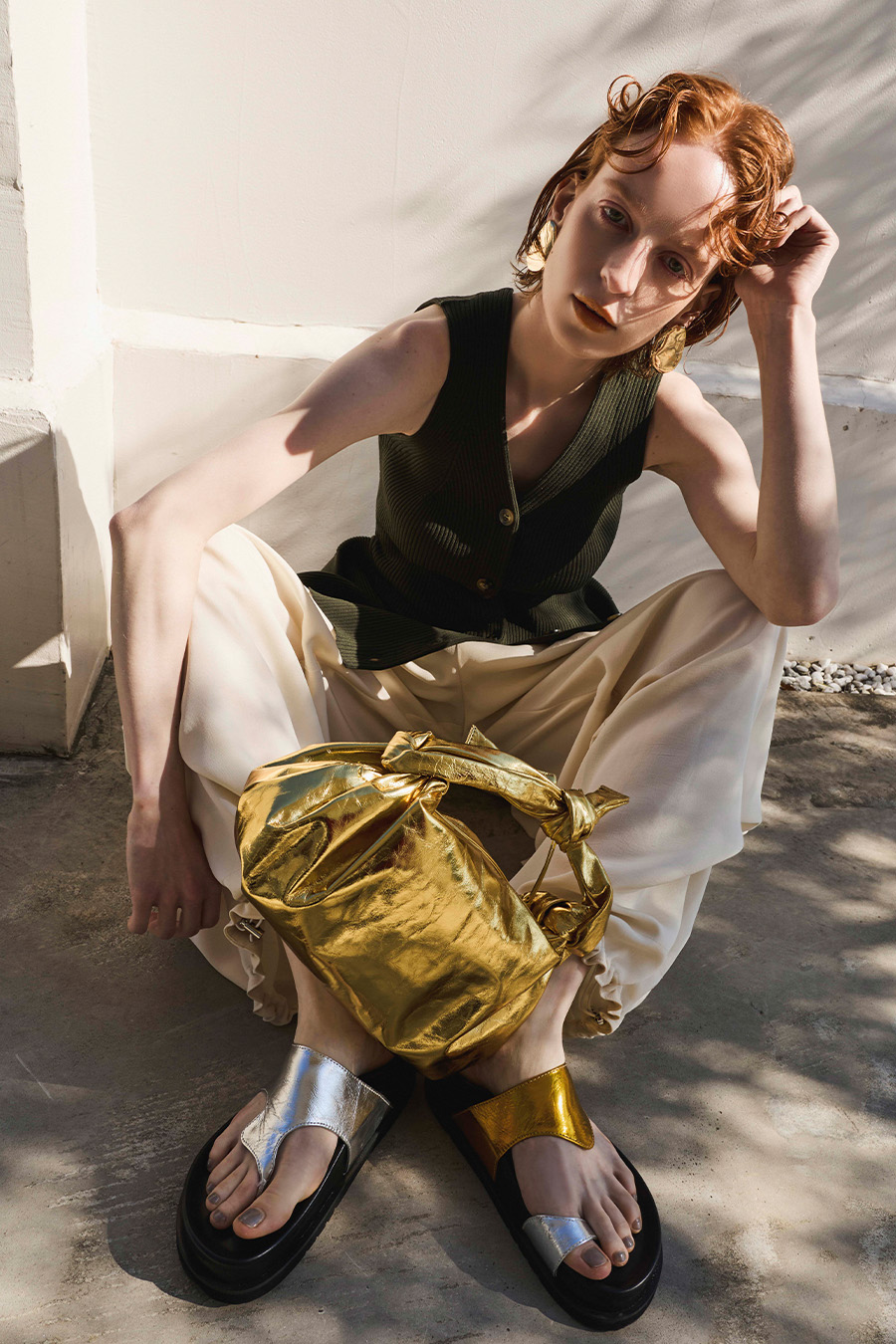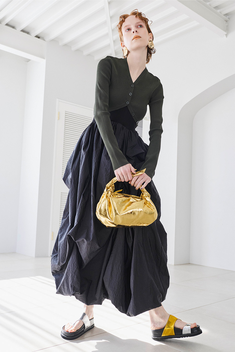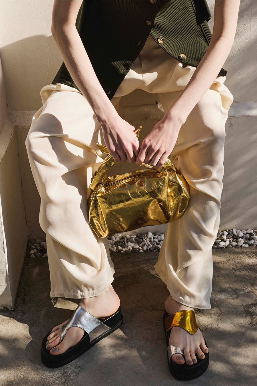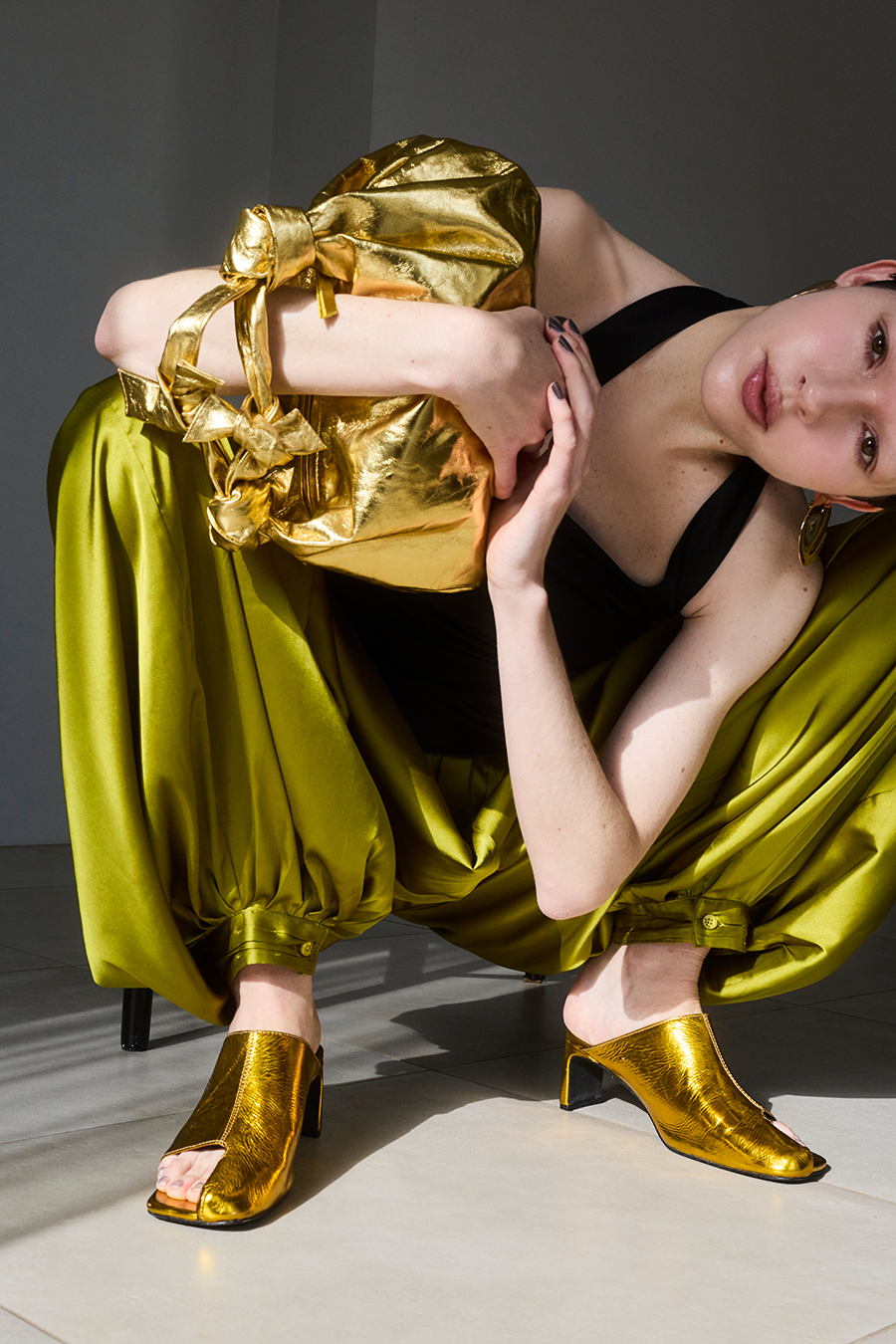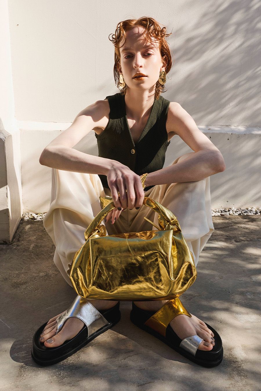 コロンと丸みのあるフォルムと、ハンドルの結び目デザインが印象的なバッグ。メタリックカラーがコーディネートのアクセントになります。