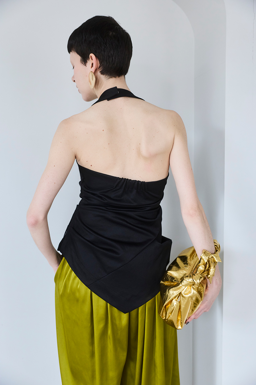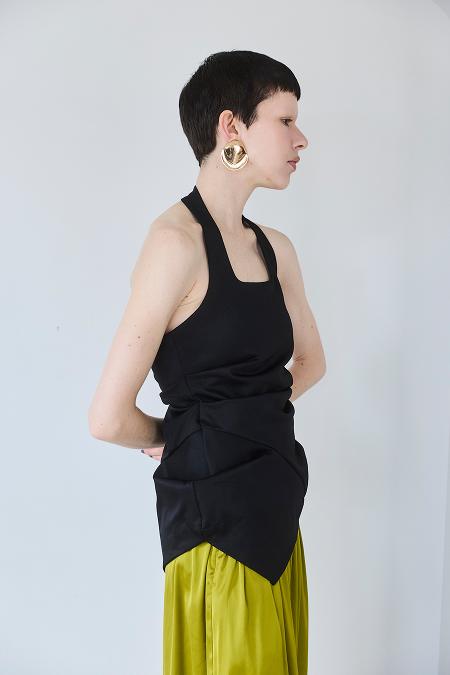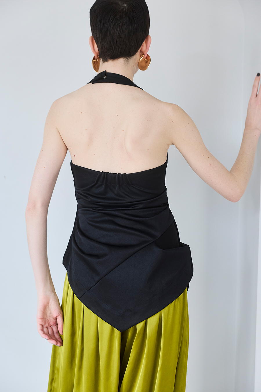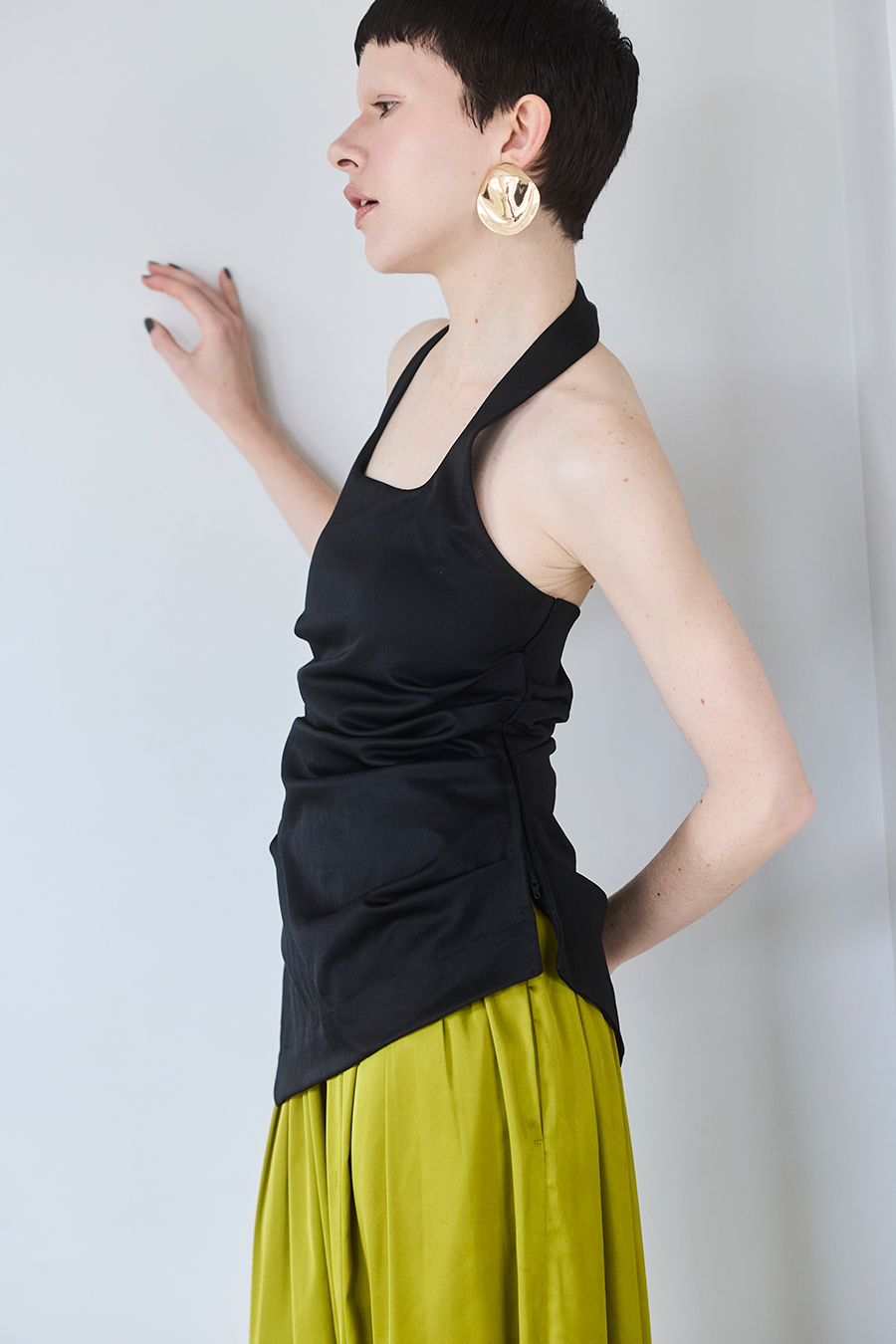 ストレッチ性のある微光沢ツイルを使用したホルターネックトップス。パッド付きでインナーを選ばず1枚で着用でき、快適な着心地です。