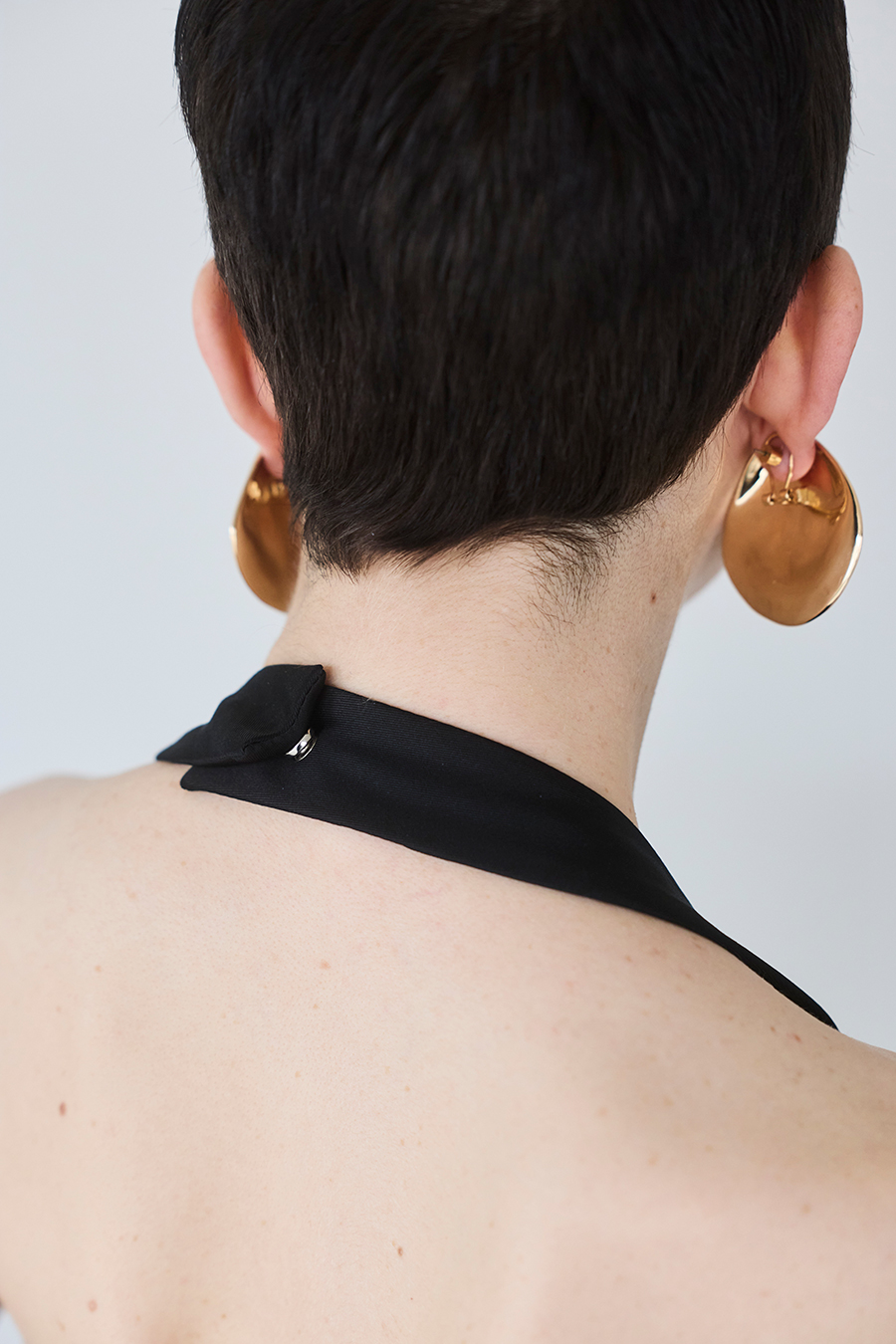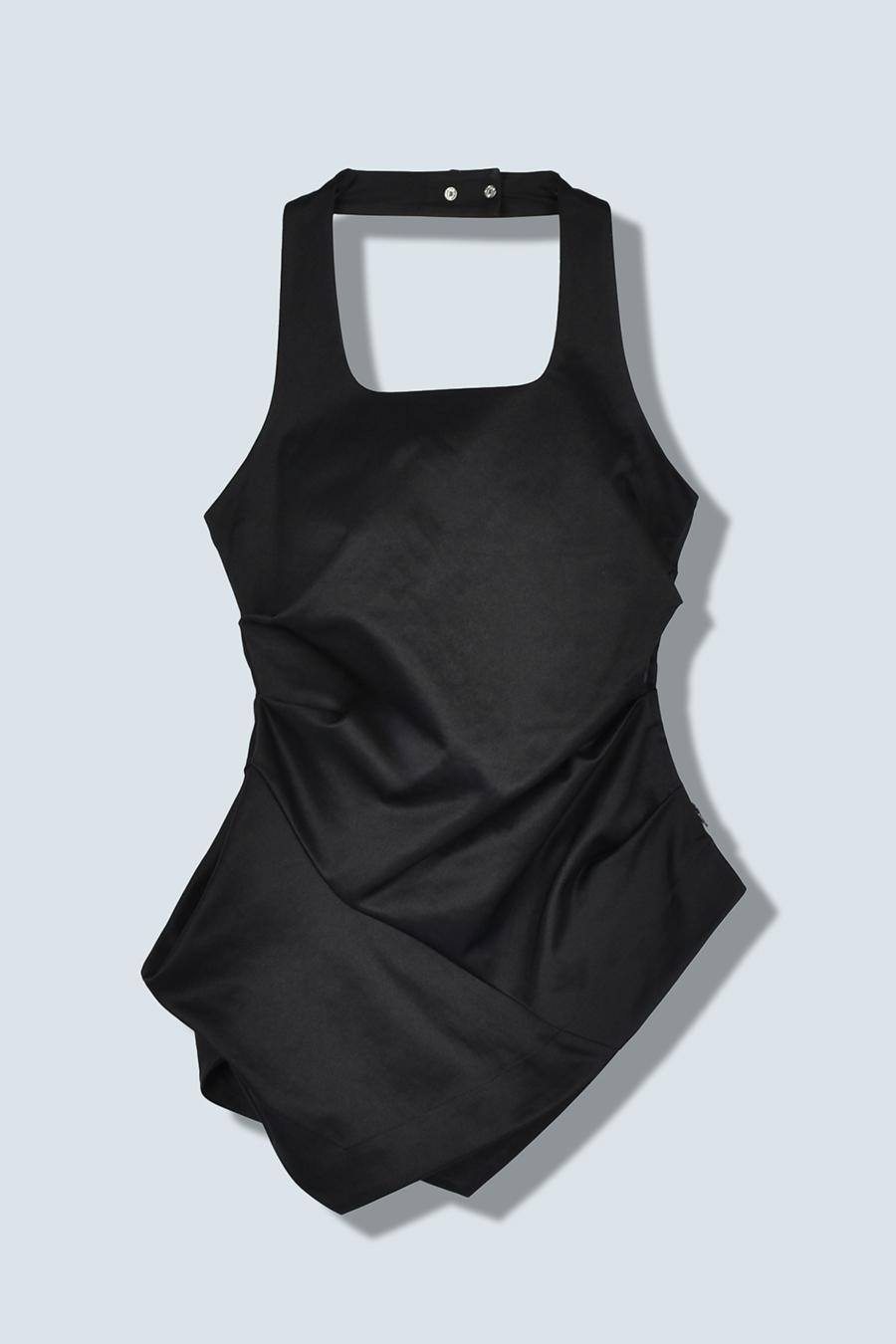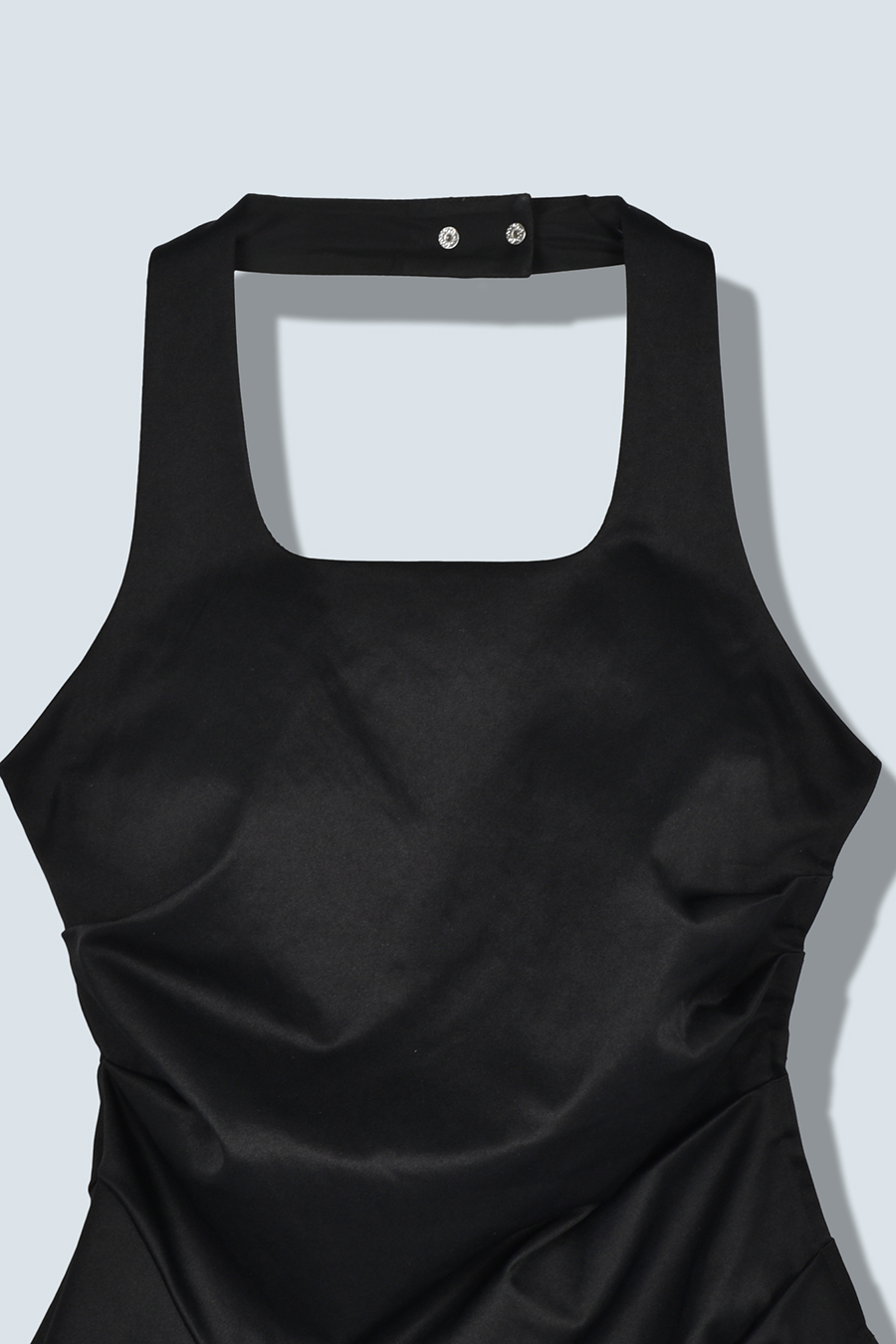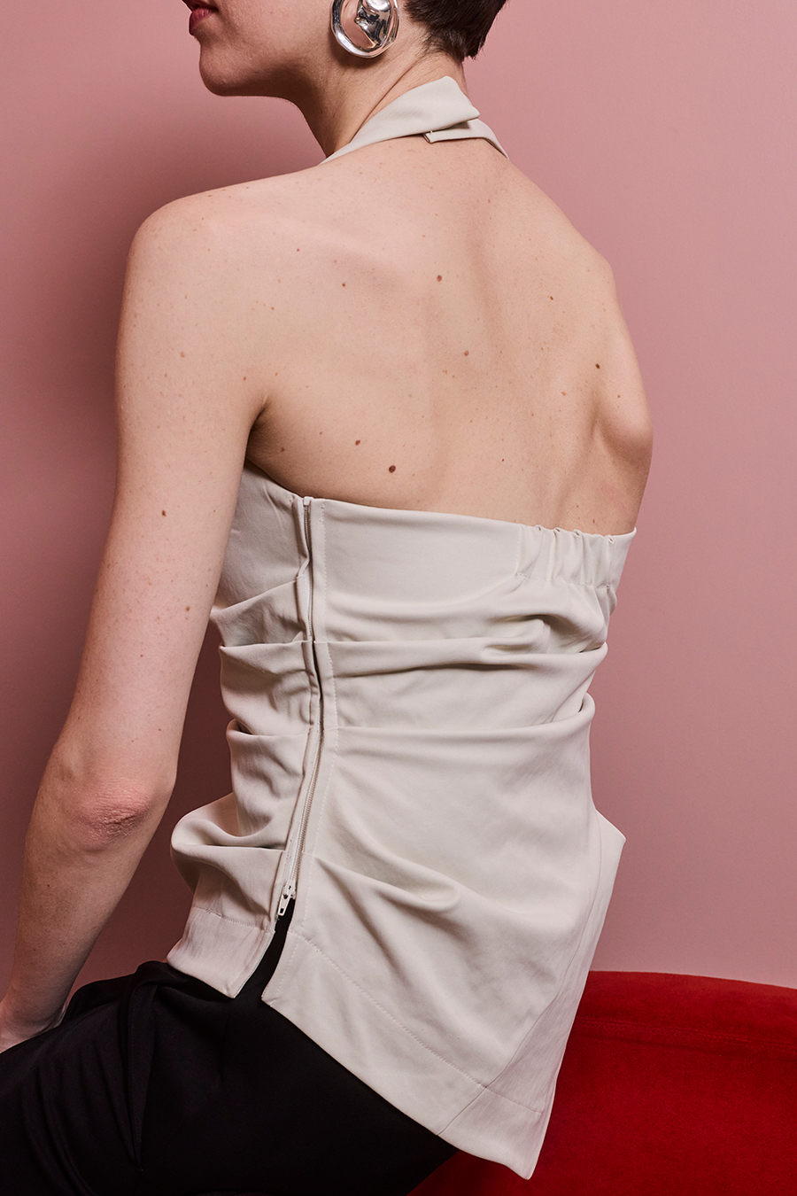 ストレッチ性のある微光沢ツイルを使用したホルターネックトップス。パッド付きでインナーを選ばず1枚で着用でき、快適な着心地です。