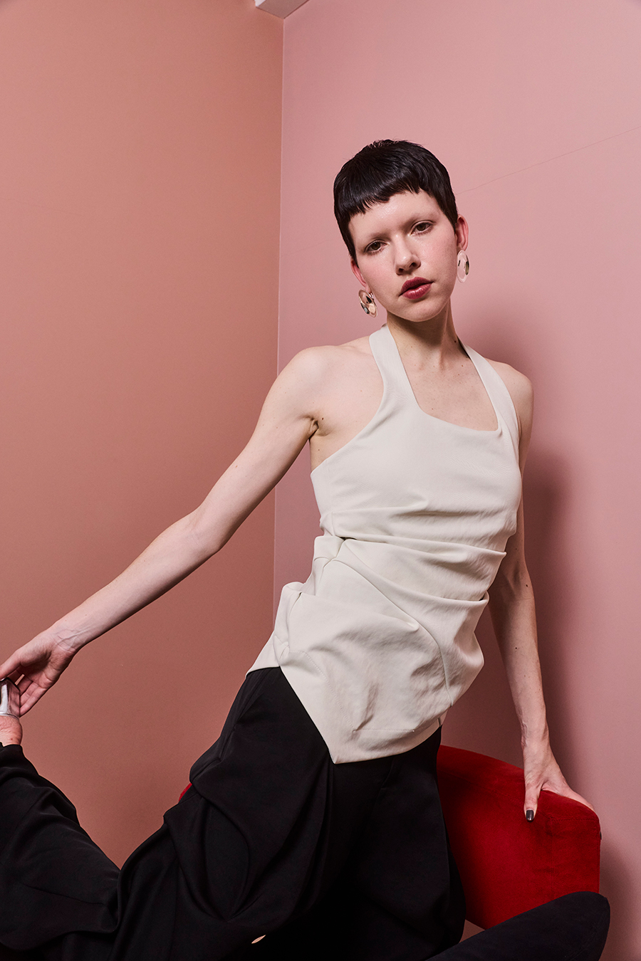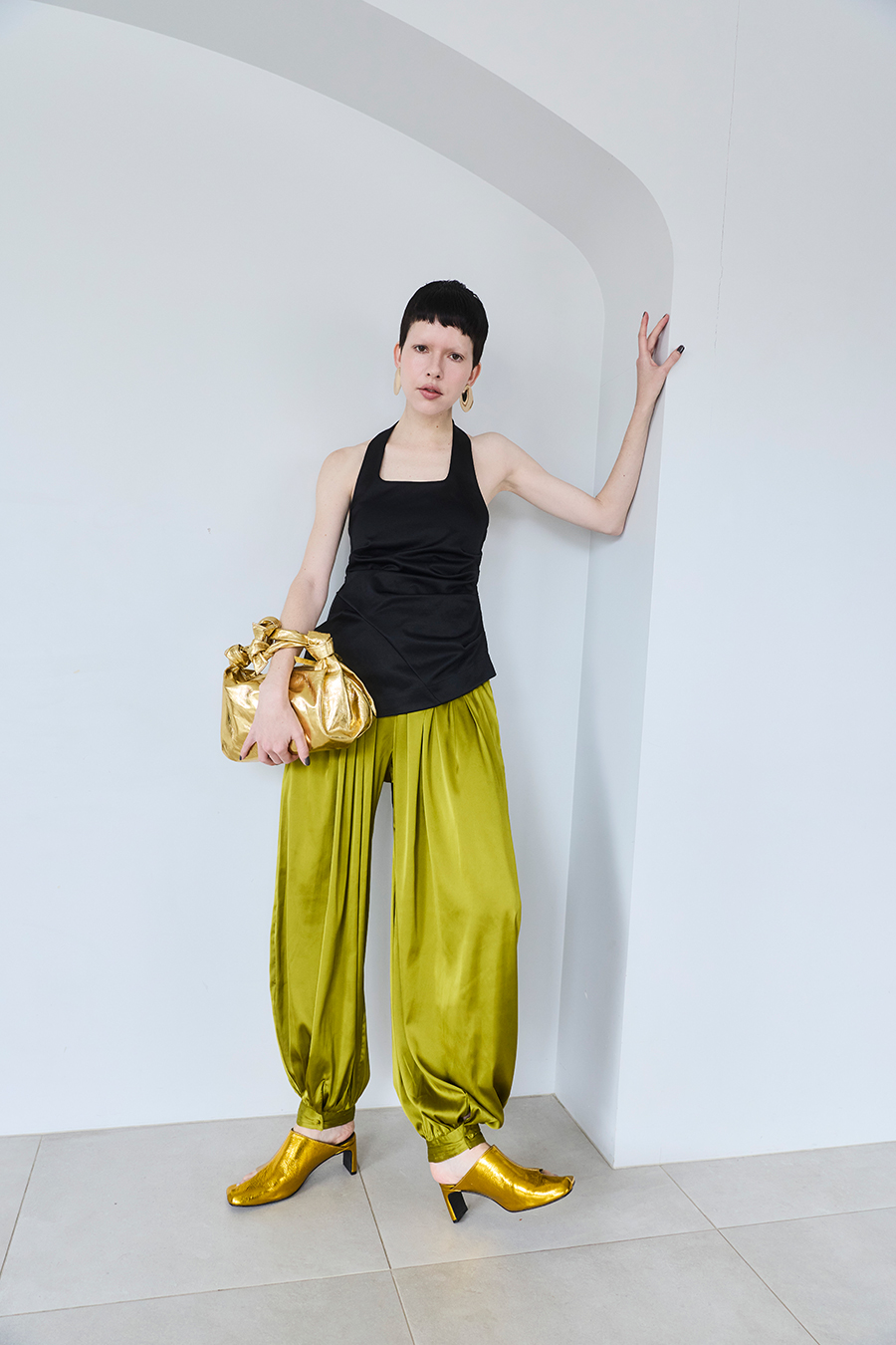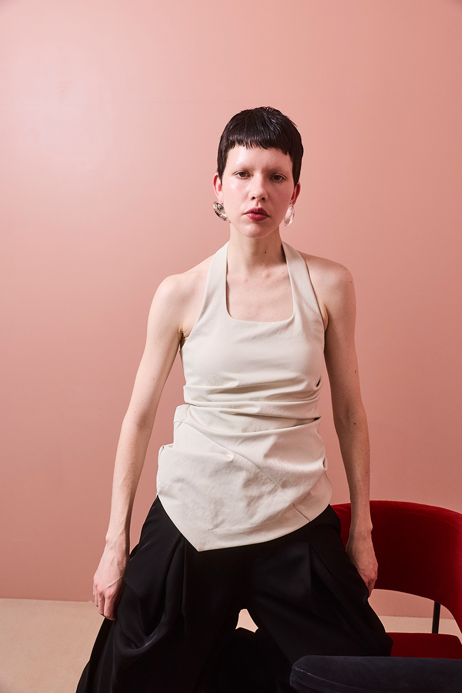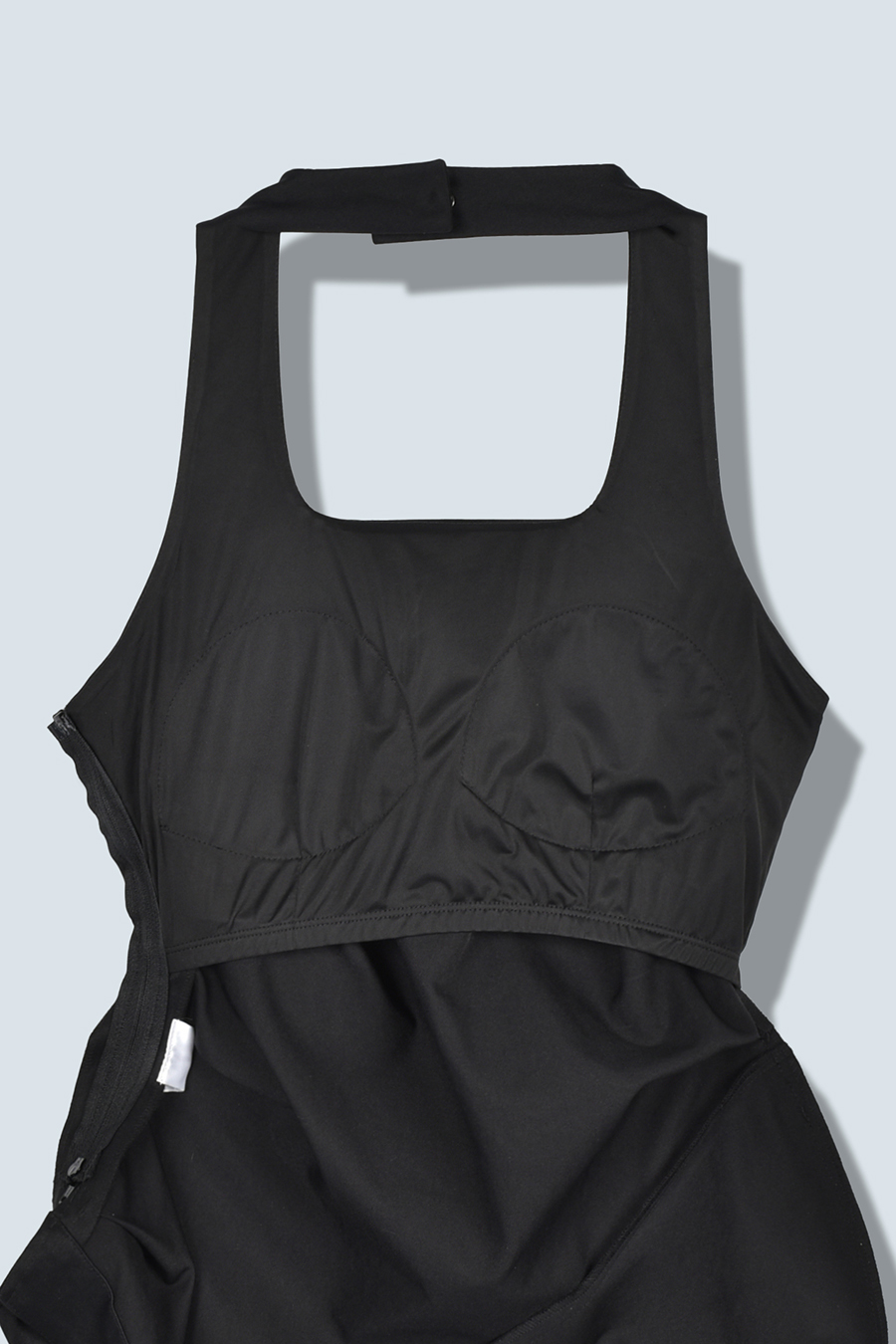 ストレッチ性のある微光沢ツイルを使用したホルターネックトップス。パッド付きでインナーを選ばず1枚で着用でき、快適な着心地です。
