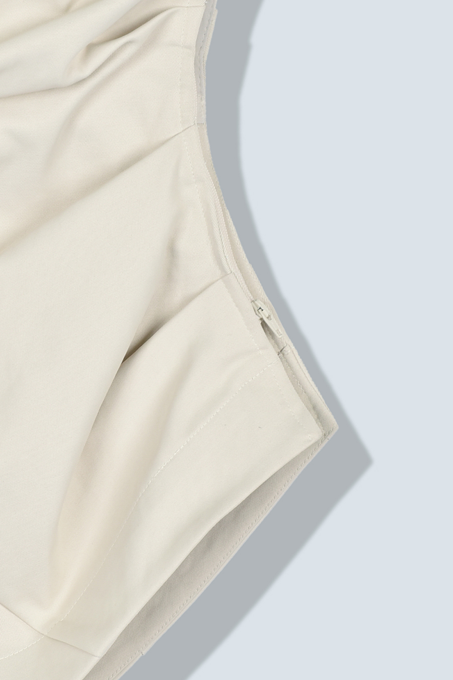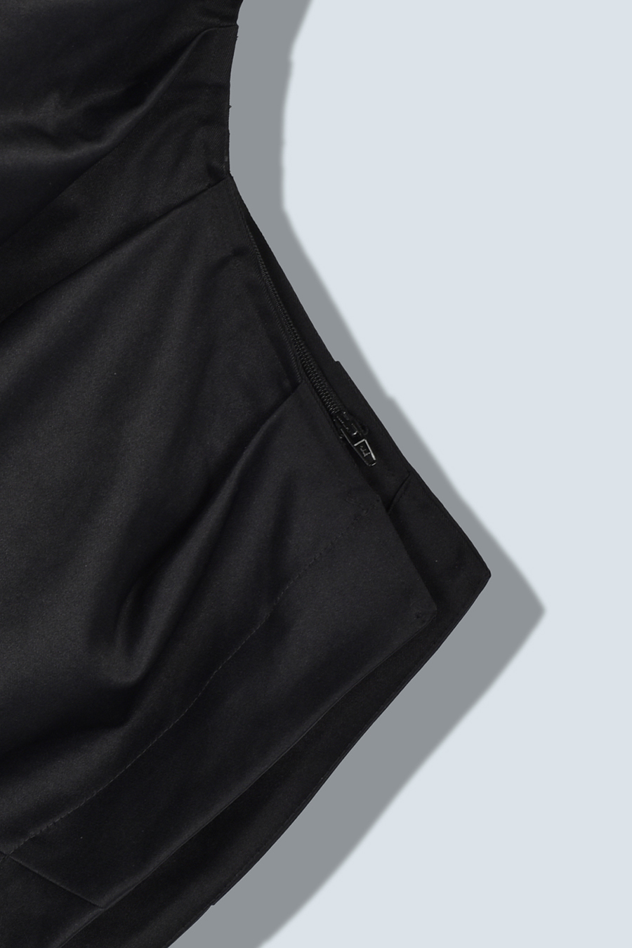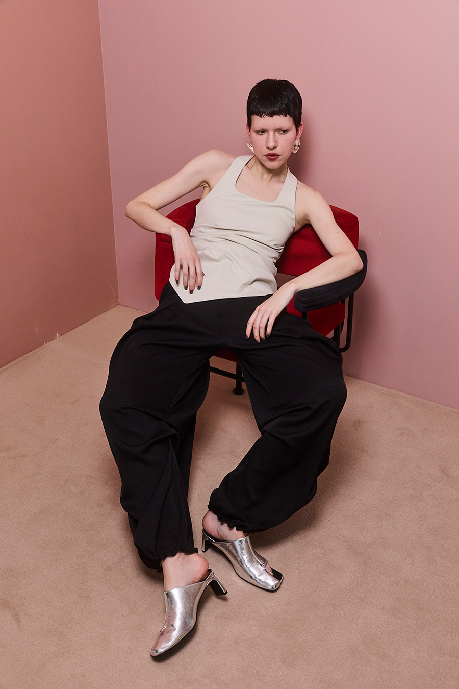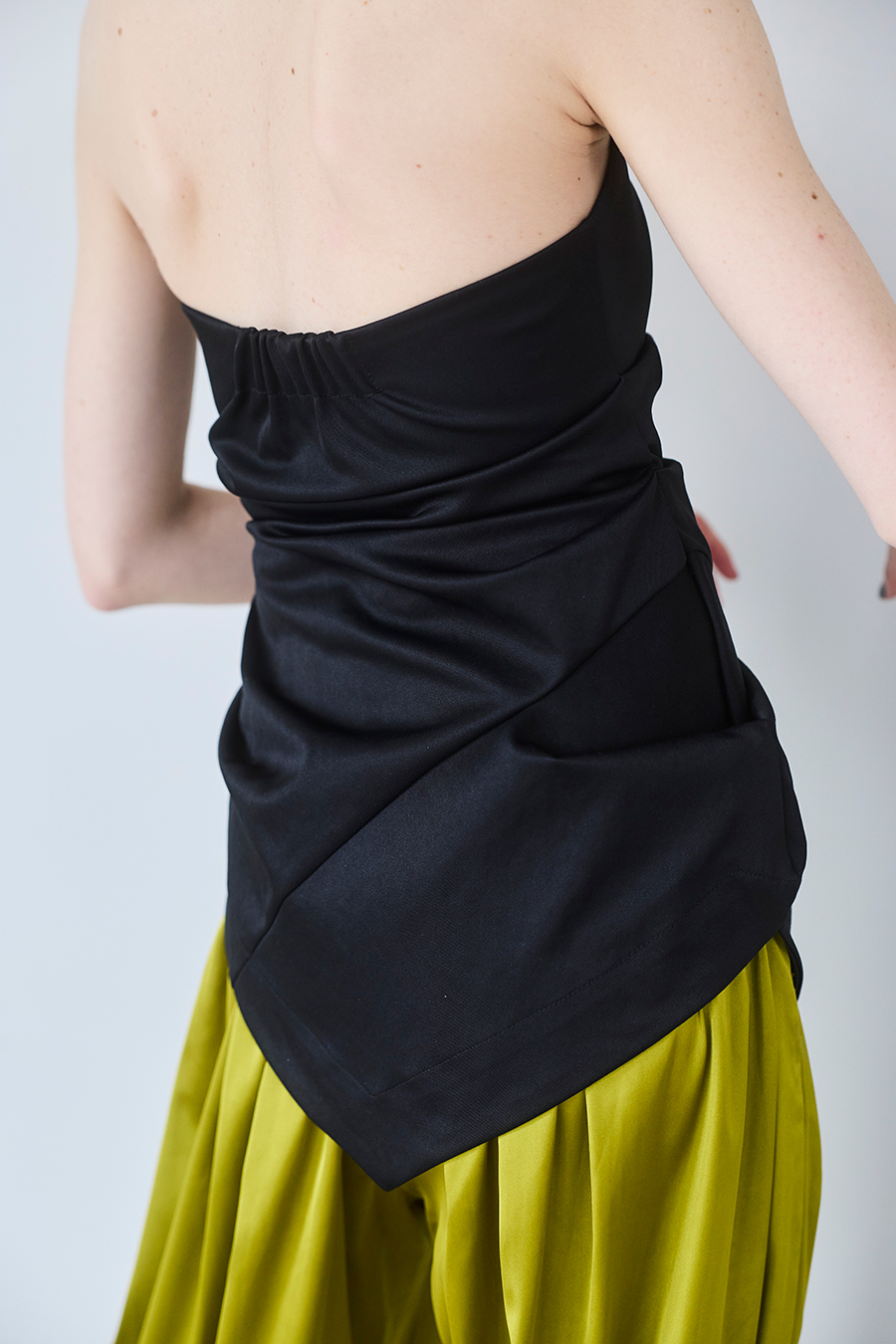 ストレッチ性のある微光沢ツイルを使用したホルターネックトップス。パッド付きでインナーを選ばず1枚で着用でき、快適な着心地です。