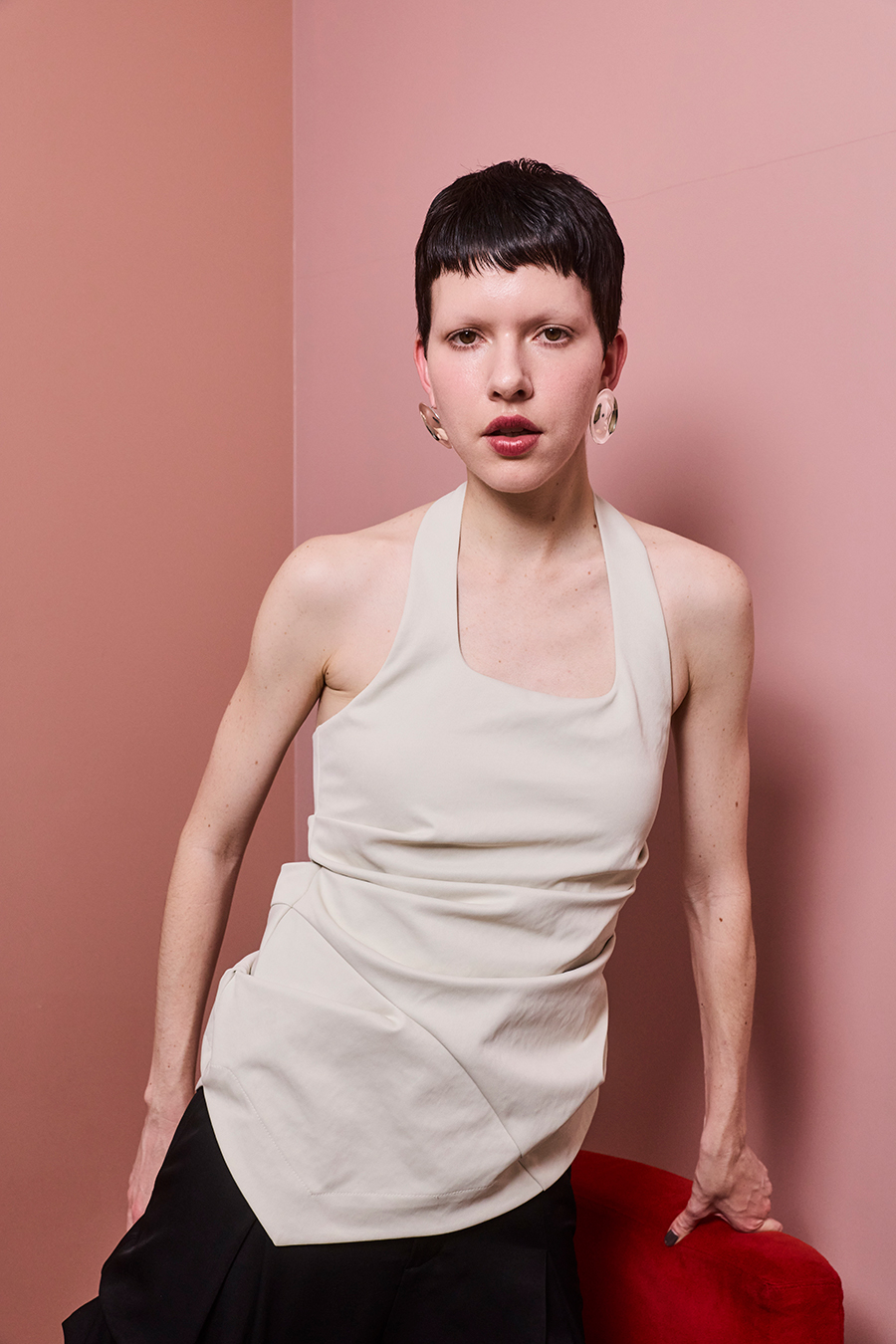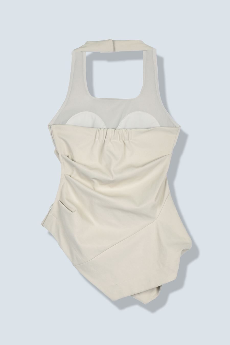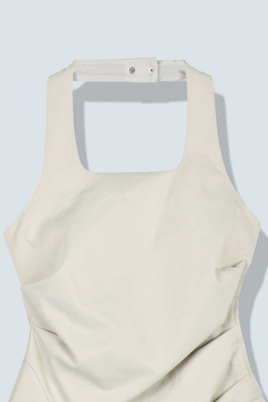 ホルターネックがデコルテから肩まわりをすっきりと見せ、女性らしい華奢な印象を演出します。