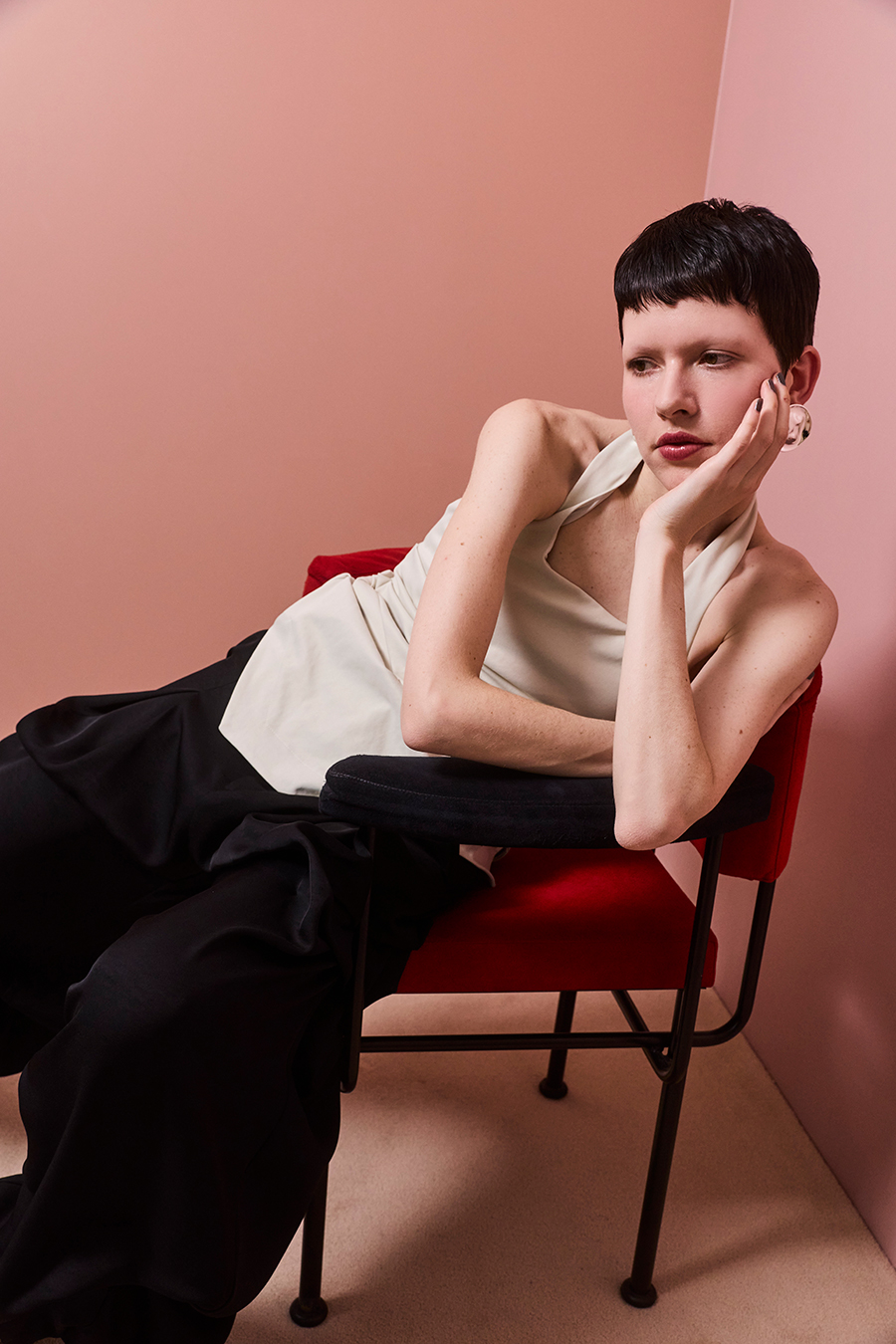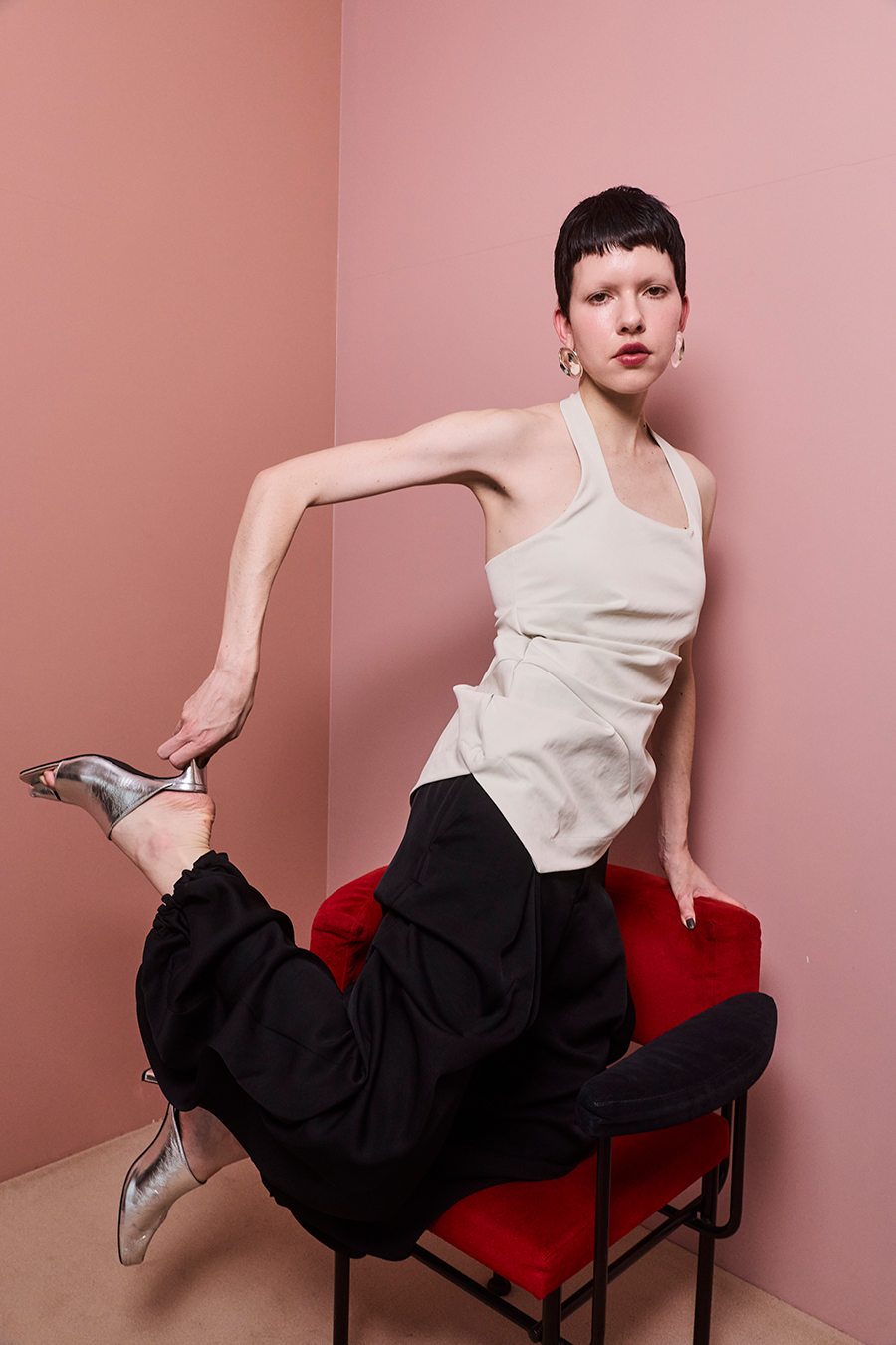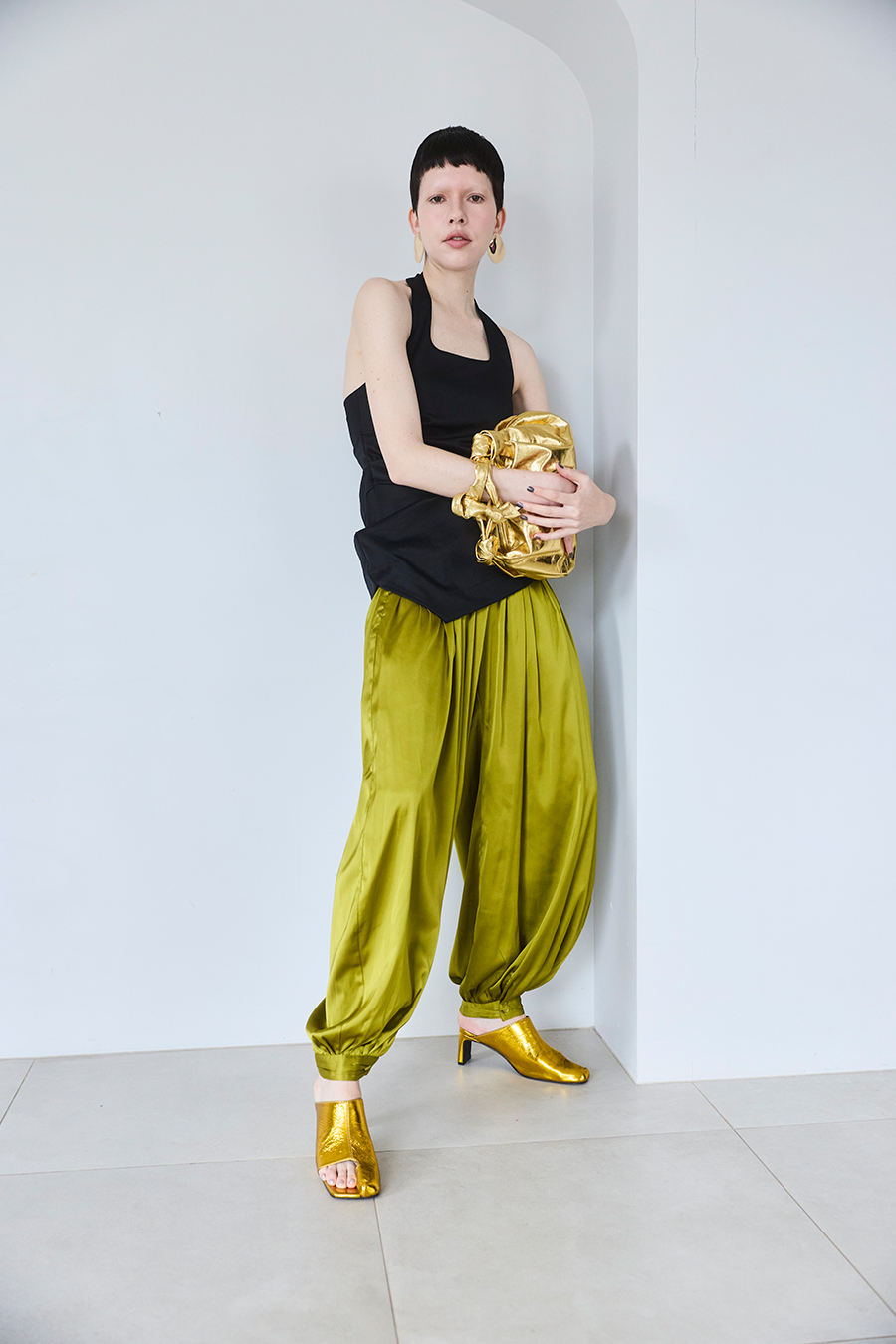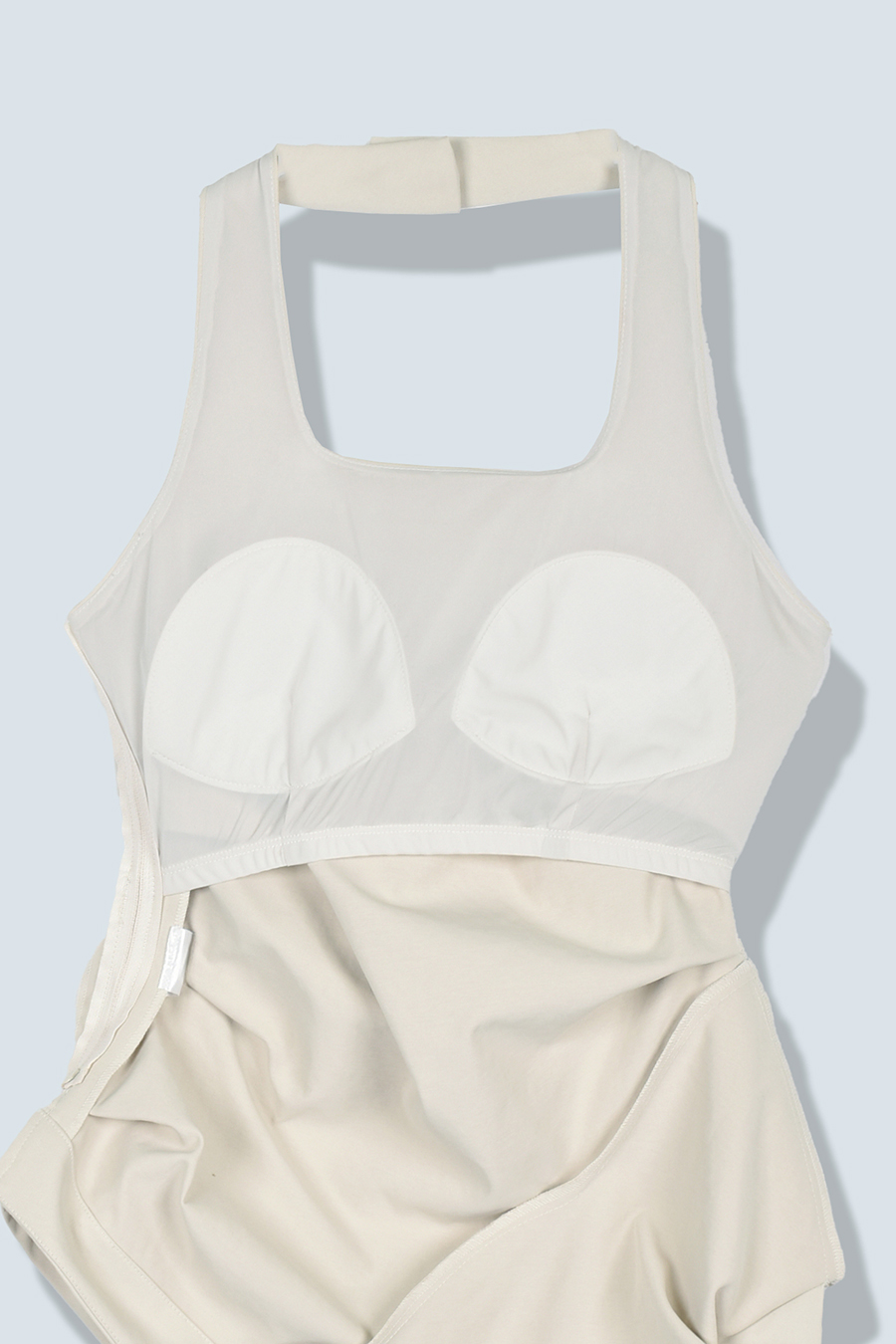 ホルターネックがデコルテから肩まわりをすっきりと見せ、女性らしい華奢な印象を演出します。