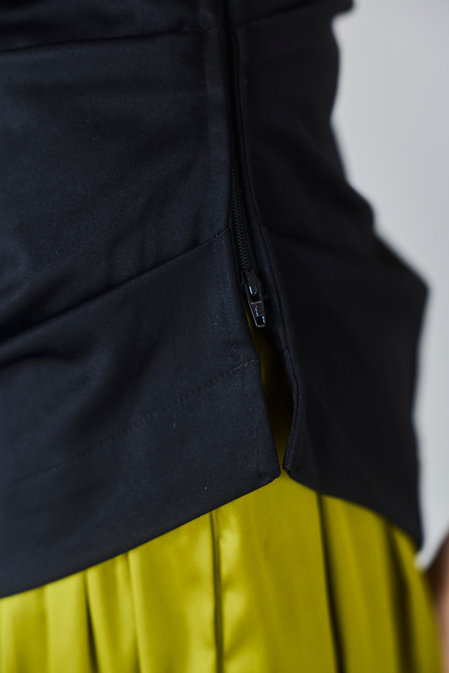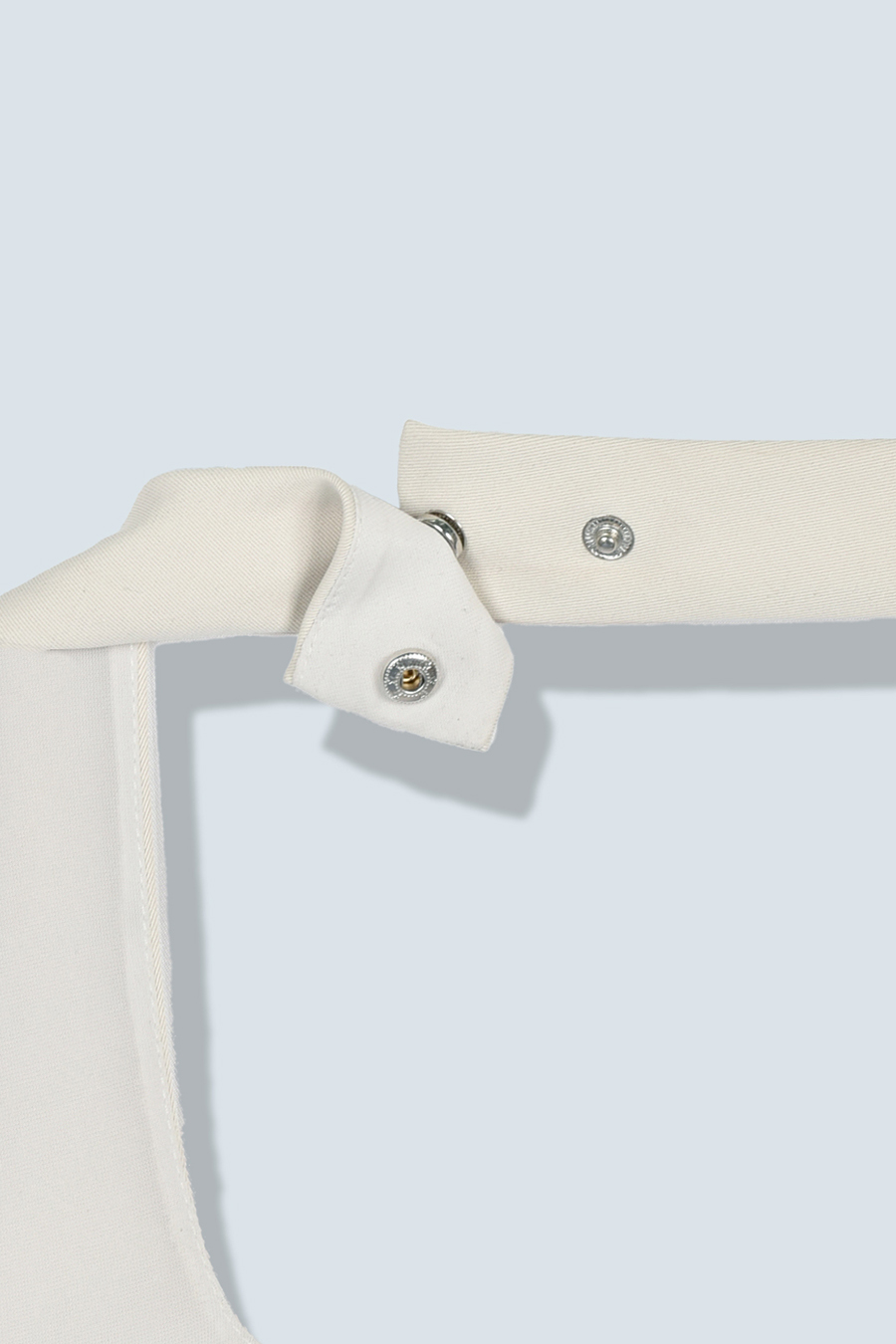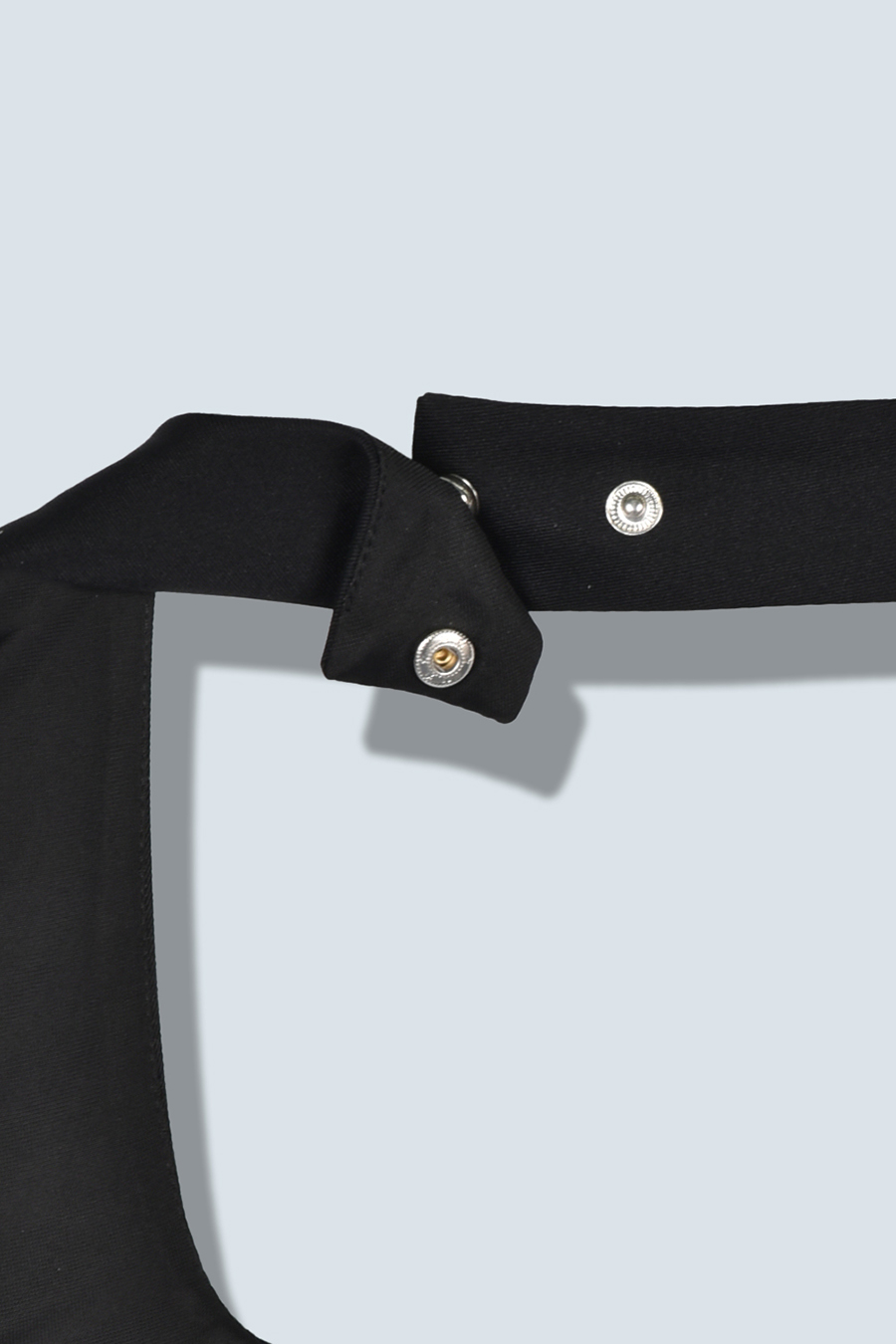 左脇のファスナーでスムーズに着脱でき、首元のストラップは2段階で調節可能なため、お好みのフィット感に設定できます。