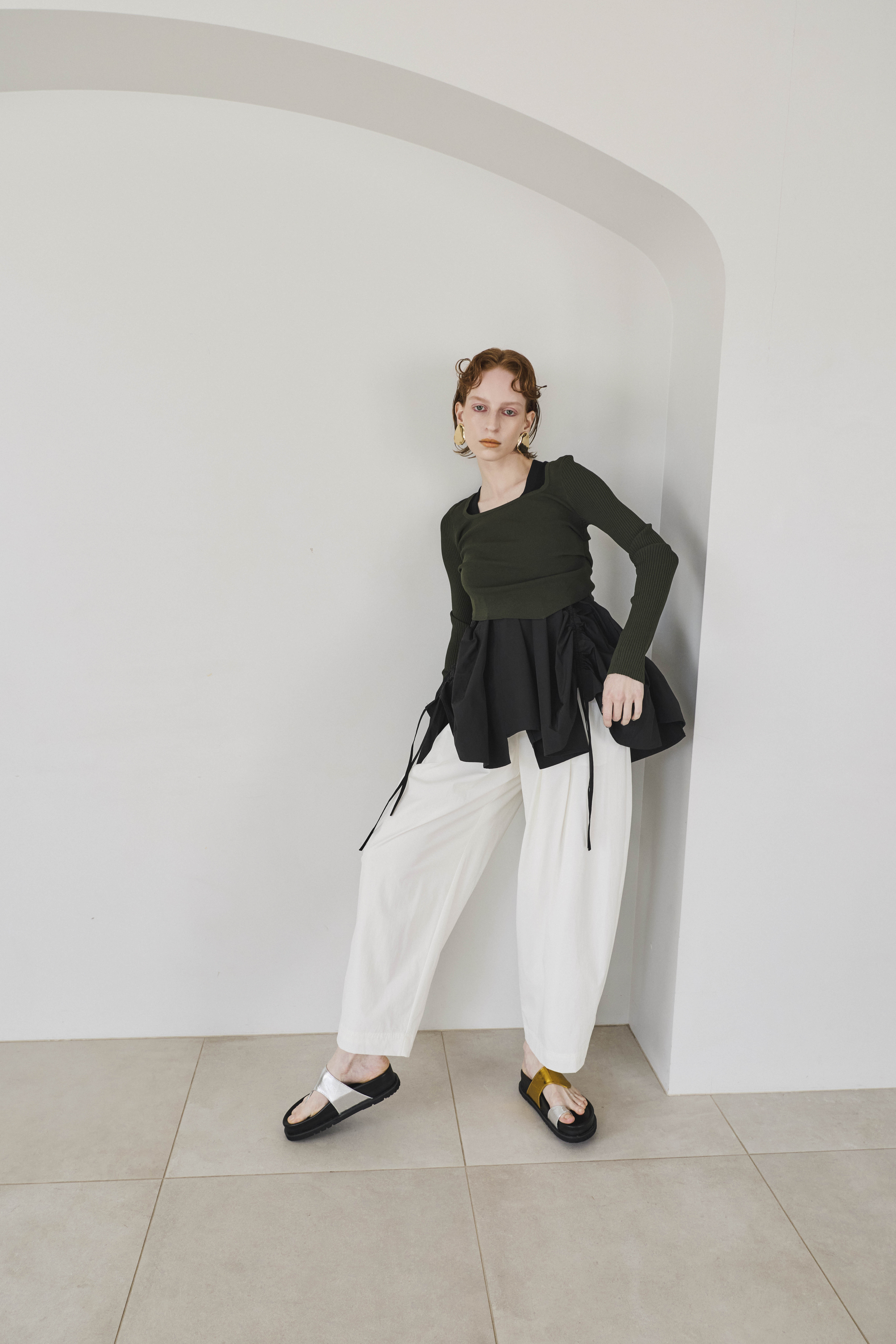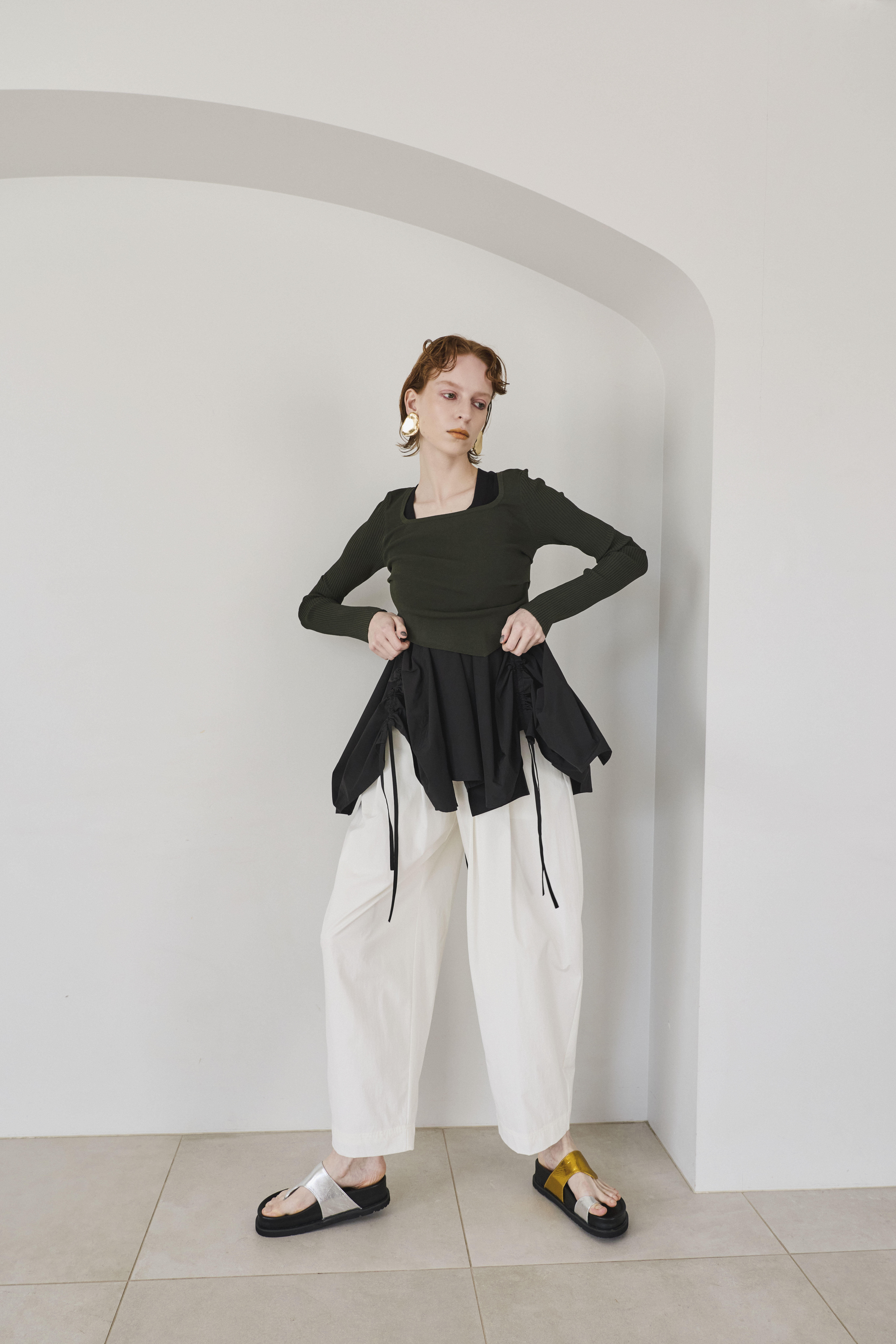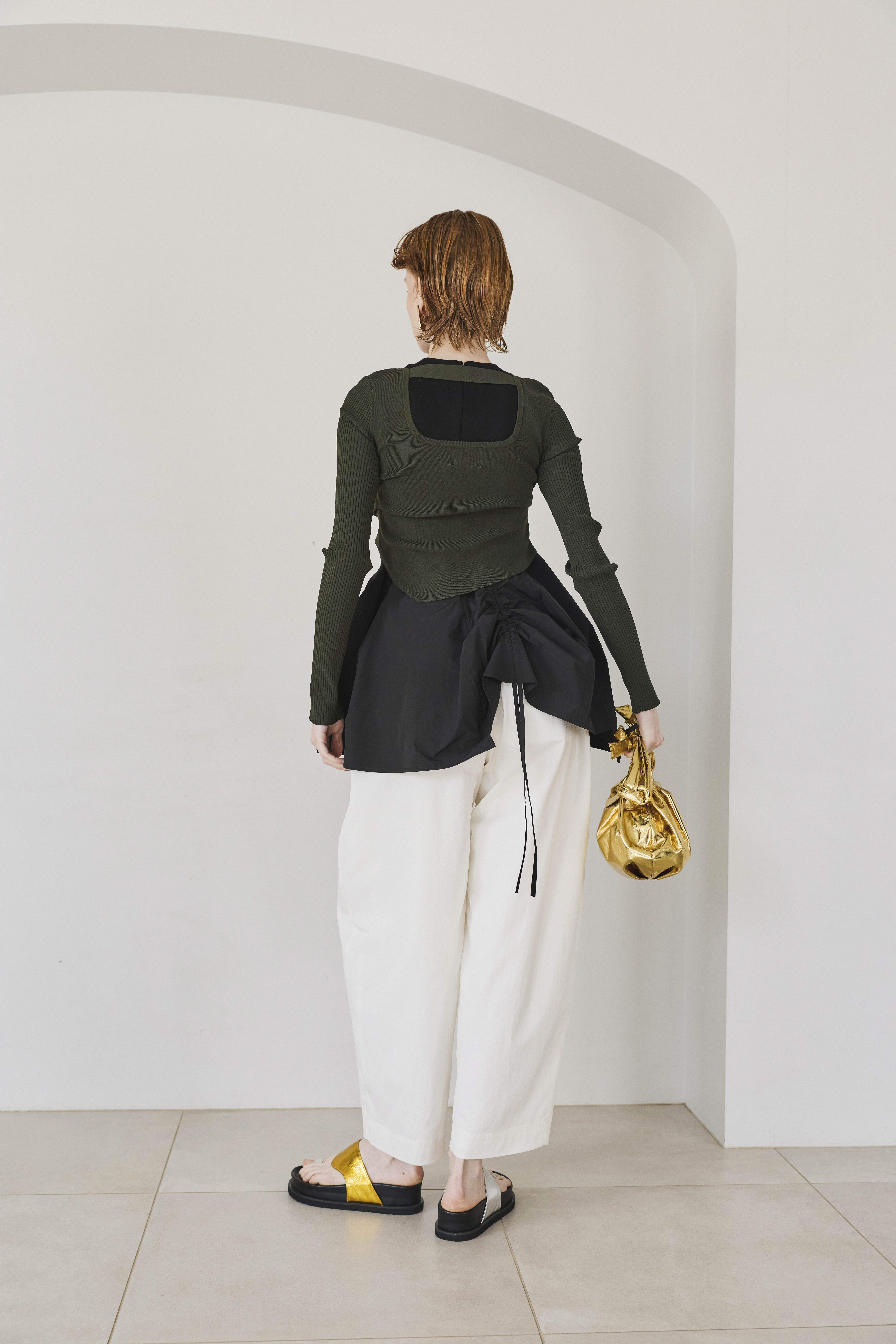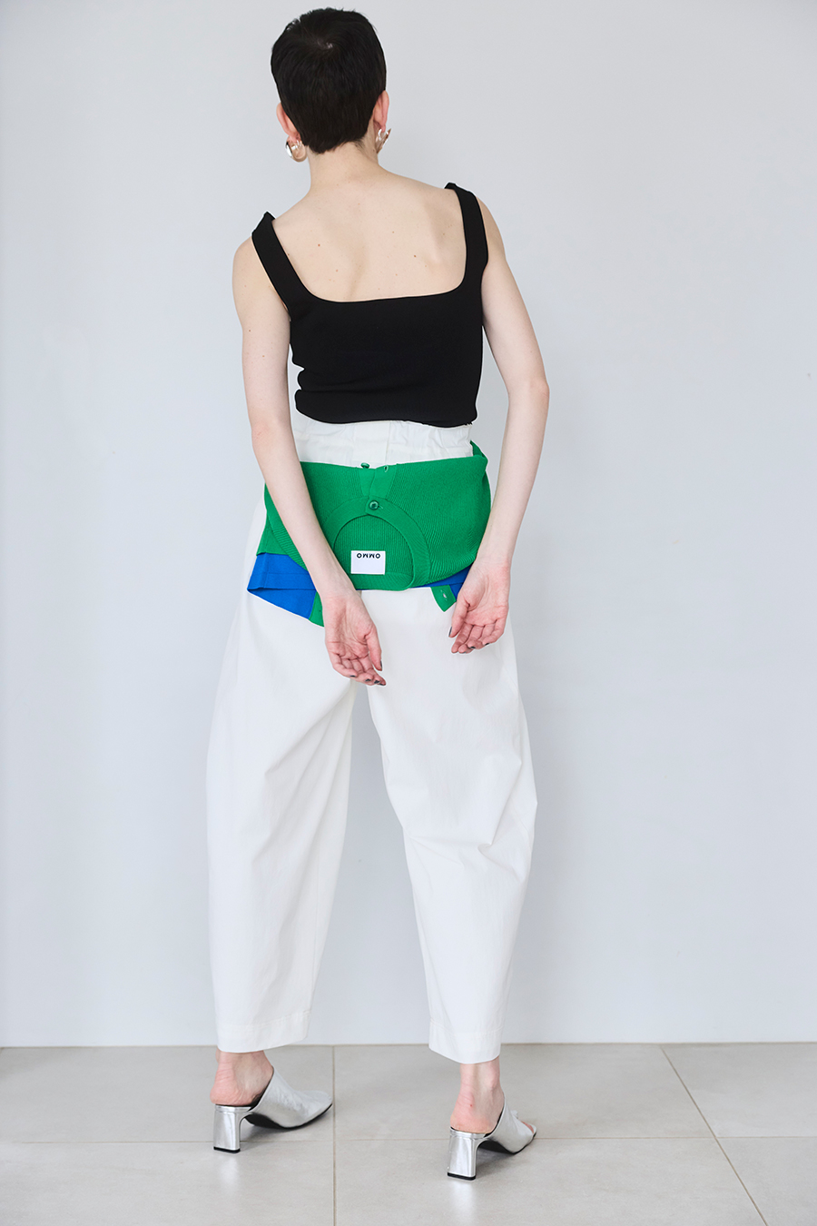 幅広のベルトループが付いているため、カーディガンやシャツを通してウエストにアクセントを加えるスタイリングも可能。