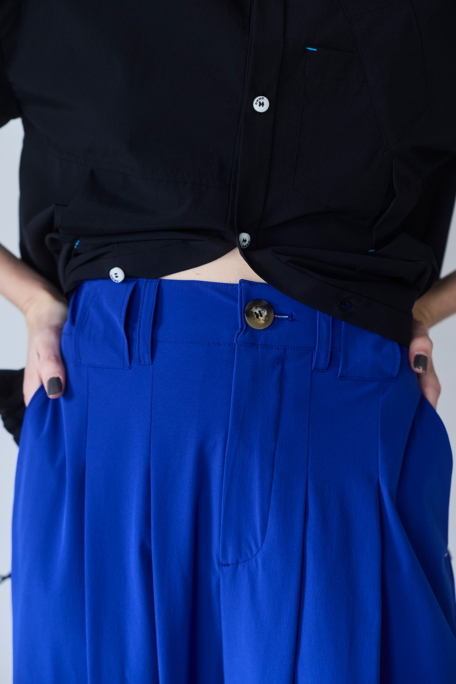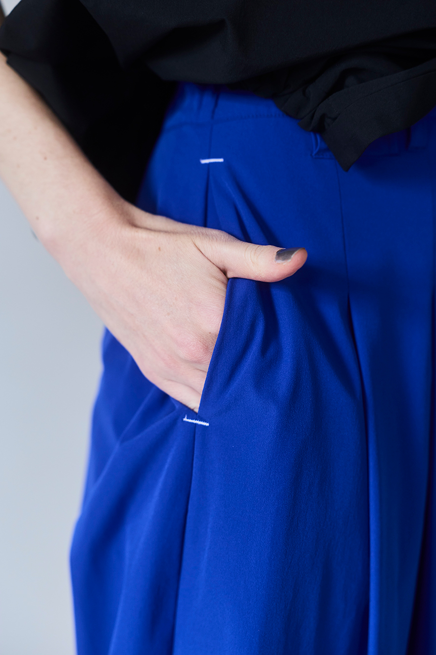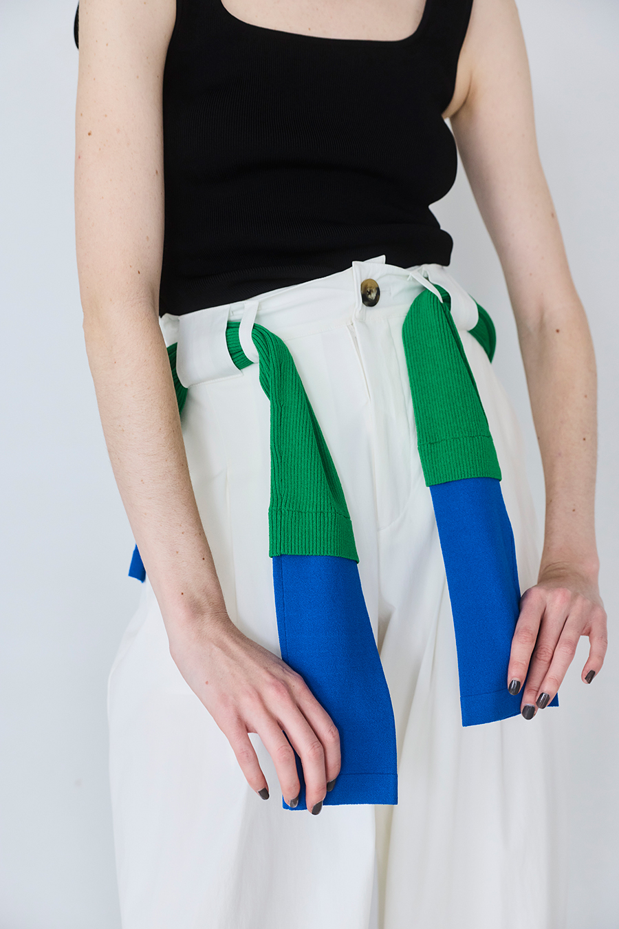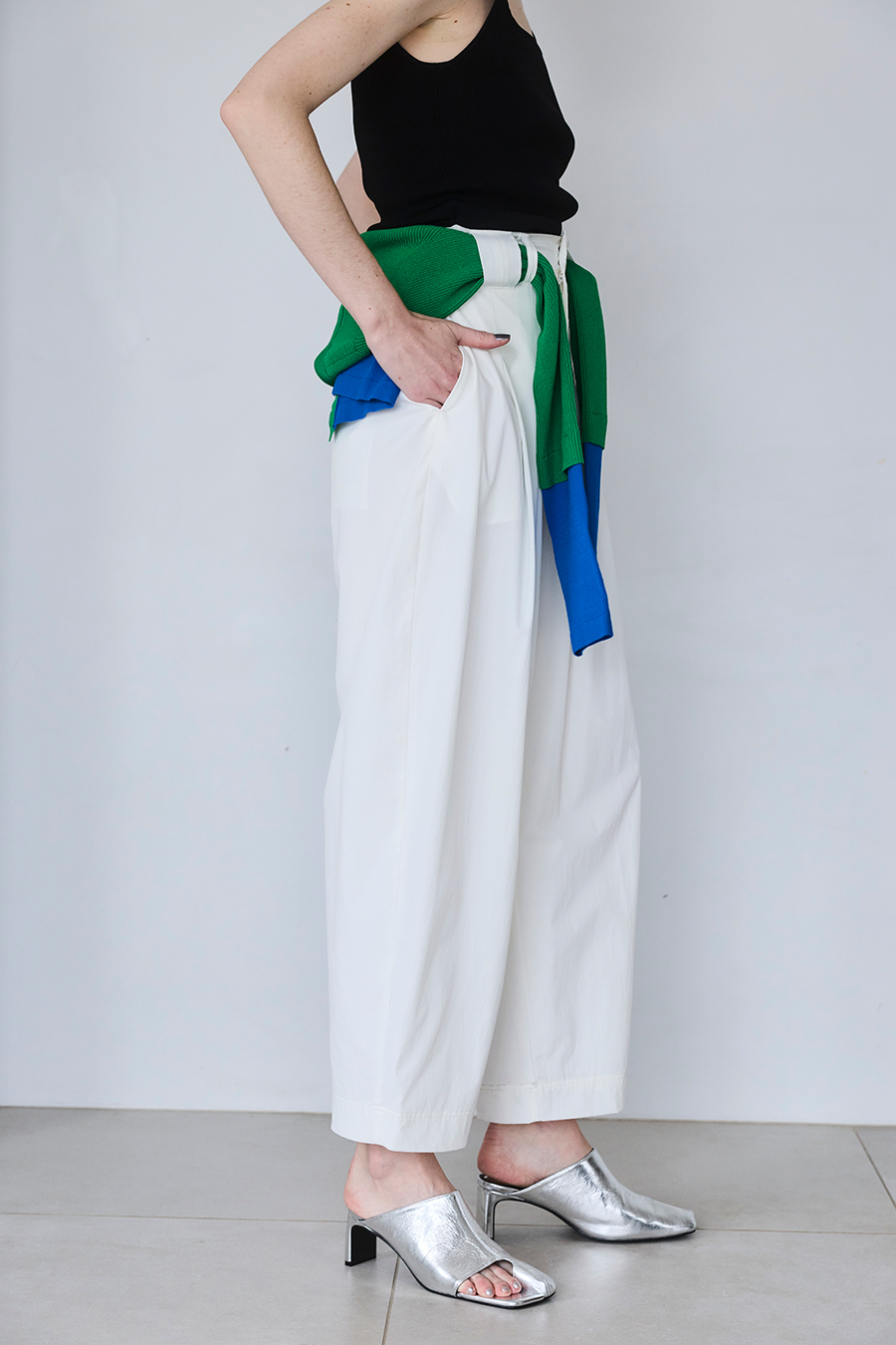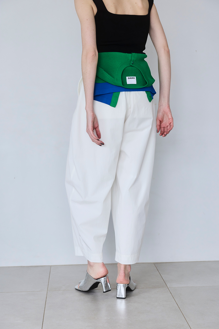 幅広のベルトループが付いているため、カーディガンやシャツを通してウエストにアクセントを加えるスタイリングも可能。