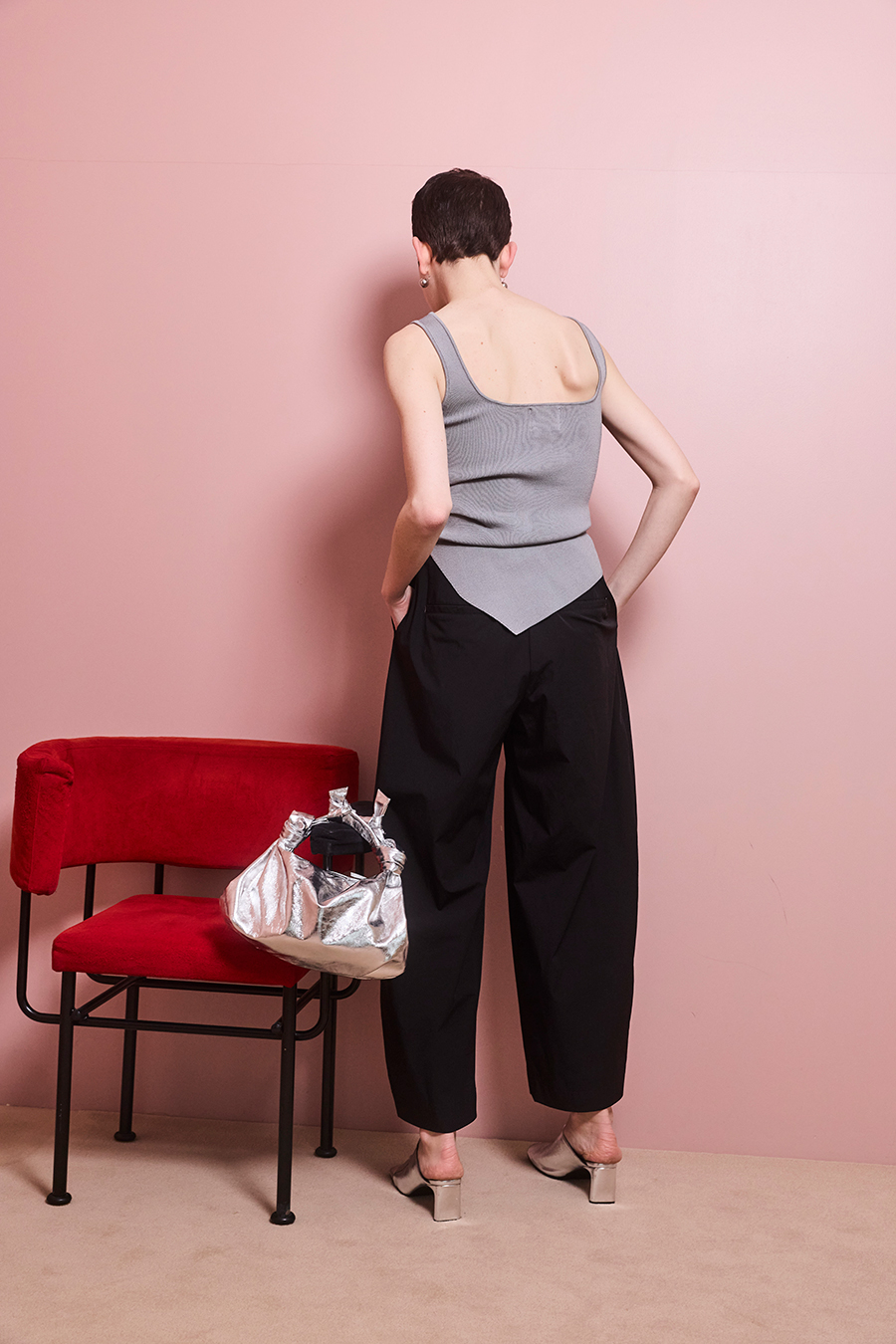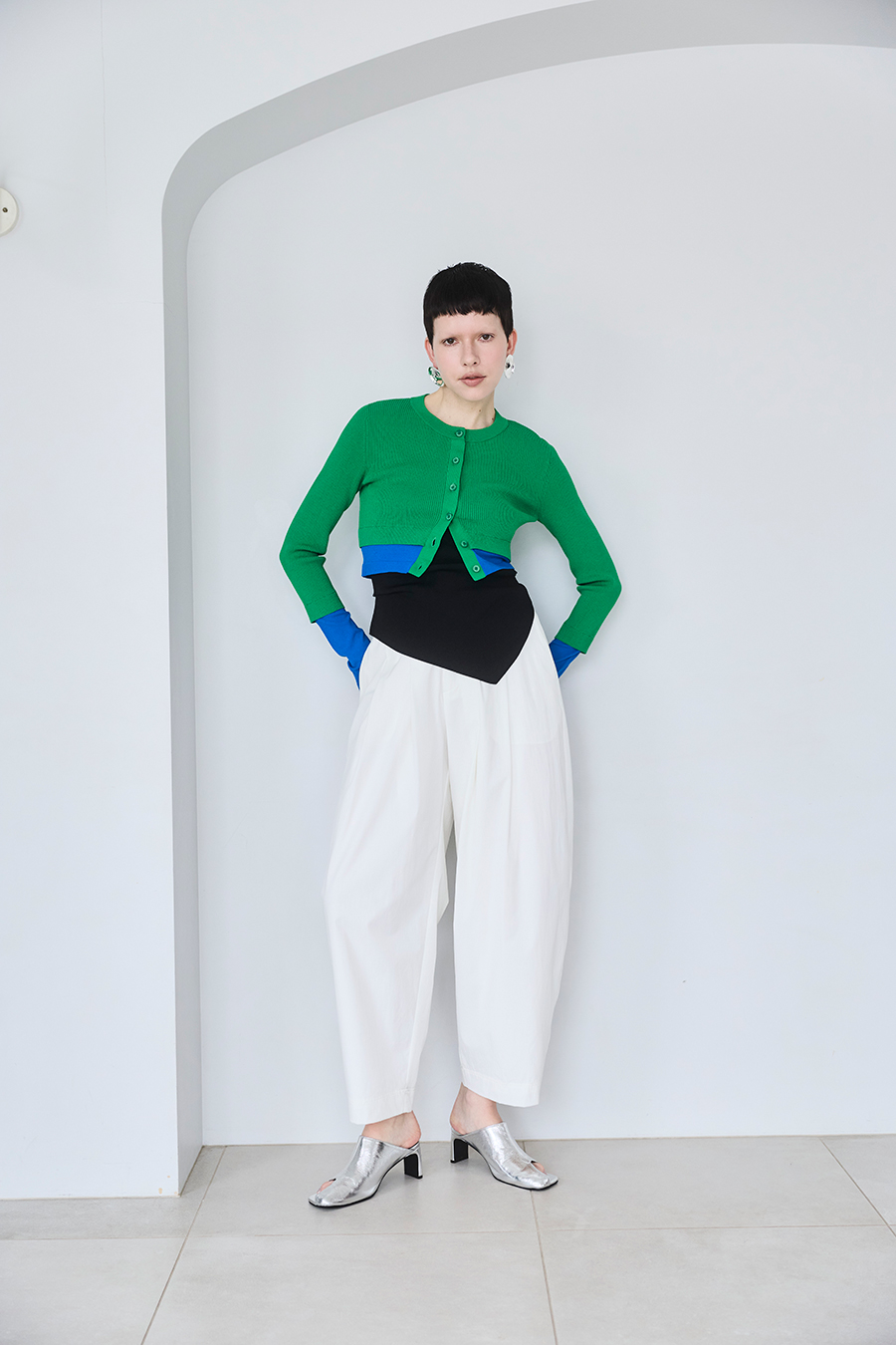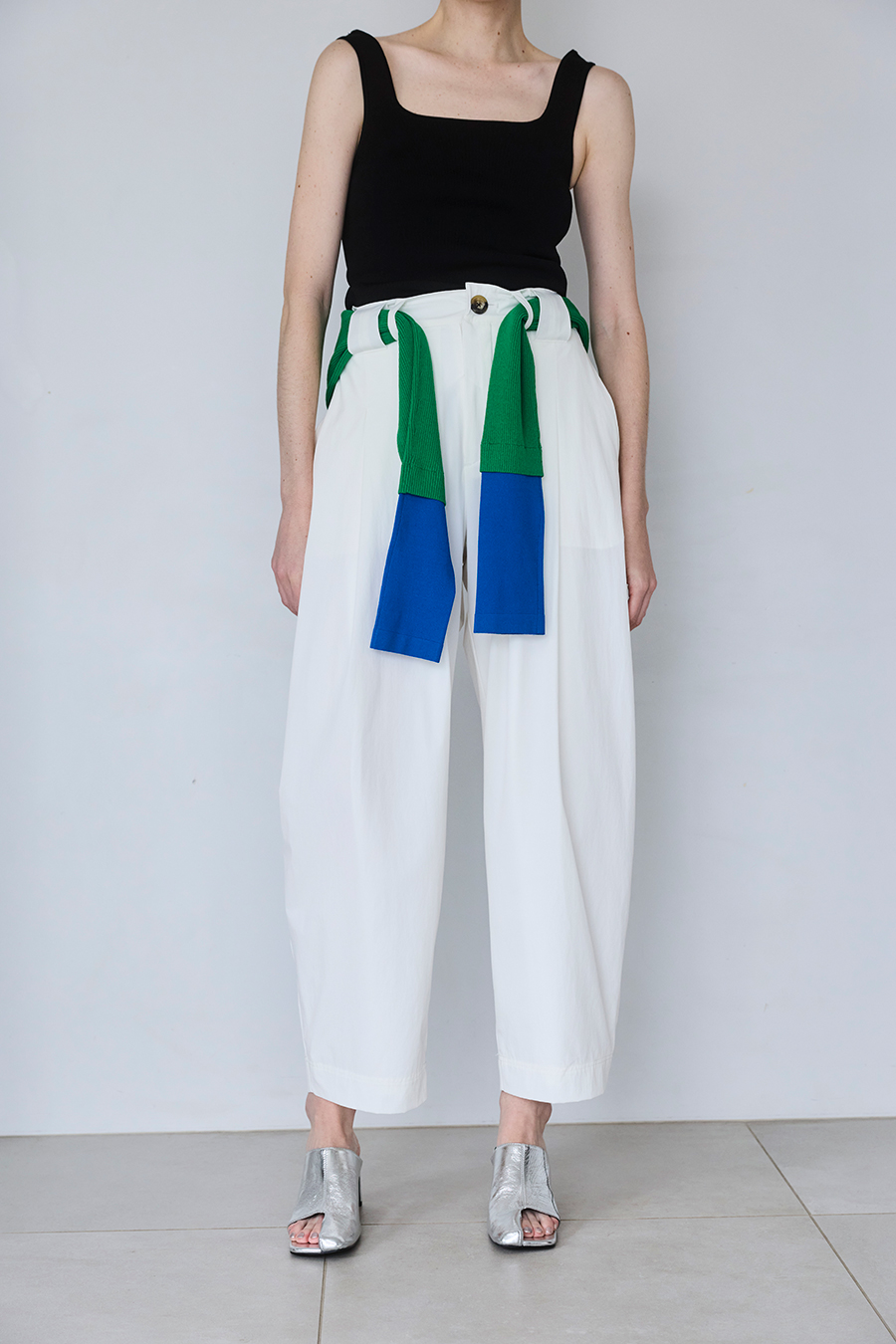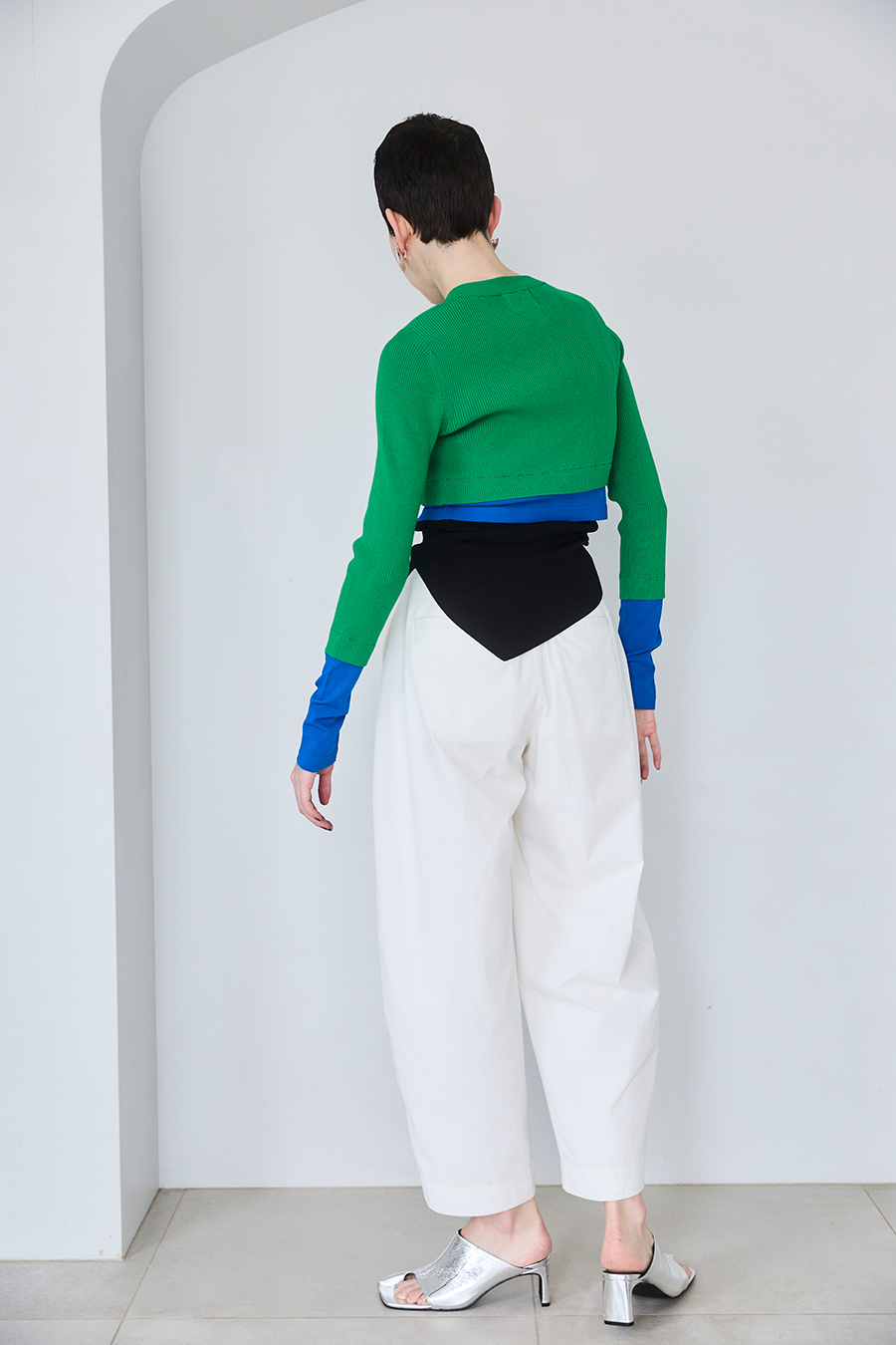 幅広のベルトループが付いているため、カーディガンやシャツを通してウエストにアクセントを加えるスタイリングも可能。