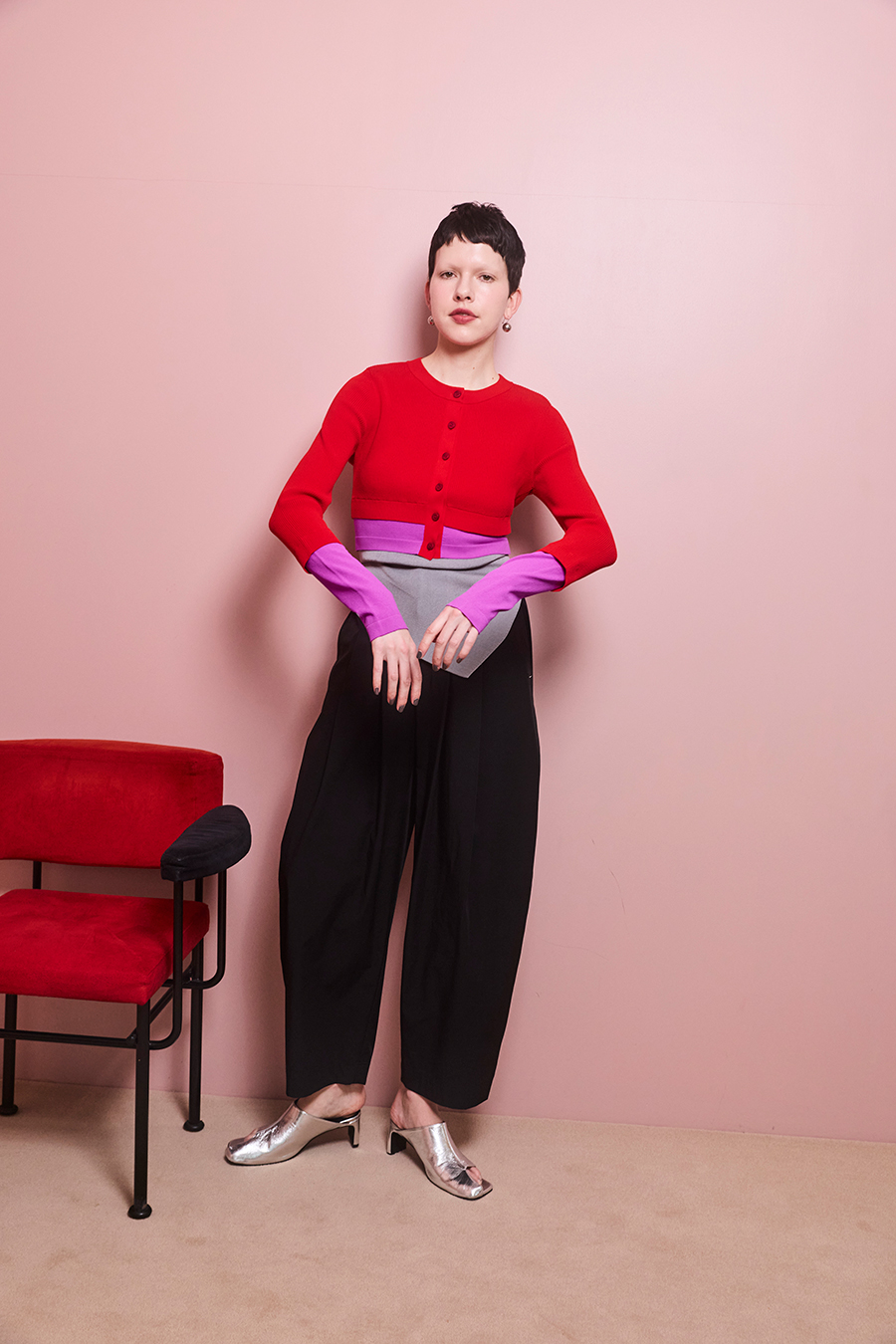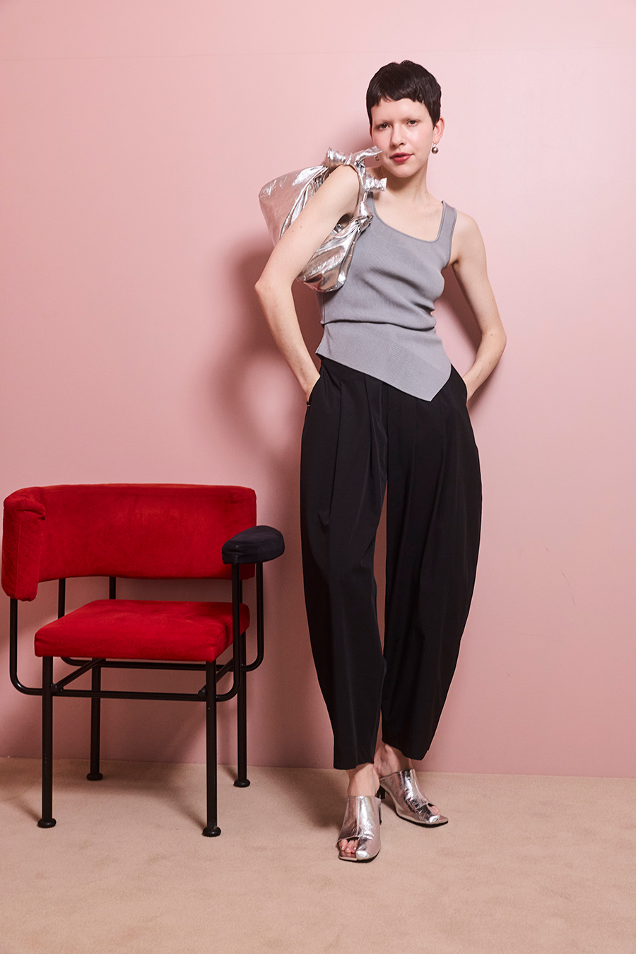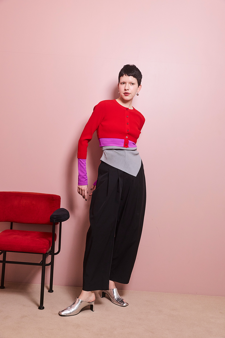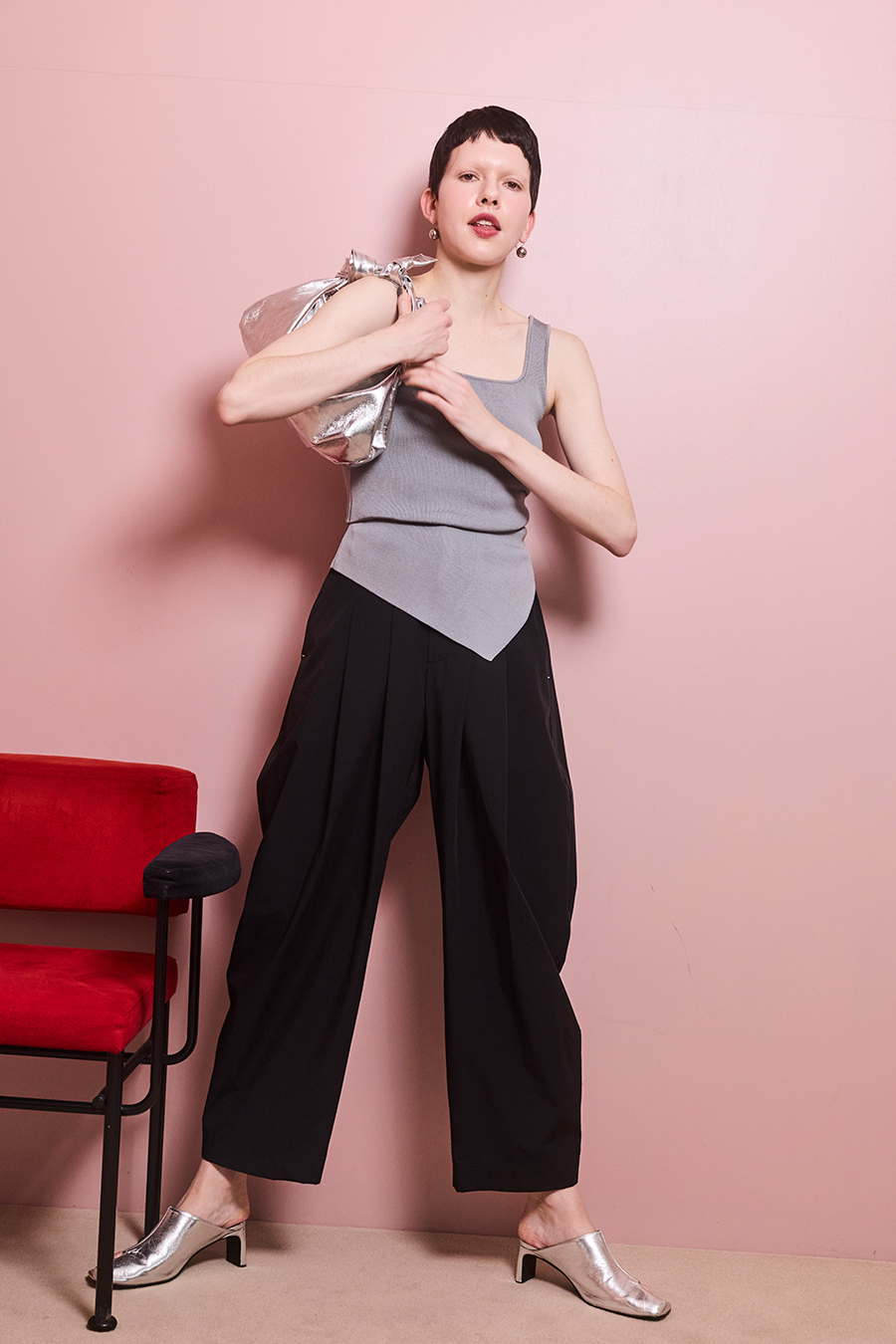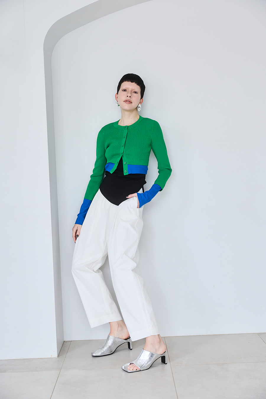 幅広のベルトループが付いているため、カーディガンやシャツを通してウエストにアクセントを加えるスタイリングも可能。