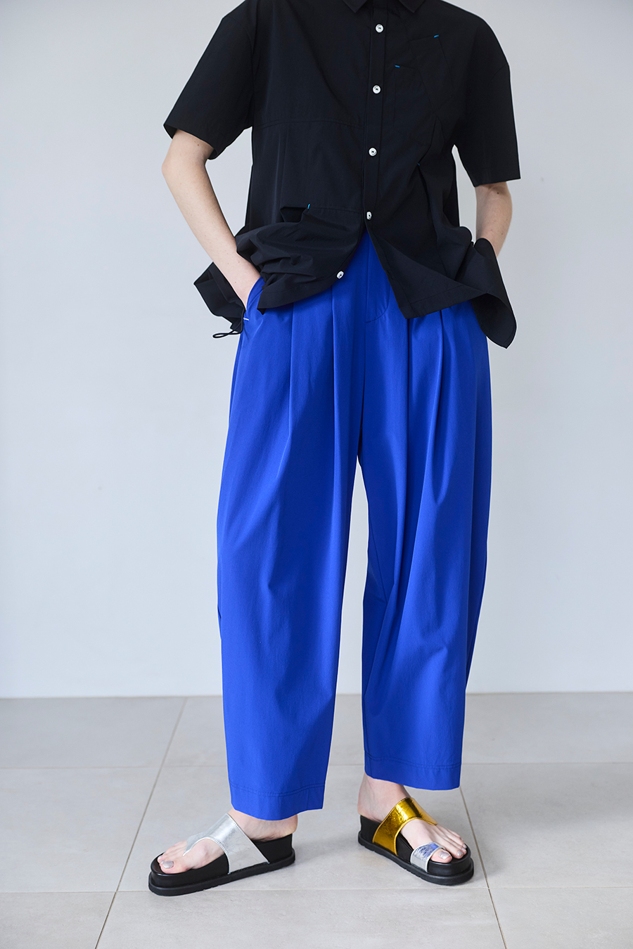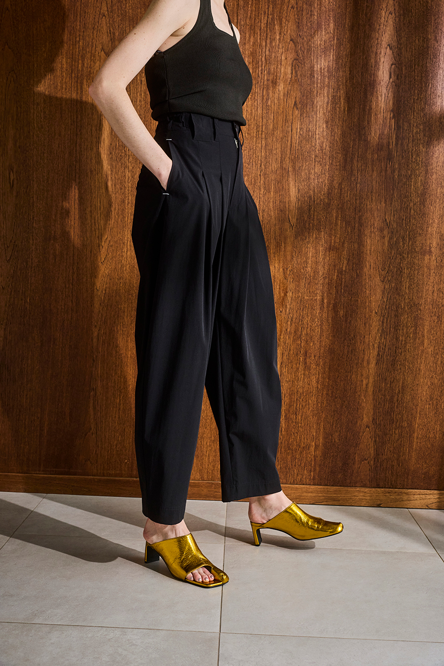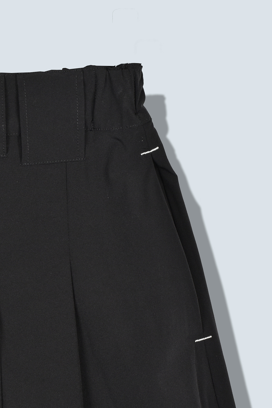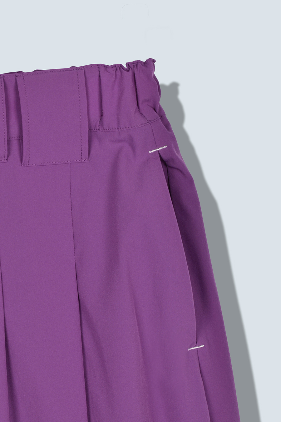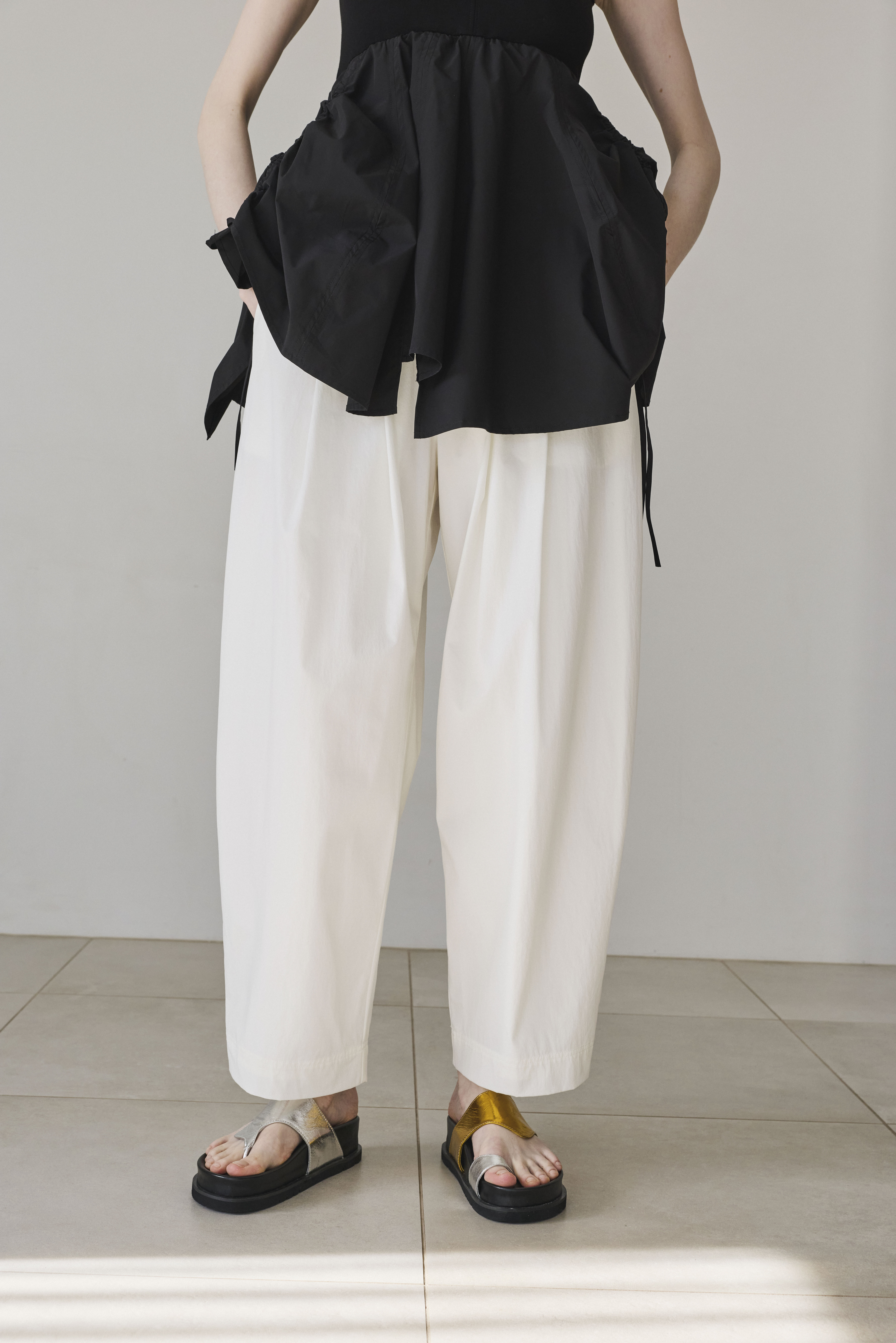 腰まわりにはタックを入れ、気になる部分をさりげなくカバー。