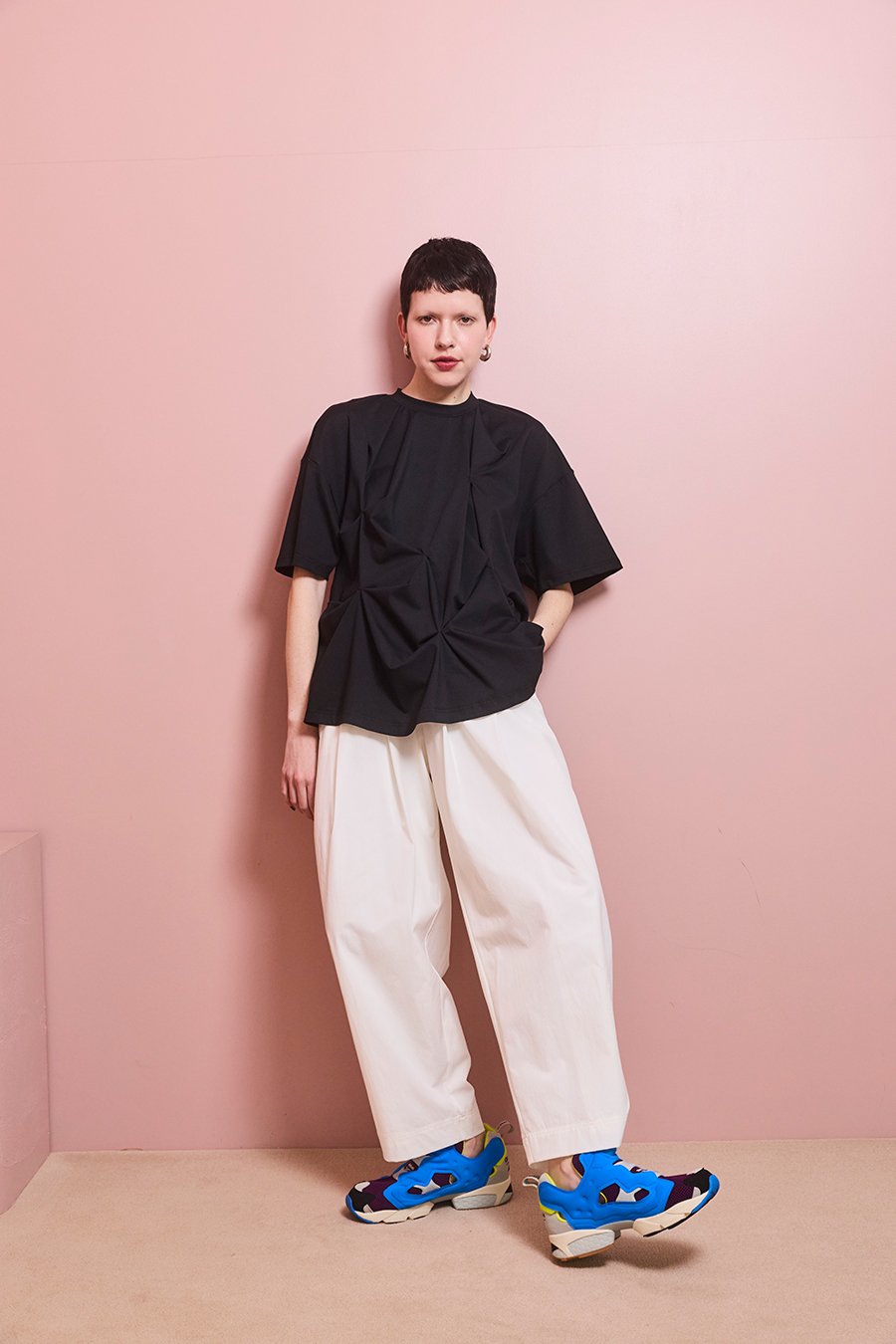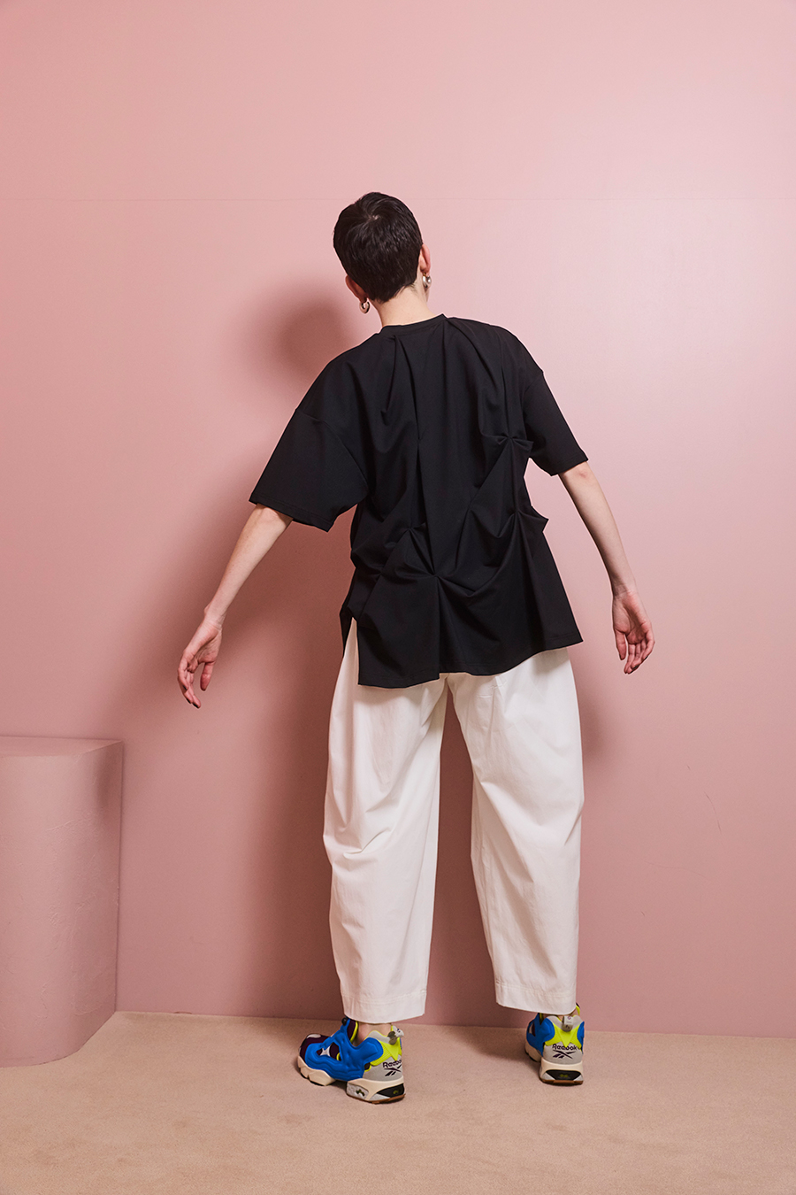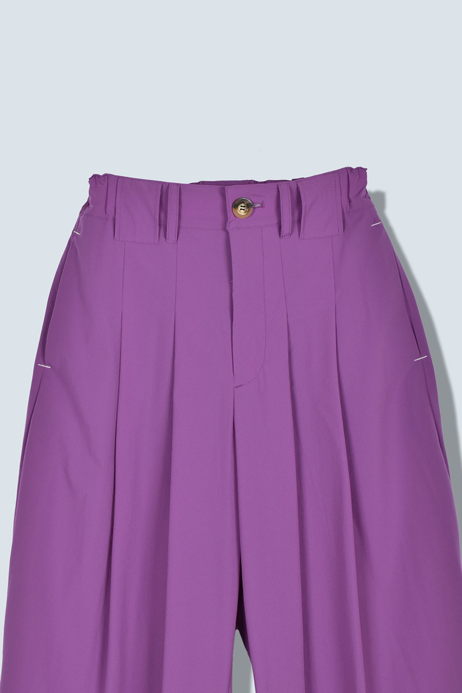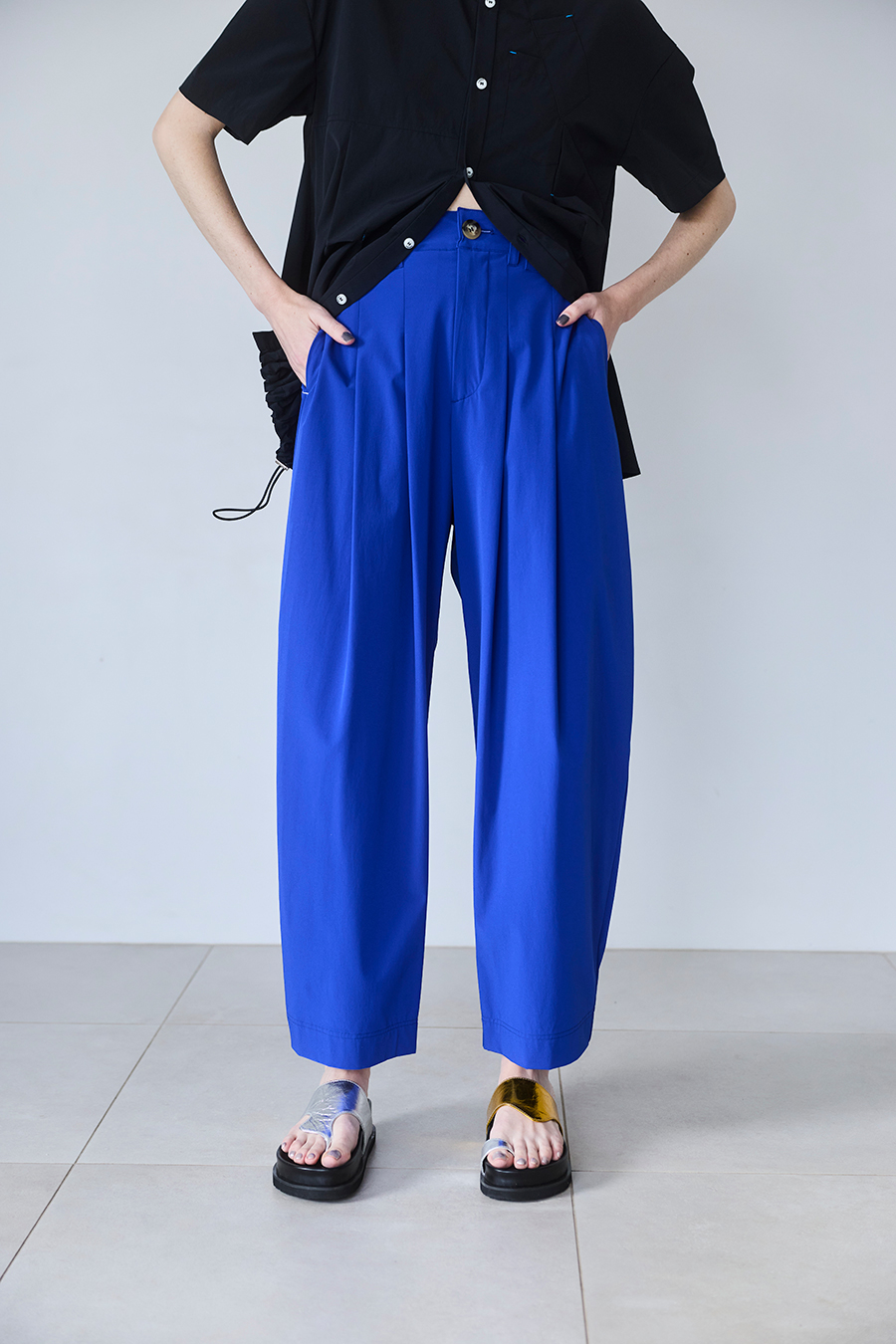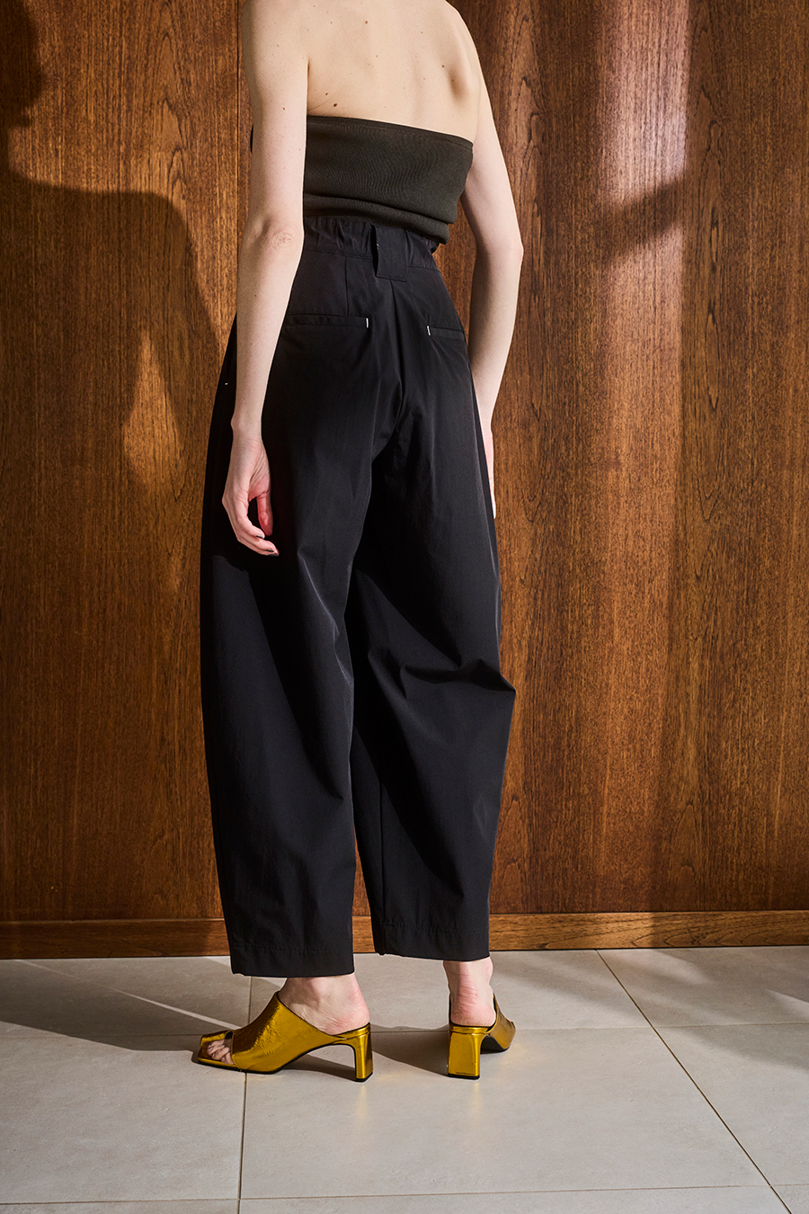 腰まわりにはタックを入れ、気になる部分をさりげなくカバー。