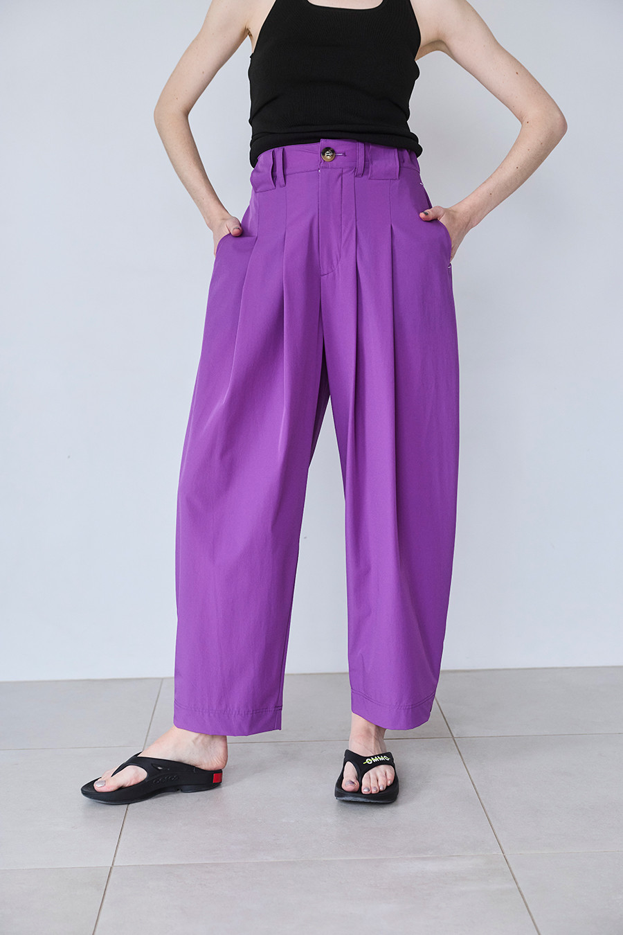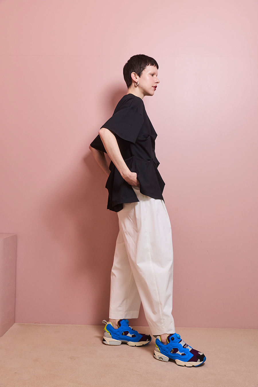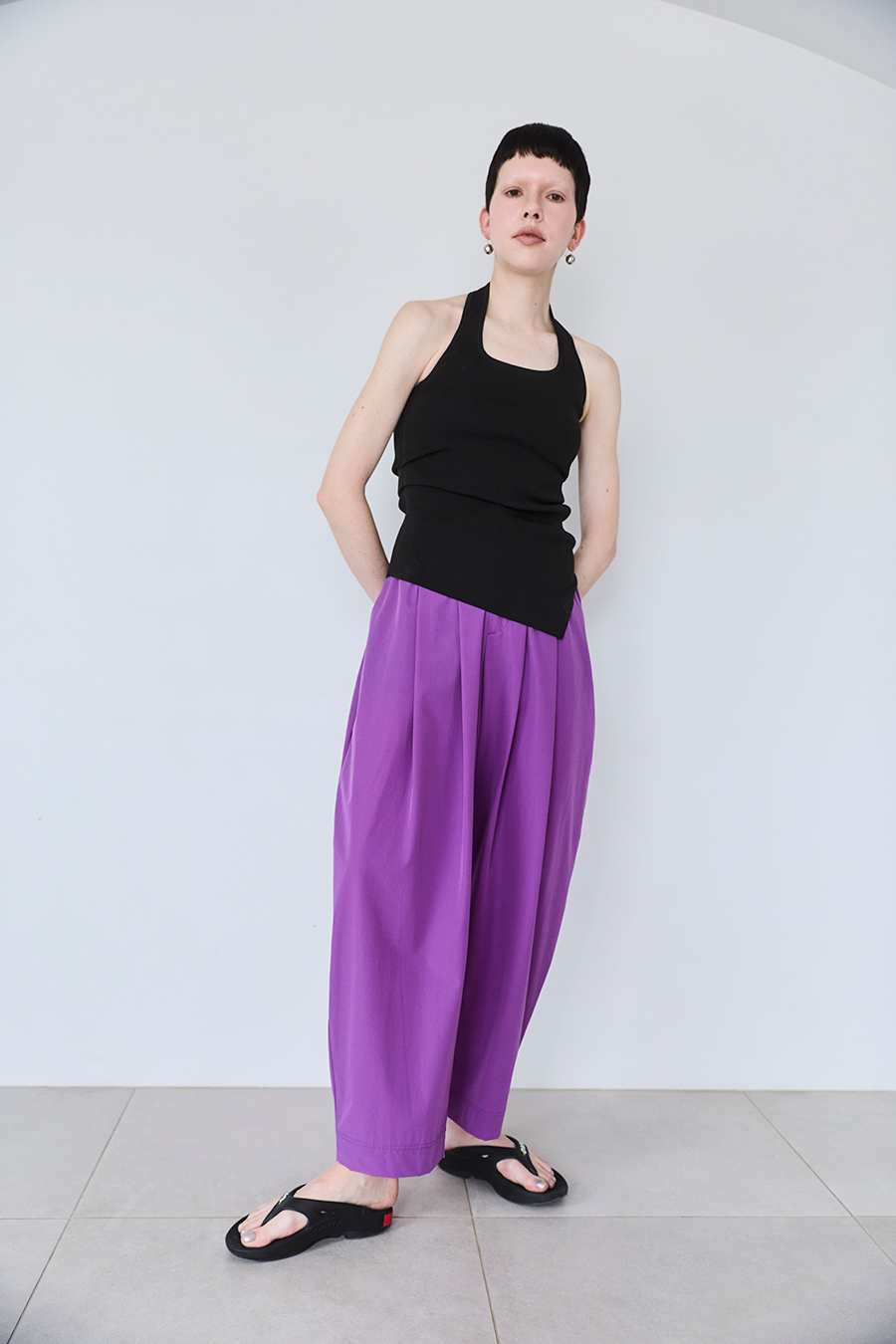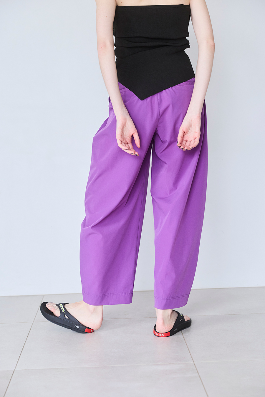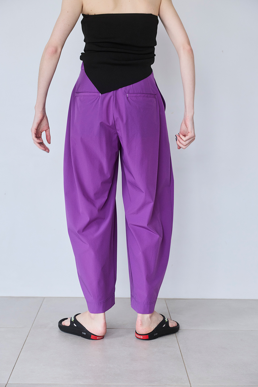 腰まわりにはタックを入れ、気になる部分をさりげなくカバー。