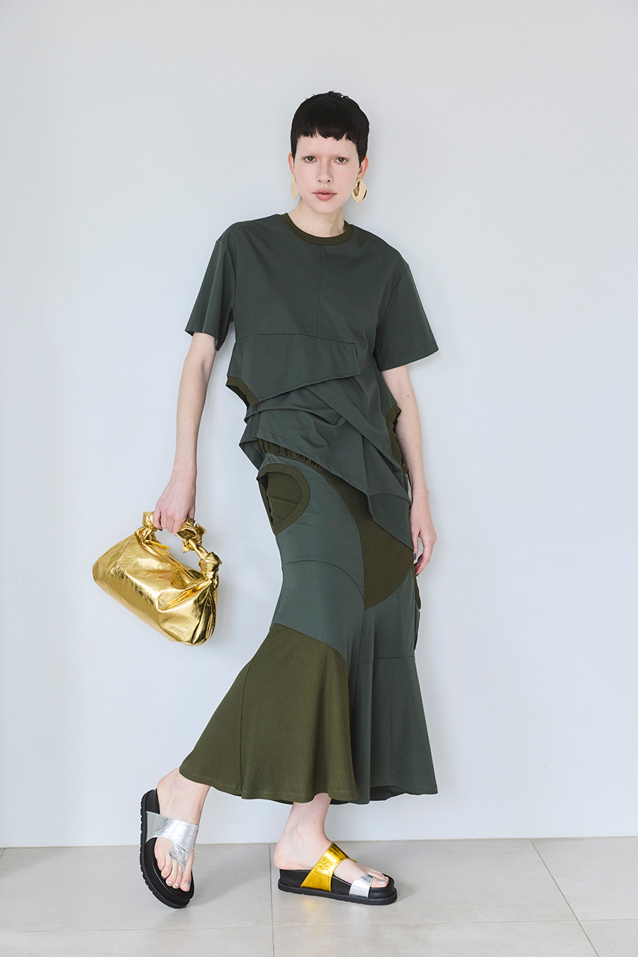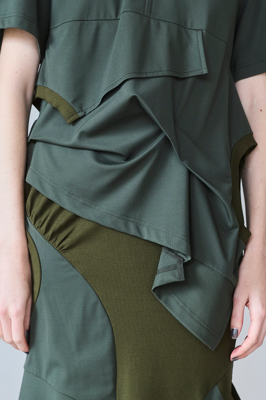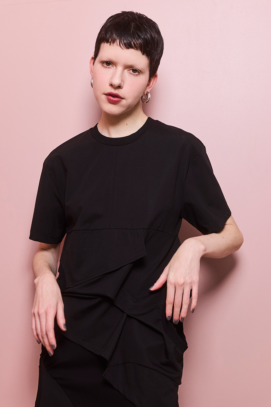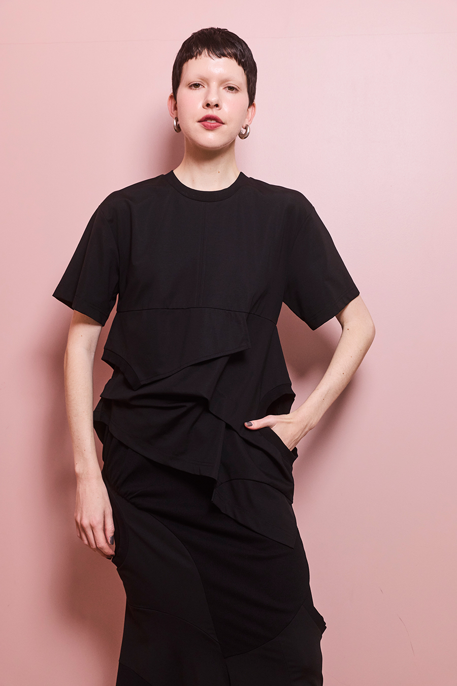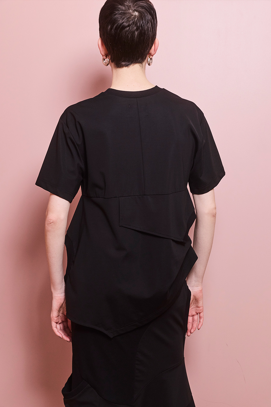 Tシャツを解体して再構築したようなデザインが印象的なトップス。長めの袖丈と胸下の切り替えに配したレイヤードパーツが、気になる部分をさりげなくカバーしてくれます。
